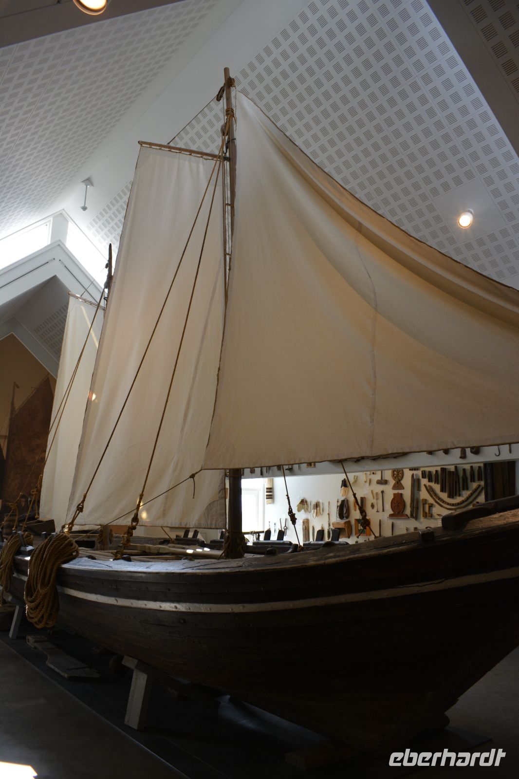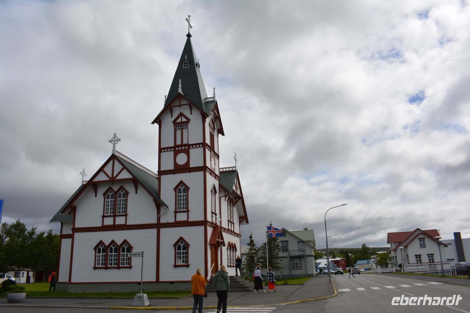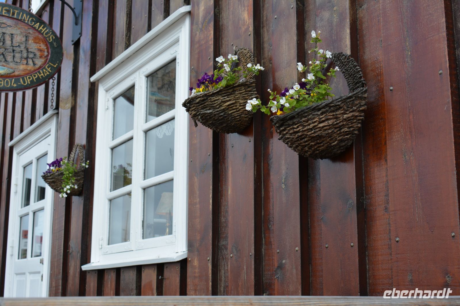 Nach all den landschaftlichen Ereignissen, sehnen wir uns nach etwas Zivilisation und wir machen und auf dem Weg nach Husavik. Man kann hier ins Walmuseum gehen, in den kleinen Cafés etwas essen und trinken und in eines der zahlreichen Souvenirshops stöbern. Hier gibt es oft die besonderen, handgestrickten Islandpullover, für die man oft über 200 Euro bezahlt. Wir bekommen natürlich erklärt, wieso diese so wertvoll sind. Die Haarwurzel des Islandschafs besteht aus vier einzelnen Haaren. Die drei kurzen Haare dienen zum Warmhalten, denn hier wird es nur selten über 15°C warm. Das eine längere Haar ist besonders fettig und von innen hohl, damit sind die Schafe bei Regen nicht nass werden. Außerdem ermöglicht es den Tieren zu schwimmen. Aktuell gibt es noch rund 400.000 Schafe auf Island, Tendenz sinkend. Für die Bauern lohnt sich die Zucht nicht mehr, da sie für das Fleisch immer weniger Geld bekommen.