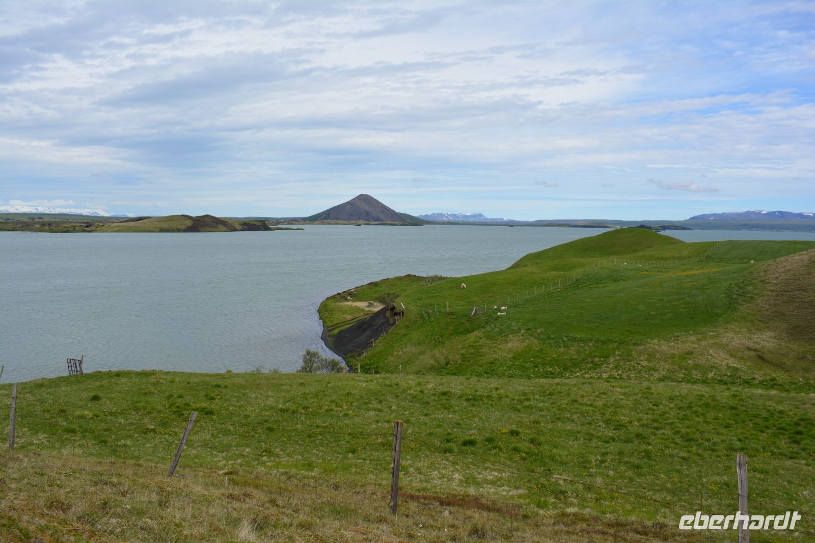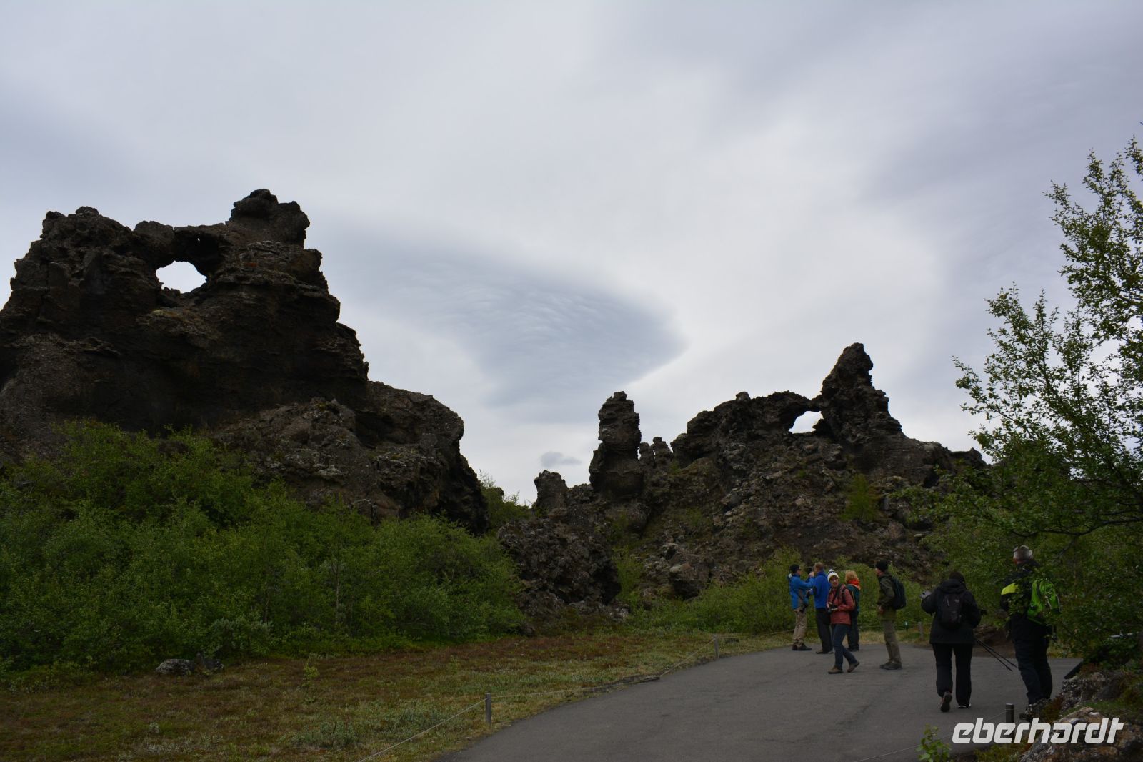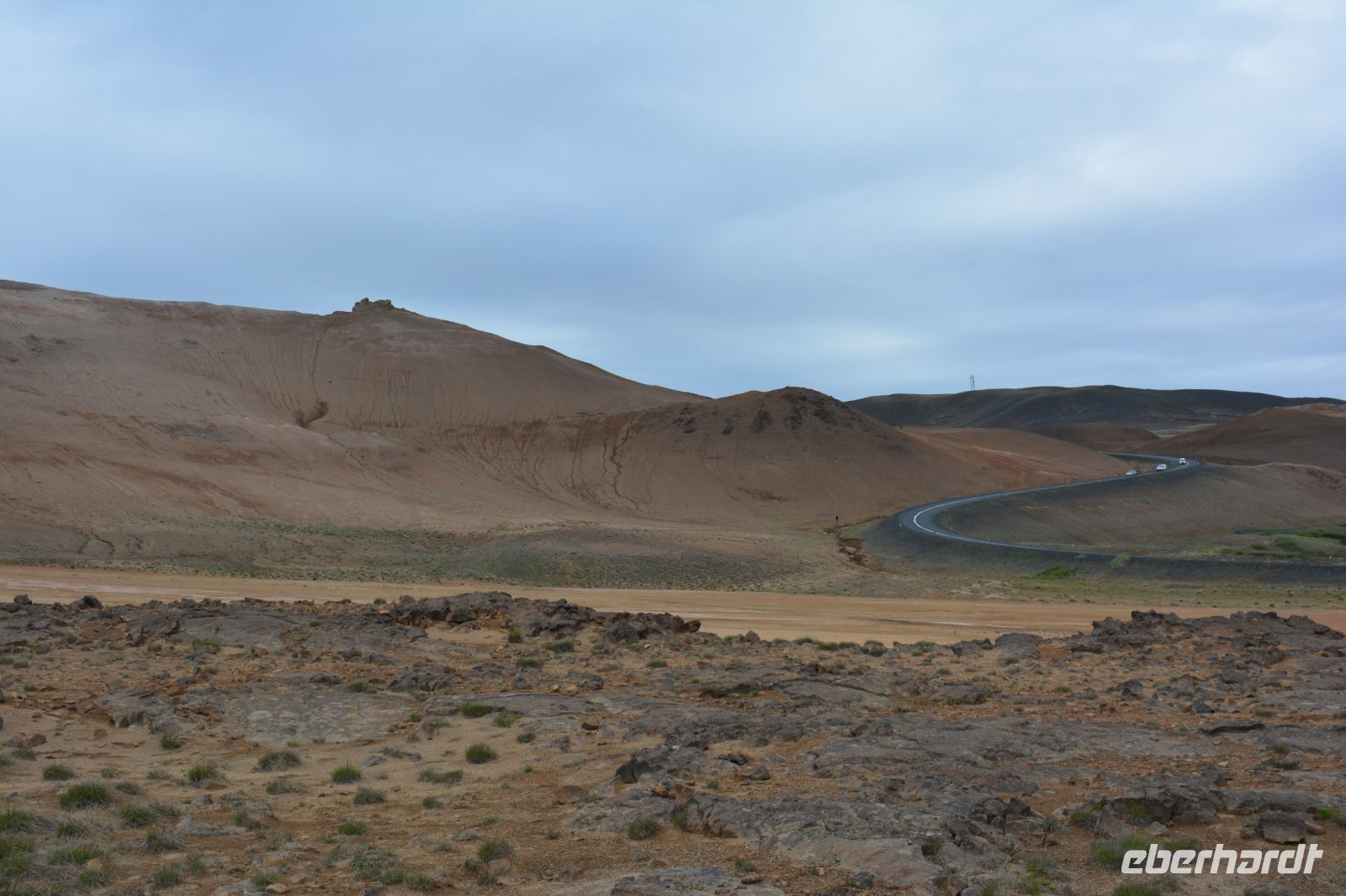 Zuerst fahren wir die gleiche Strecke wie gestern, bis wir am Myvatn ankommen. Ein Stopp für viele Islandtouristen, obwohl die Übersetzung „Mückensee“ bedeutet. Es wird empfohlen, soviel vom Körper zu bedecken wir möglich. Besonders das Gesicht, denn diese Fliegen, die keine Mücken sind und auch nicht stechen, kennen keinen Halt. Doch das Glück ist auf unserer Seite und es weht ein leichter Wind, welcher den Fliegen gar nicht gefällt und uns in Ruhe lassen.