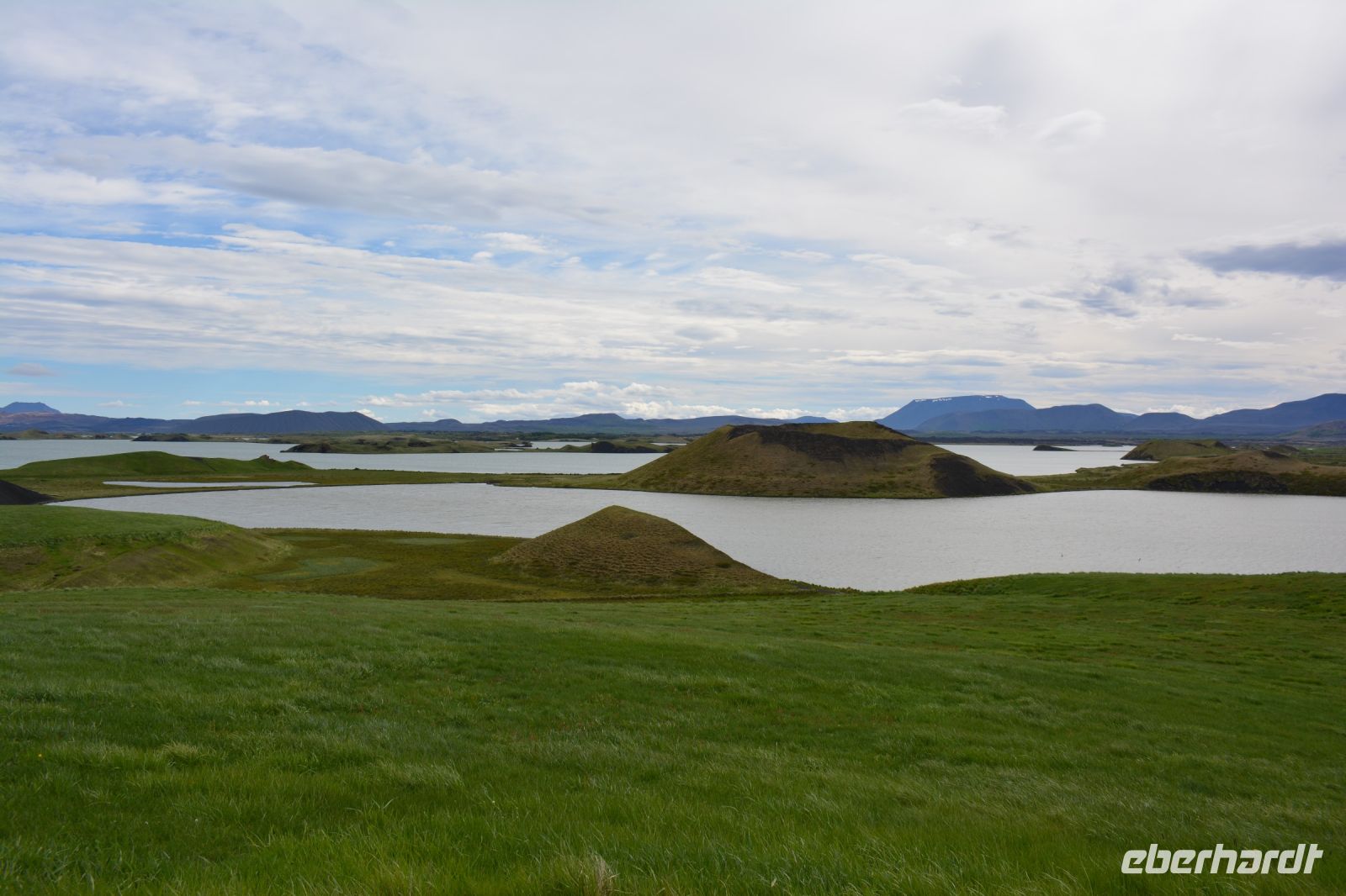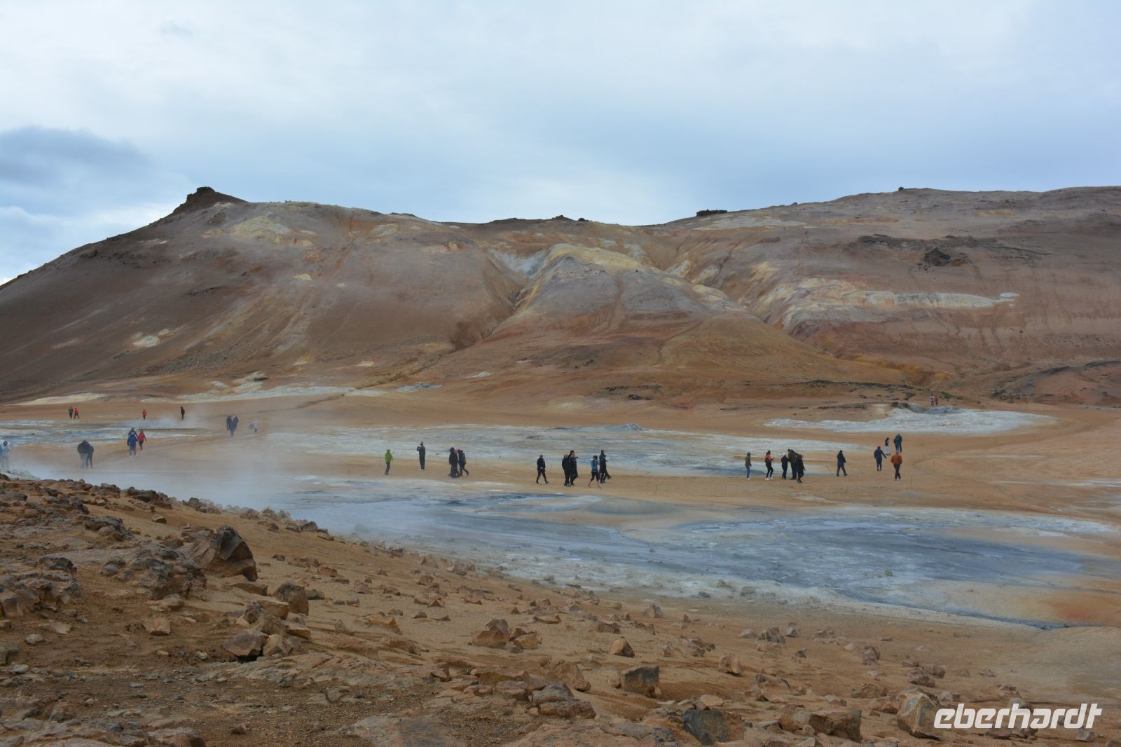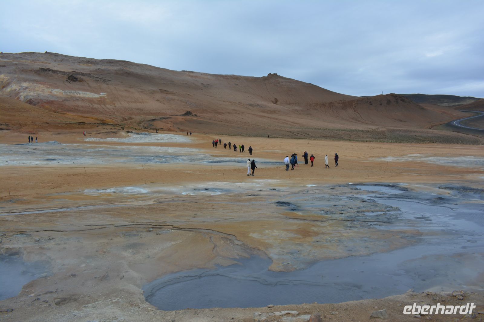 Zuerst fahren wir die gleiche Strecke wie gestern, bis wir am Myvatn ankommen. Ein Stopp für viele Islandtouristen, obwohl die Übersetzung „Mückensee“ bedeutet. Es wird empfohlen, soviel vom Körper zu bedecken wir möglich. Besonders das Gesicht, denn diese Fliegen, die keine Mücken sind und auch nicht stechen, kennen keinen Halt. Doch das Glück ist auf unserer Seite und es weht ein leichter Wind, welcher den Fliegen gar nicht gefällt und uns in Ruhe lassen.