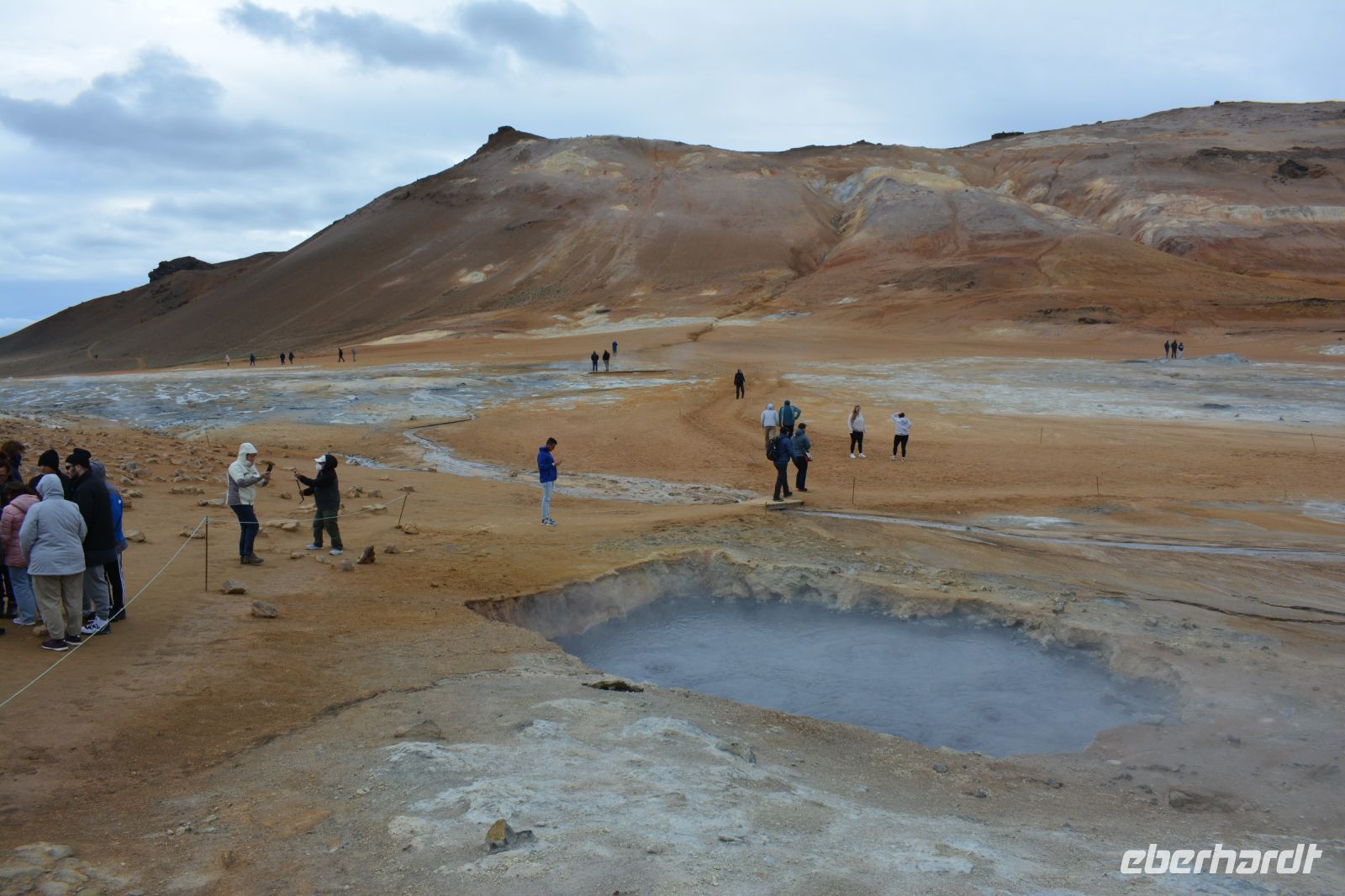 Wenige Meter vom Bad entfernt, gibt es Schwefelfelder, die wir besichtigen können. Doch es weht ein starker Wind und viele andere Busse halten hier ebenfalls gerade hier, vom Geruch fangen wir gar nicht erst an.