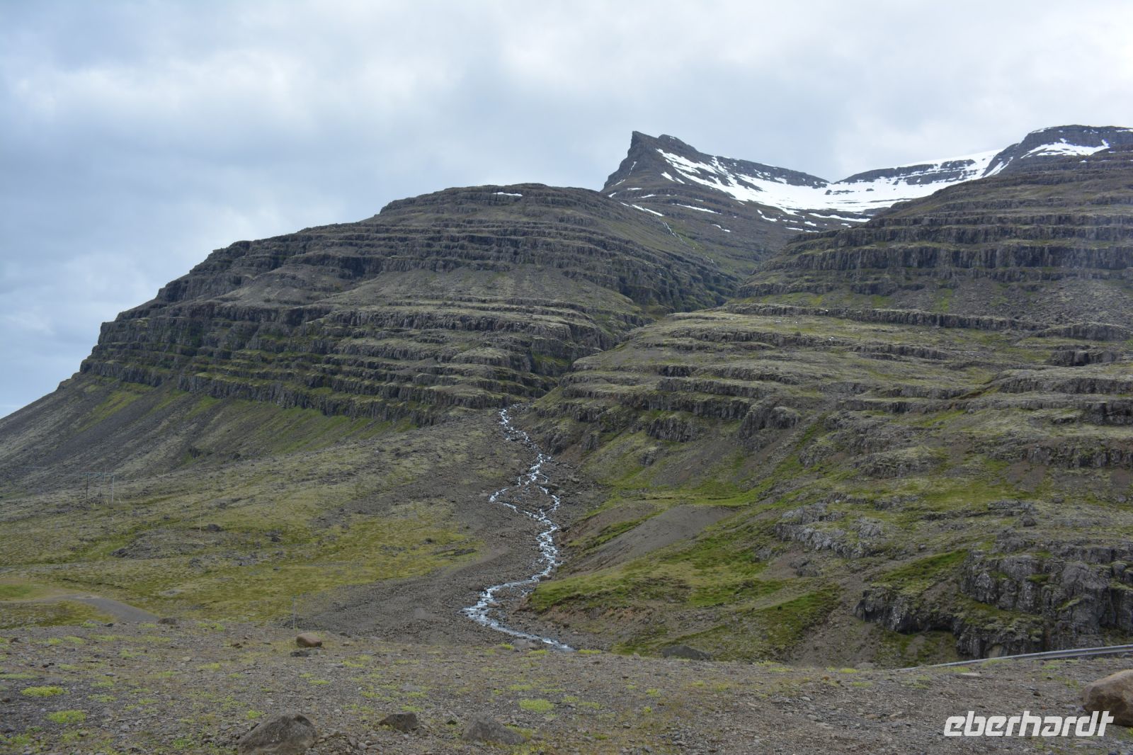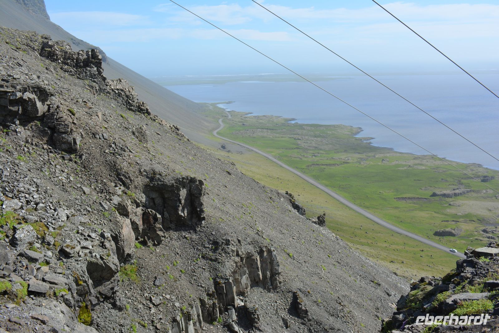 Am Nachmittag sitzen wir hauptsächlich im Bus und legen einige kurze Fotostopps ein. Der Südosten ist der älteste Teil Islands und am weitesten entfernt von der Plattengrenze. Jedes Jahr hebt sich das Gebiet hier um vier Millimeter, womit auch die Berge immer etwas größer werden und sich Gesteinsschichten aus dem Wasser erheben, die bisher unbekannt waren.