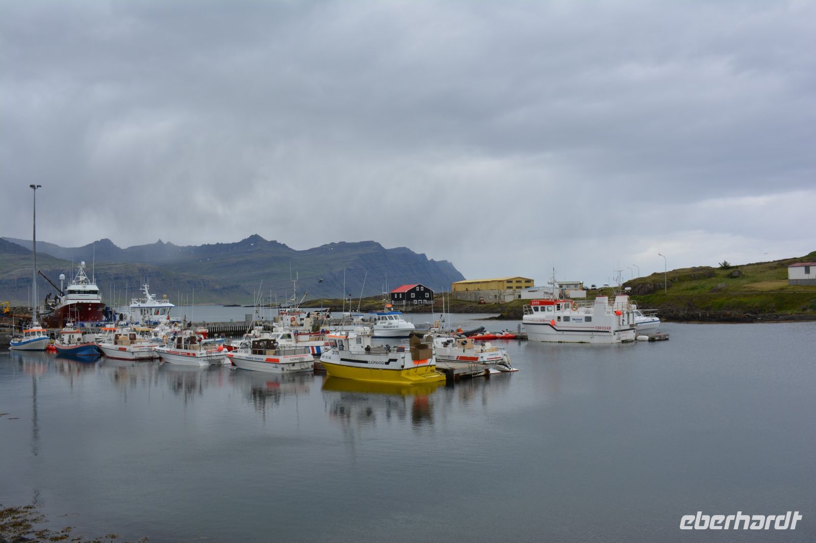 Am Hafen liegen viele kleine Fischerboote oder von hier kann man auch die Fähre zur Insel Flatey bzw, weiter in den Norden nutzen. Wir verbringen unsere Mittagspause in der Sonne und spazieren etwas durch den kleinen Ort mit seinen vielen bunten Häusern.