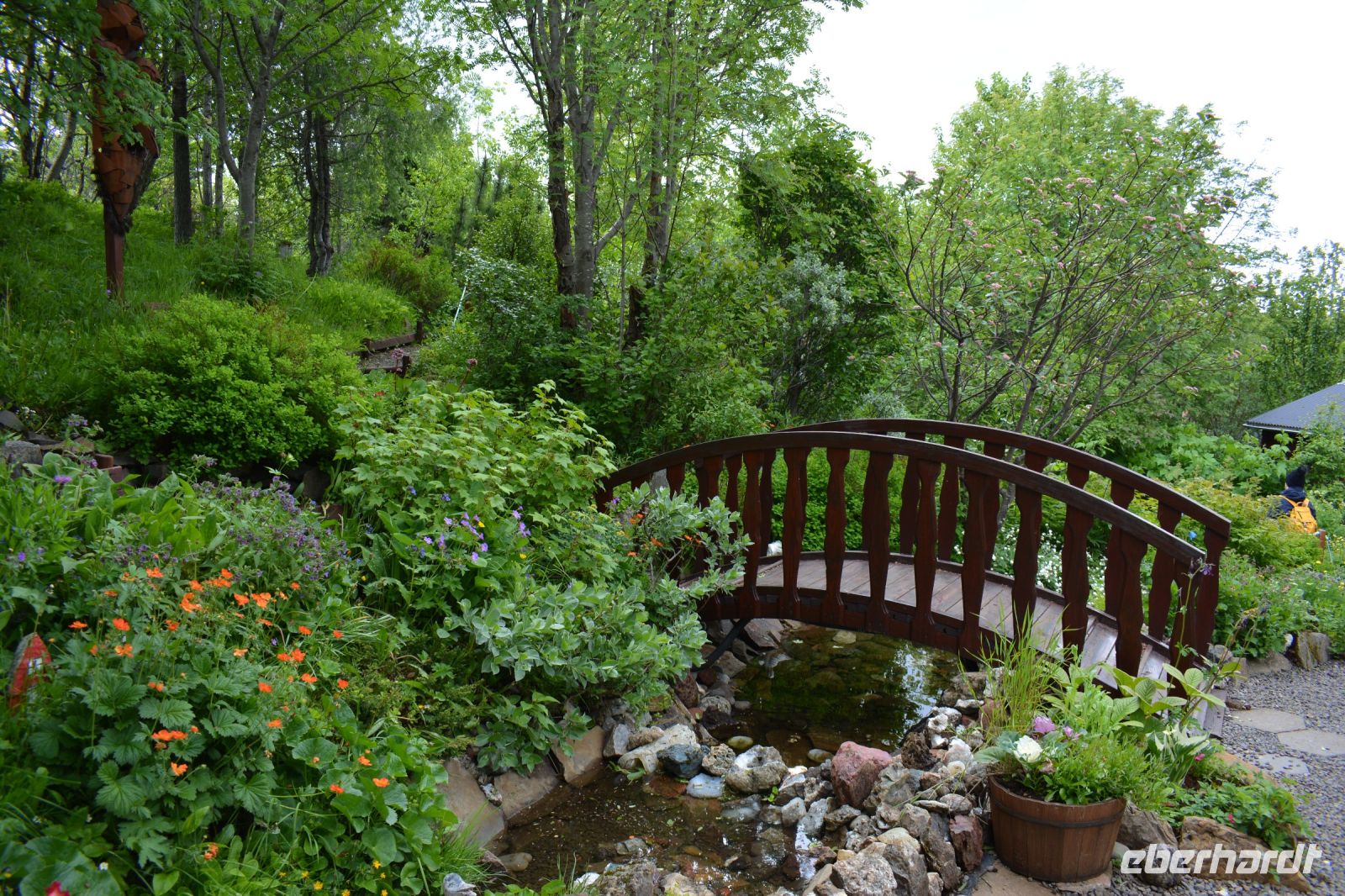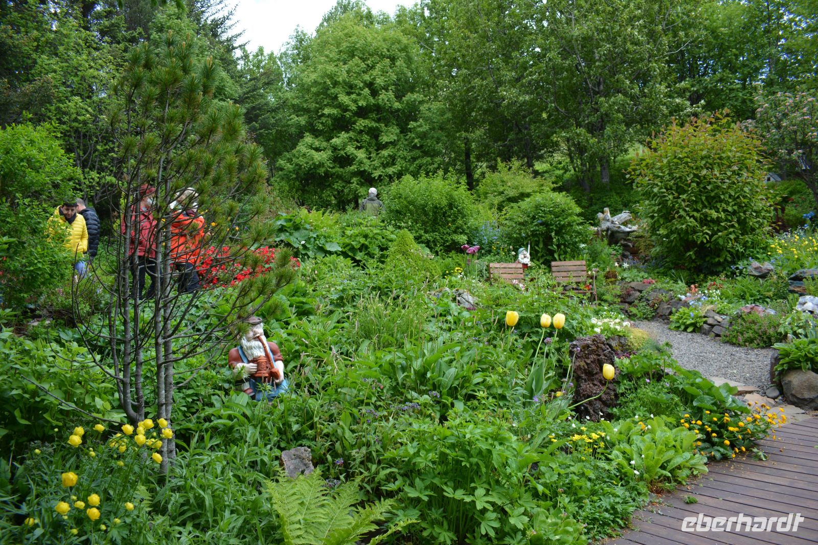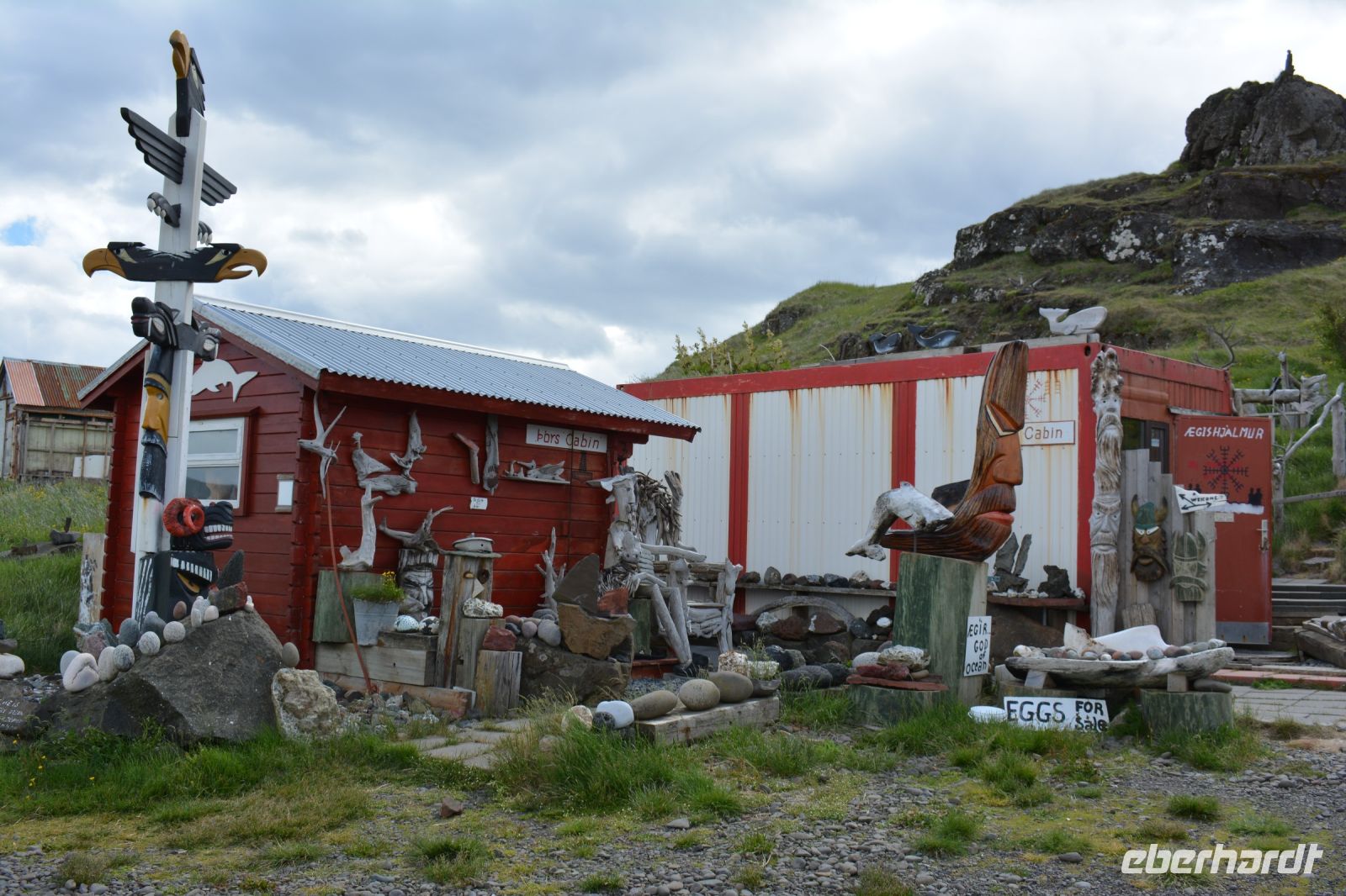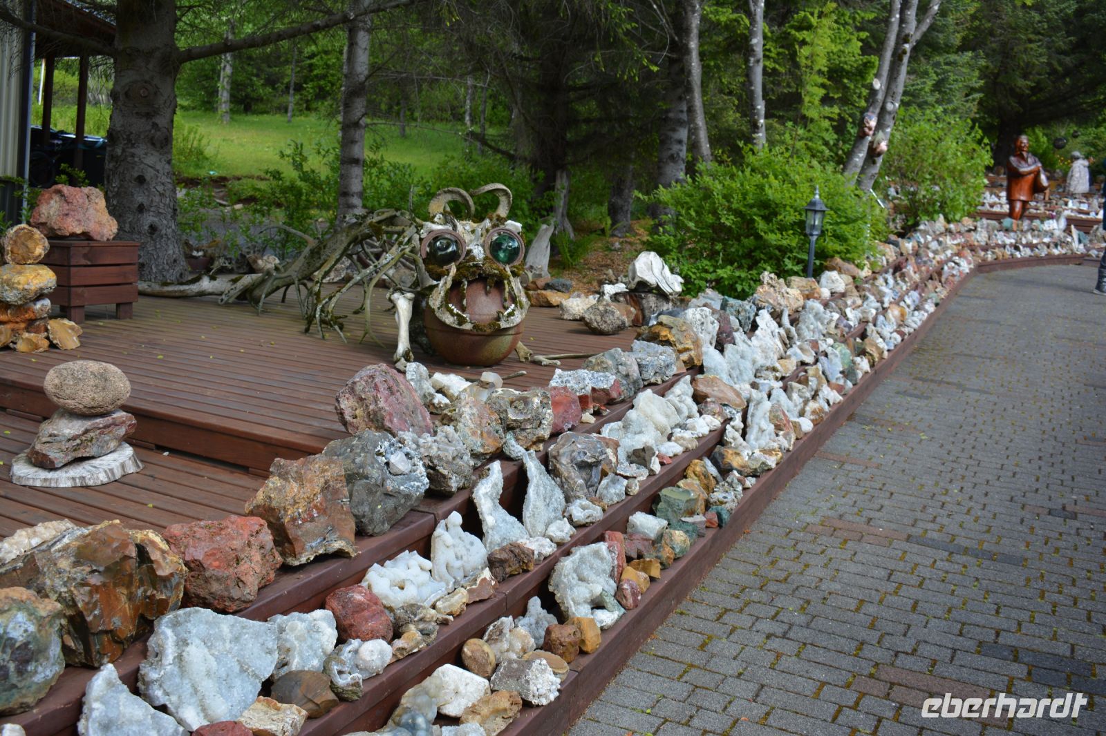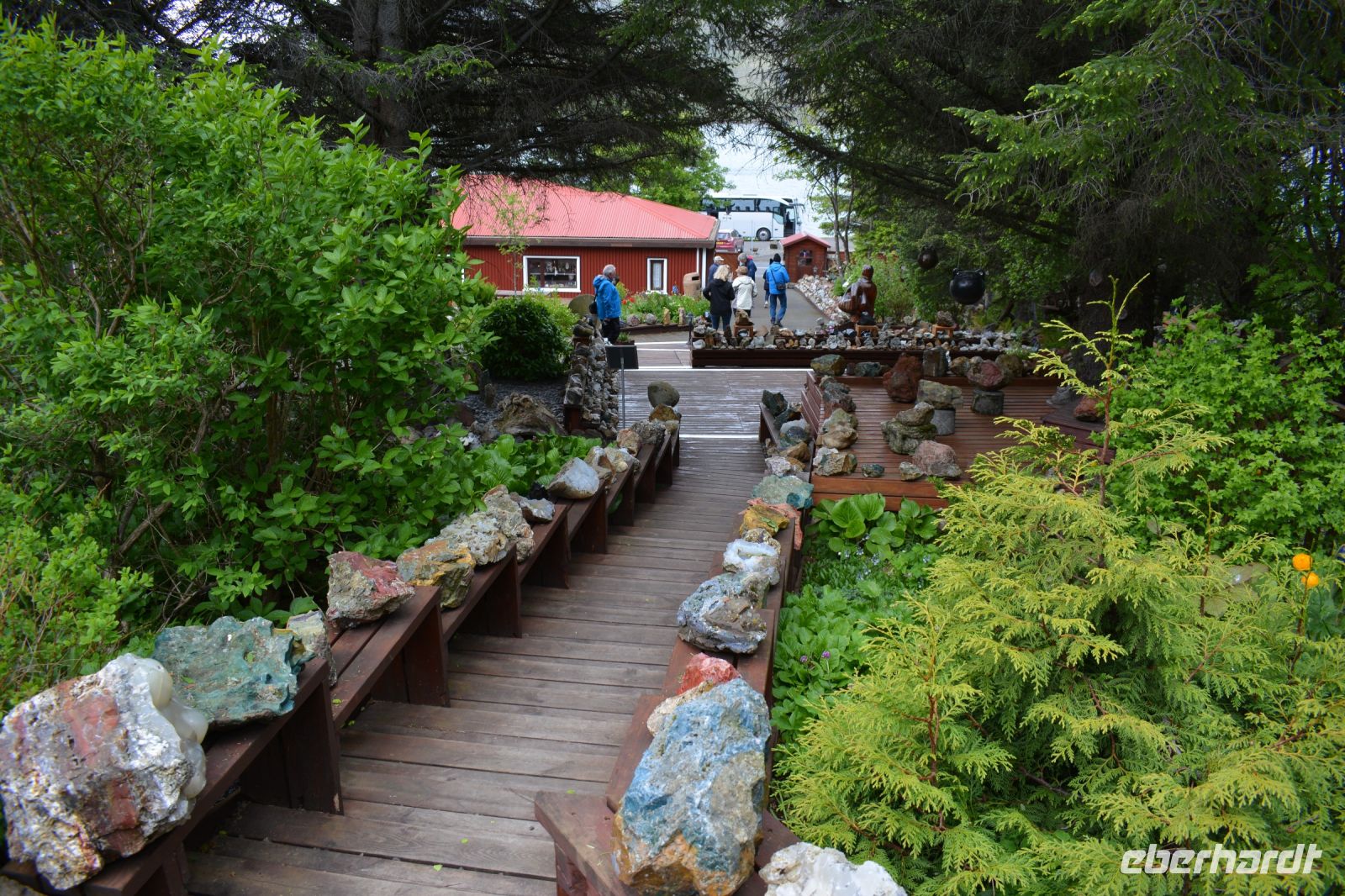 Für uns geht es weiter Richtung Süden, immer entlang der Ostfjörde. In diesen werden vor allem Lachse und auch Muscheln gezüchtet. Unseren ersten Halt machen wir in „Petras Steingarten“. Auch wenn wir uns am Anfang fragen, was an einem Steingarten so besonders sein soll, fasziniert uns dieses kleine Museum am Ende doch. Petra, die einst hier auf dem Grundstück wohnte, ist 1922 geboren und war nie die typische Hausfrau. Sie war schon immer von Steinen und Mineralien begeistert, so ging sie jeden Tag in die Berge und sammelte dort die Steine in denen Mineralien eingefasst waren und brachte diese in ihren Garten. Die Berge in den Südfjorden bestehen aus mehreren Schichten, welche durch Vulkanausbrüche entstanden sind. Die Lava stieg im Berg hinauf und ist so sehr langsam abgekühlt. Bei diesem Prozess entstehen Mineralien die zwar wertlos, aber wunderschön anzusehen sind. Ebenso begeisterte uns das gesamte Ambiente mit den vielen blühenden Blumen und Stauden in Petras Garten. Sie ist bereits 2012 gestorben, ihre Kinder führen aber ihr Erbe weiter und kümmern sich um die Anlage.