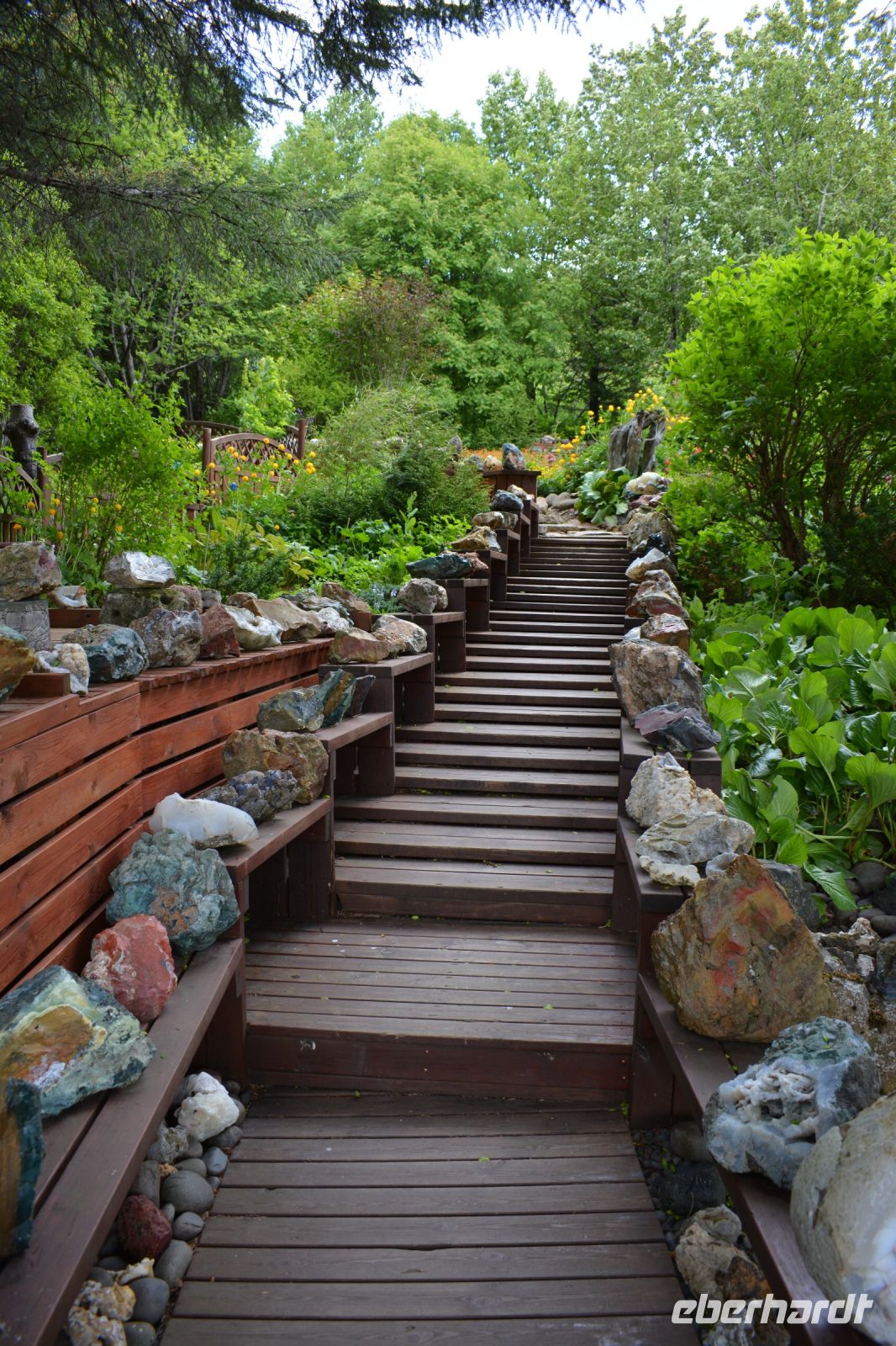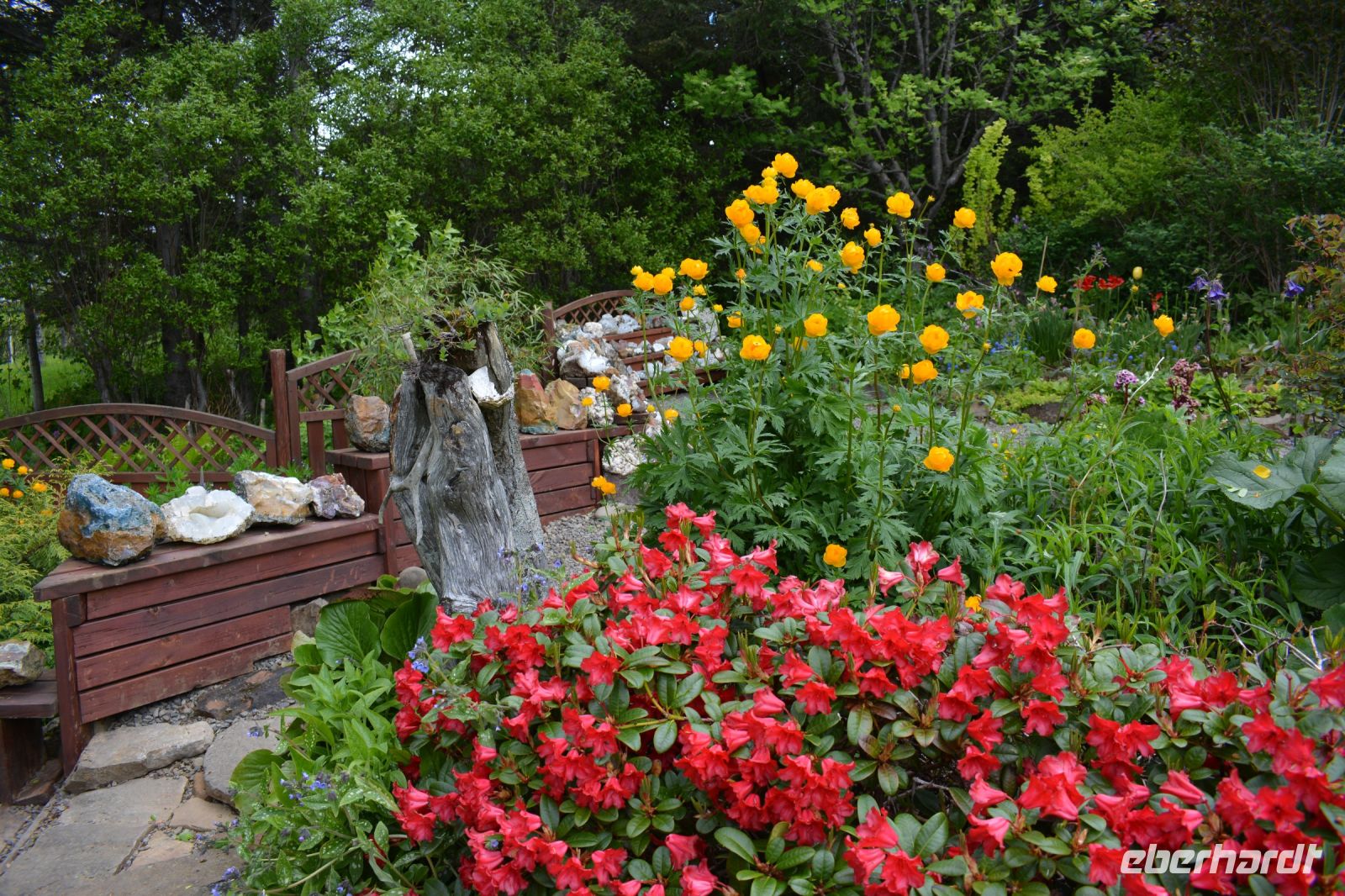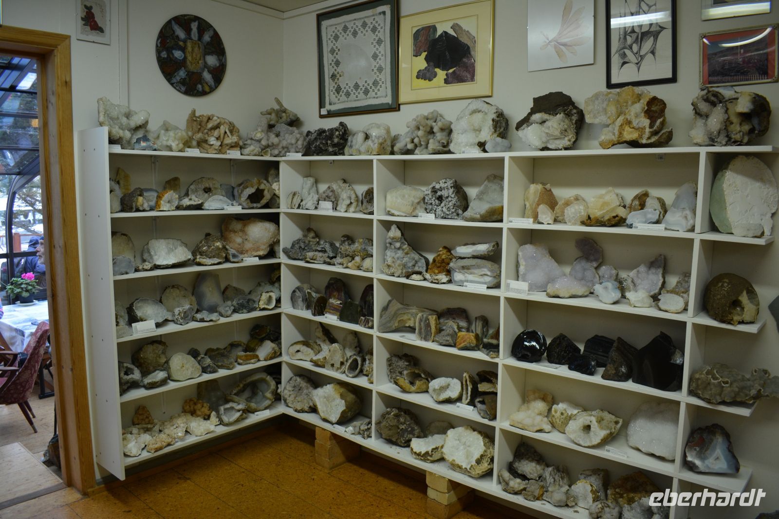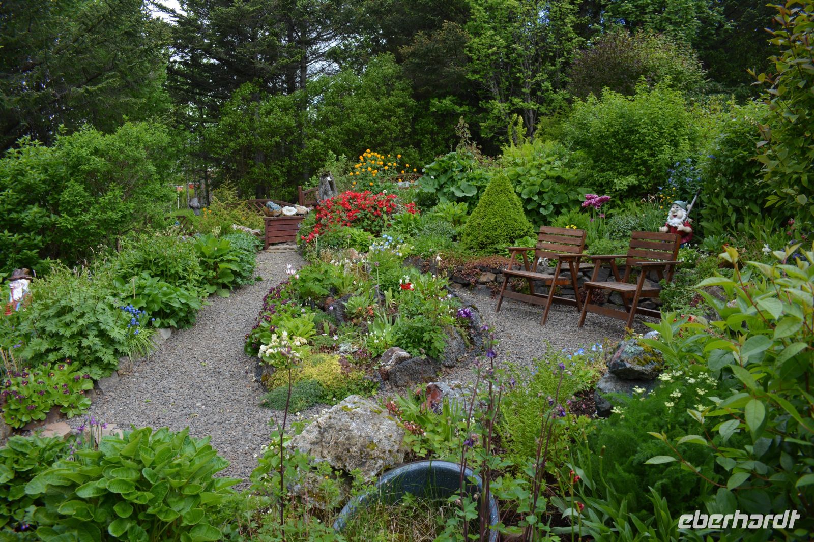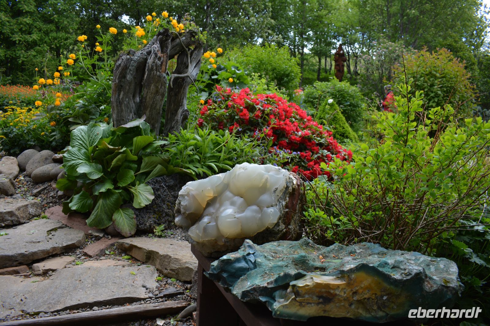 Für uns geht es weiter Richtung Süden, immer entlang der Ostfjörde. In diesen werden vor allem Lachse und auch Muscheln gezüchtet. Unseren ersten Halt machen wir in „Petras Steingarten“. Auch wenn wir uns am Anfang fragen, was an einem Steingarten so besonders sein soll, fasziniert uns dieses kleine Museum am Ende doch. Petra, die einst hier auf dem Grundstück wohnte, ist 1922 geboren und war nie die typische Hausfrau. Sie war schon immer von Steinen und Mineralien begeistert, so ging sie jeden Tag in die Berge und sammelte dort die Steine in denen Mineralien eingefasst waren und brachte diese in ihren Garten. Die Berge in den Südfjorden bestehen aus mehreren Schichten, welche durch Vulkanausbrüche entstanden sind. Die Lava stieg im Berg hinauf und ist so sehr langsam abgekühlt. Bei diesem Prozess entstehen Mineralien die zwar wertlos, aber wunderschön anzusehen sind. Ebenso begeisterte uns das gesamte Ambiente mit den vielen blühenden Blumen und Stauden in Petras Garten. Sie ist bereits 2012 gestorben, ihre Kinder führen aber ihr Erbe weiter und kümmern sich um die Anlage.
