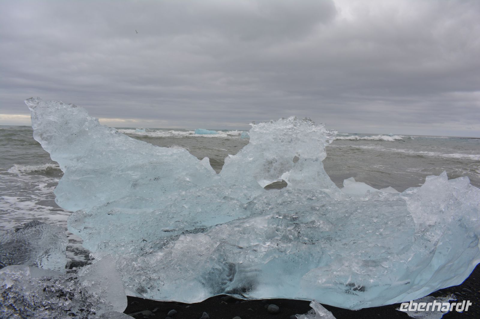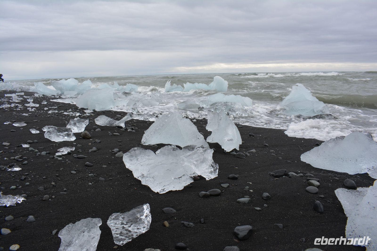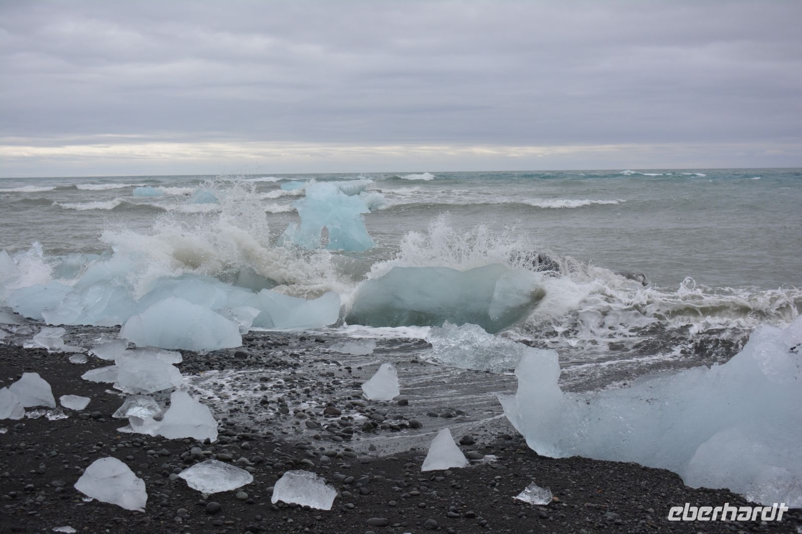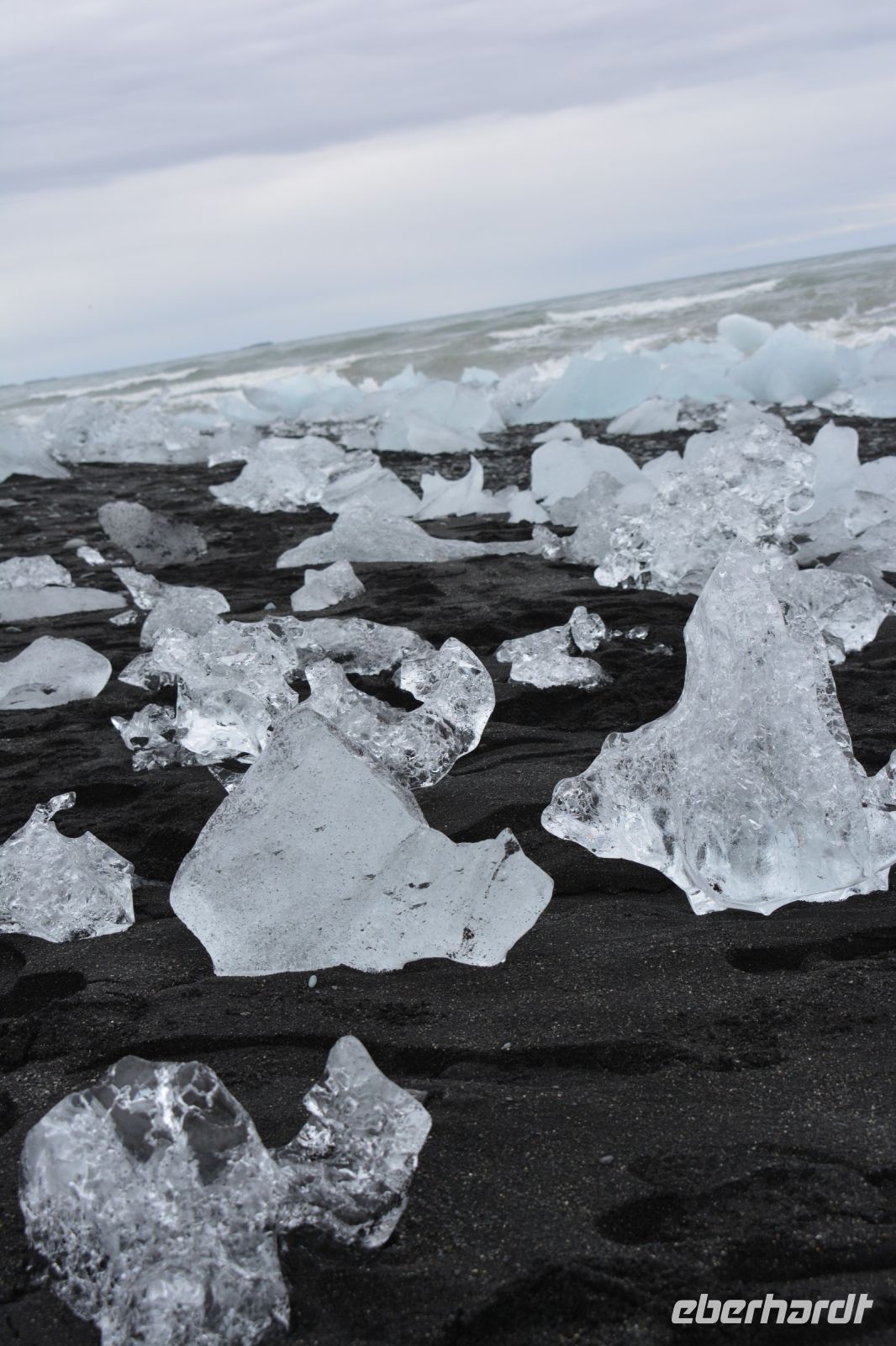 Unsere Gruppe ist wieder vereint und auf uns wartet ein spannender Tag. Als aller erstes geht zum Diamanten Strand. Hier werden die Eisberge vom Gletscher Vatnajökull, dem größten Gletscher Islands, teilweise an den Strand gespült, nachdem sie die Lagune verlassen haben. Am schwarzen Strand kann man zwischen den unterschiedlichen großen weißen oder fast durchsichtigen Gebilden spazieren gehen und einzigartige Fotos schießen. Wer aufmerksam ist, kann auf dem Weg zur Lagune schon die ersten Seehunde zwischen den Eisbergen schwimmen sehen. Es tummeln sich hier viele Fische, vor allem Lachse und Heringe, weshalb es für die Seehunde hier das reinste Paradies ist.