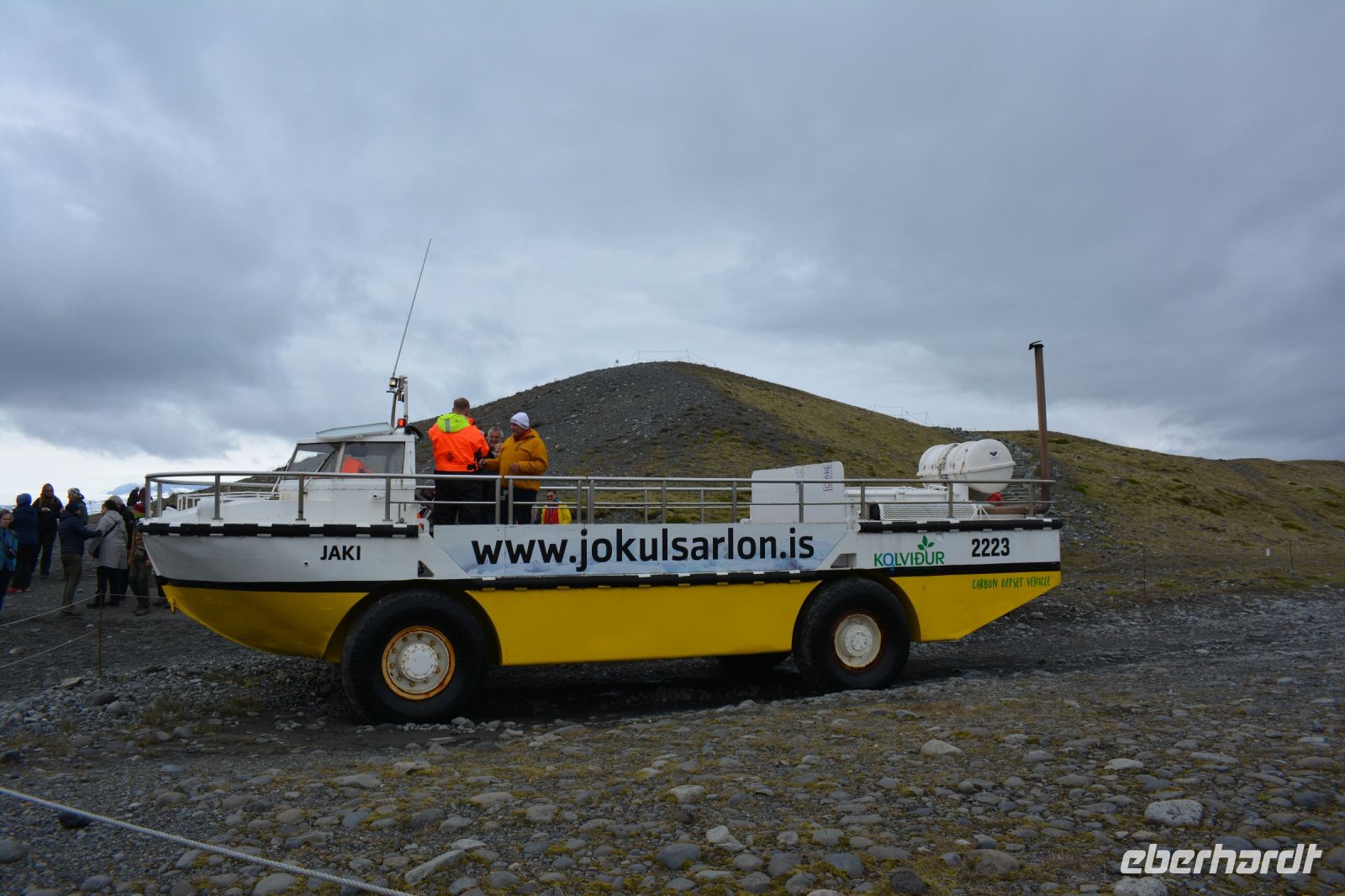 Punkt um elf Uhr wartet schon ein außergewöhnliches Gefährt auf uns. Mit dem Amphibienfahrzeug machen wir uns auf den Weg in die Lagune. Jeder bekommt eine Schwimmweste an und sobald wir auf dem Wasser sind, dürfen wir aufstehen und uns auf dem Boot frei bewegen. Die großen und kleinen Eisberge begeistern uns sehr. Wir erfahren, dass dieser Gletscher der einzige ist, der noch Verbindung zum Wasser hat und man vermutet, dass dies in zwanzig Jahres schon ganz anders aussehen wird. Immer mehr Eis bricht ab und schmilzt.