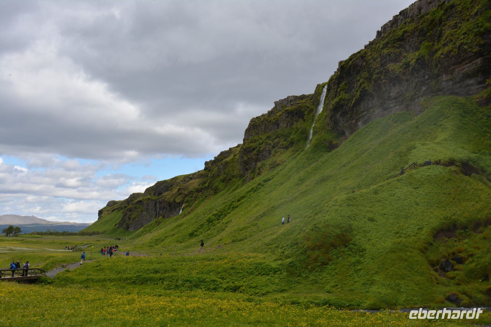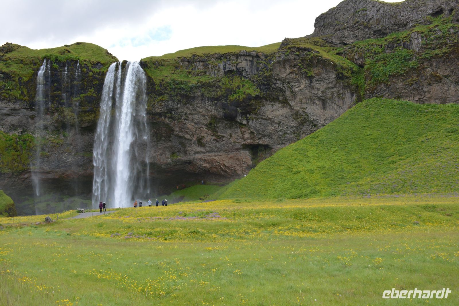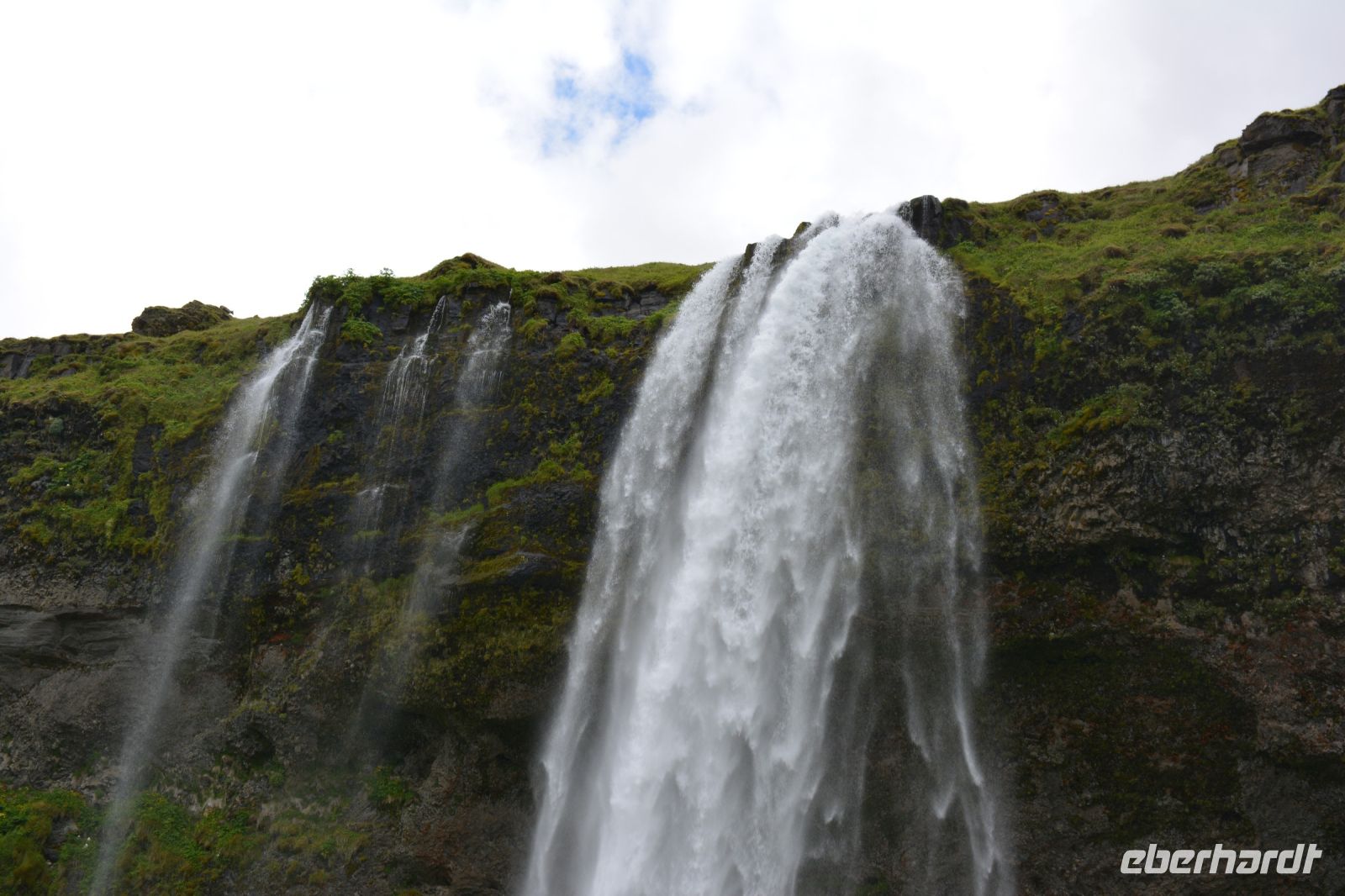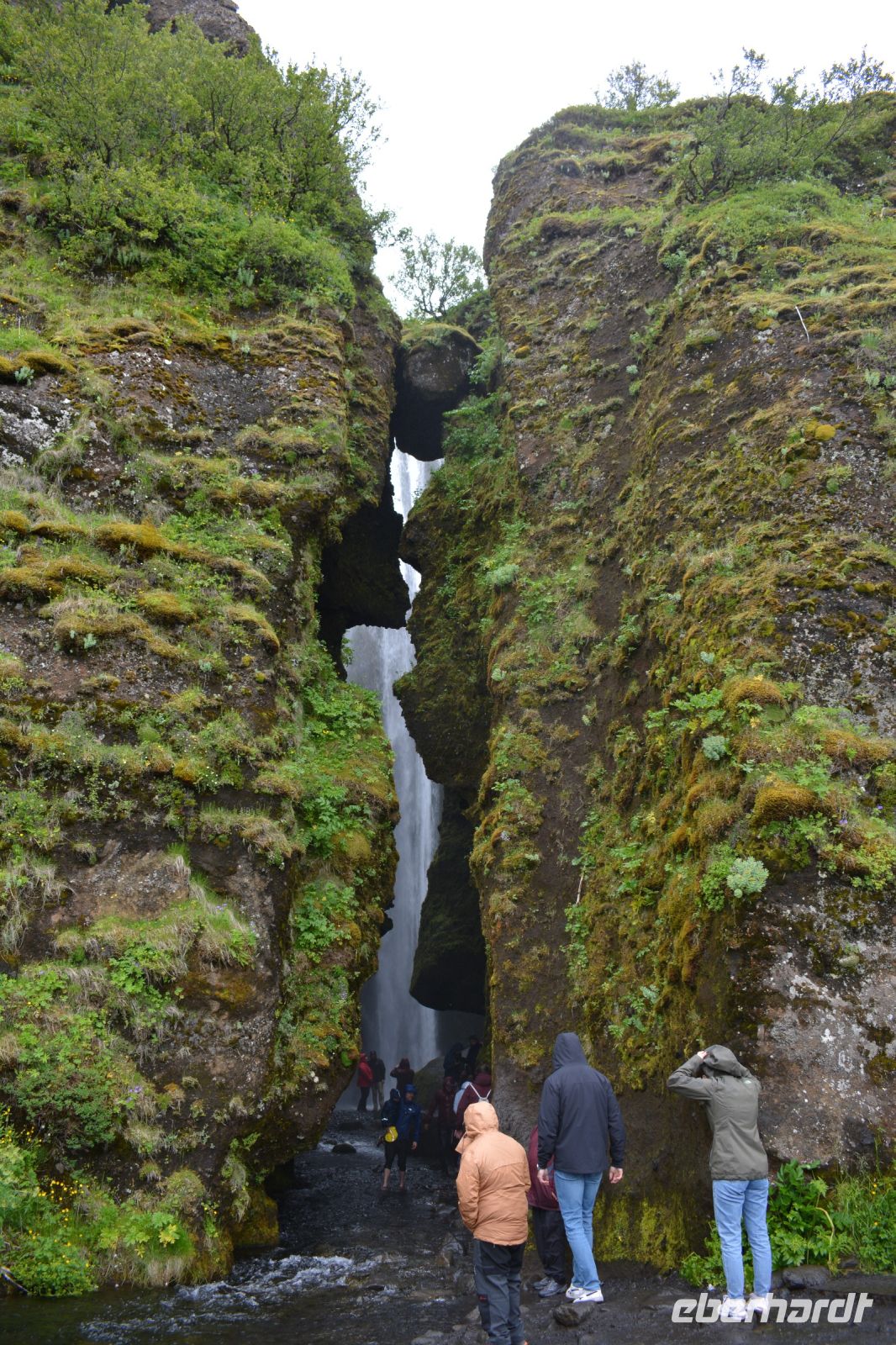 Den frühen Nachmittag verbringen wir am Seljalandsfoss. Dieser gewaltige Wasserfall ist etwas besonderes, denn wer hier Regensachen dabei hat und gutes Schuhwerk, kann den Wasserfall umrunden. Auch hier stürzt das Wasser 60 Meter in die Tiefe. Wer nicht nass werden will, geht den Weg nach hinten und wirft noch einen Blick auf die kleineres Wasserfälle. Ganz besonders ist hier noch der Gljufrabui, dieser Wasserfall stürzt sich in einer Höhle in die Tiefe