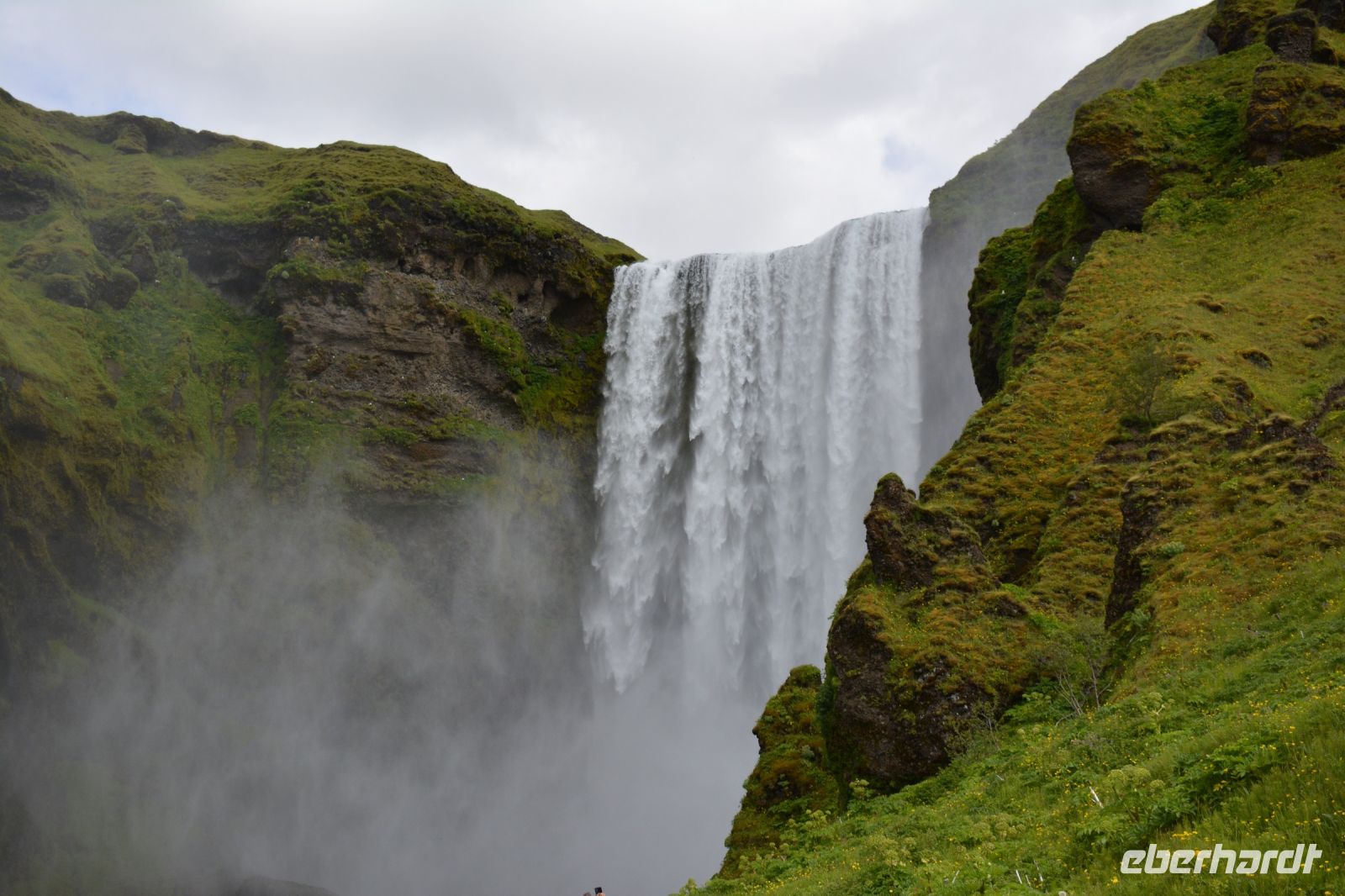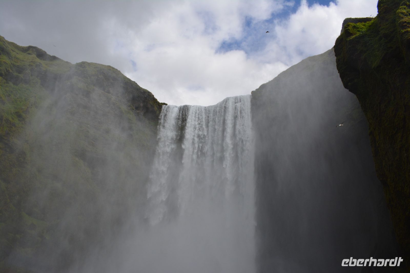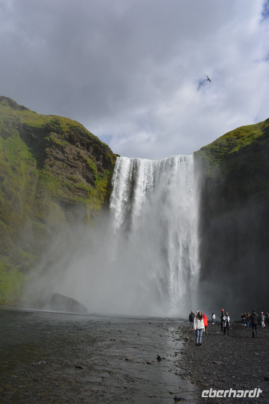 Gleich in der Nähe liegt der Skogafoss, der Waldwasserfall. Dieser stürzt hier 60 Meter in die Tiefe. Wir haben wieder die Möglichkeit tolle Bilder zu machen.