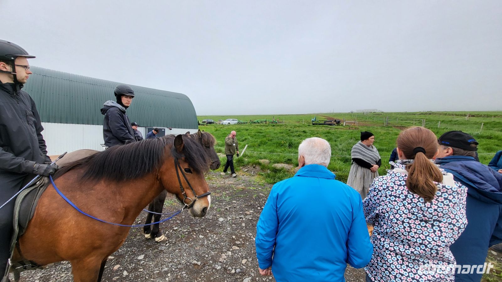 Unser nächster Halt führte uns zu einem Pferdehof, wo wir die Gelegenheit hatten, die einzigartigen Islandpferde kennenzulernen. Evi, die Besitzerin des Hofes, erzählte uns Wissenswertes zur Pferdezucht und zeigte uns voller Stolz ihre selbst aufgebauten Torfhäuser. Eine Vorführung des speziellen Gangs namens Tölt beeindruckte uns besonders. Es war faszinierend zu sehen, wie elegant und geschmeidig die Pferde sich bewegten. Im Anschluss konnten wir uns bei Kaffee und Gebäck (Eheglück) aufwärmen und setztendanach unsere Reise in den Norden fort.