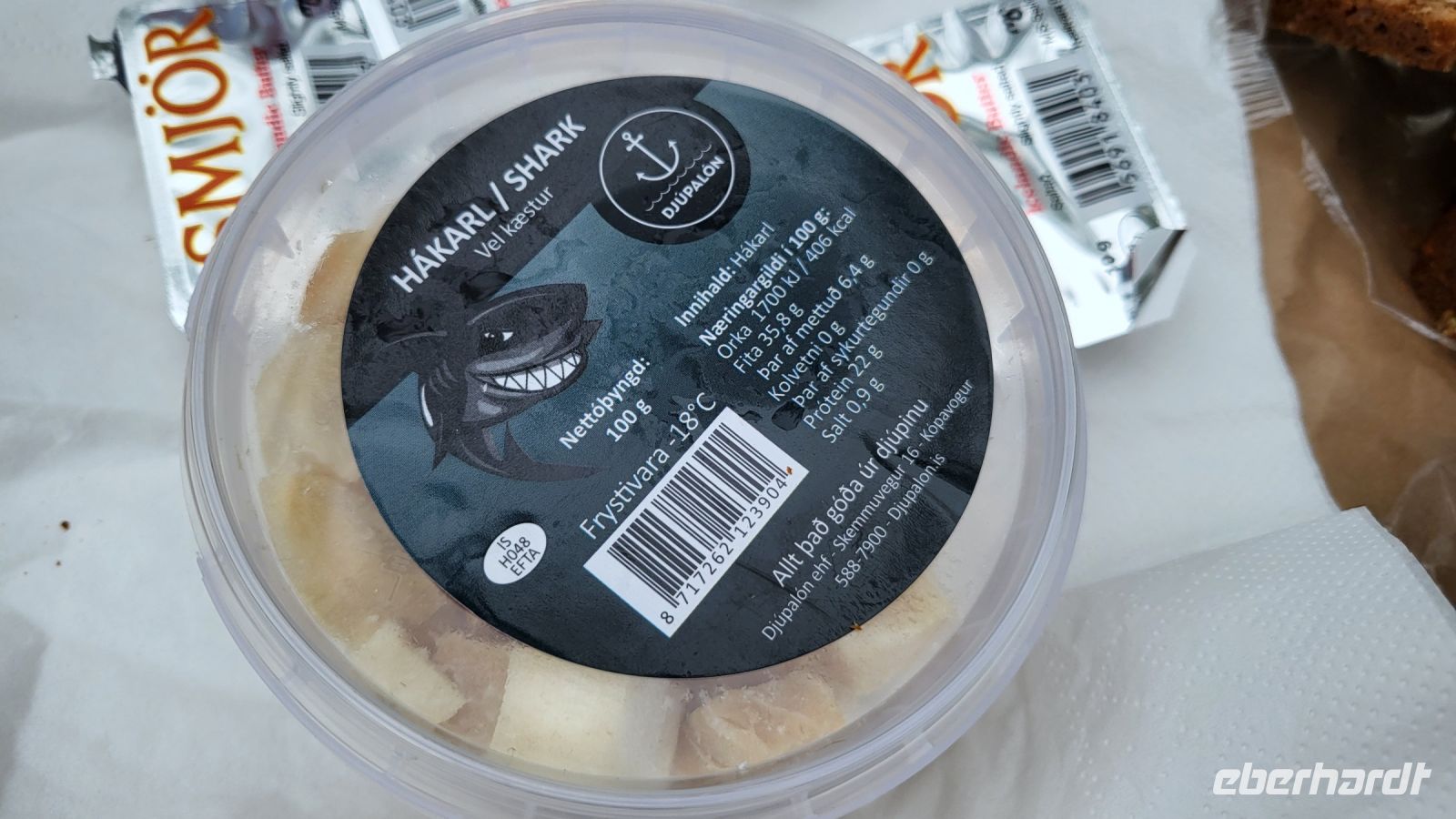 Um die Mittagszeit erreichen wir den Jökulsárgljúfur-Nationalpark und mit ihm die beeindruckende Asbyrgi-Schlucht. Laut nordischer Mythologie wurde diese hufeisenförmige Formation durch den Hufabdruck von Sleipnir, dem achtbeinigen Ross des Gottes Odin, geformt. Geologische Untersuchungen zeigen jedoch, dass die einzigartige Form durch verschiedene Gletscherläufe und Vulkanausbrüche geformt wurde. Der Fluss, der sich heute über die beiden von uns besuchten Wasserfälle ausbreitet, hatte einst sein Bett in dieser Schlucht. Inzwischen hat sich der Flusslauf jedoch nach Osten verlagert. Wir spazierten bis zum See und bei unserer Ankunft am Bus, überraschte uns Franzi mit einer Kostprobe des gefürchteten Hákarl. Hákarl, auch bekannt als fermentierter Hai, ist eine traditionelle isländische Speise. Es handelt sich um Fleisch des Grönlandhais, das fermentiert und getrocknet wurde, oft über mehrere Monate. Der Grönlandhai ist für den Menschen roh ungenießbar, aufgrund eines hohen Gehalts an Harnstoff und Trimethylaminoxid, aber das Fermentieren neutralisiert diese giftigen Verbindungen. Der Geschmack von Hákarl ist stark und markant, oft als ammoniakartig beschrieben und nicht jedermanns Sache. Wir waren mutig und probierten, was das Zeug hielt.