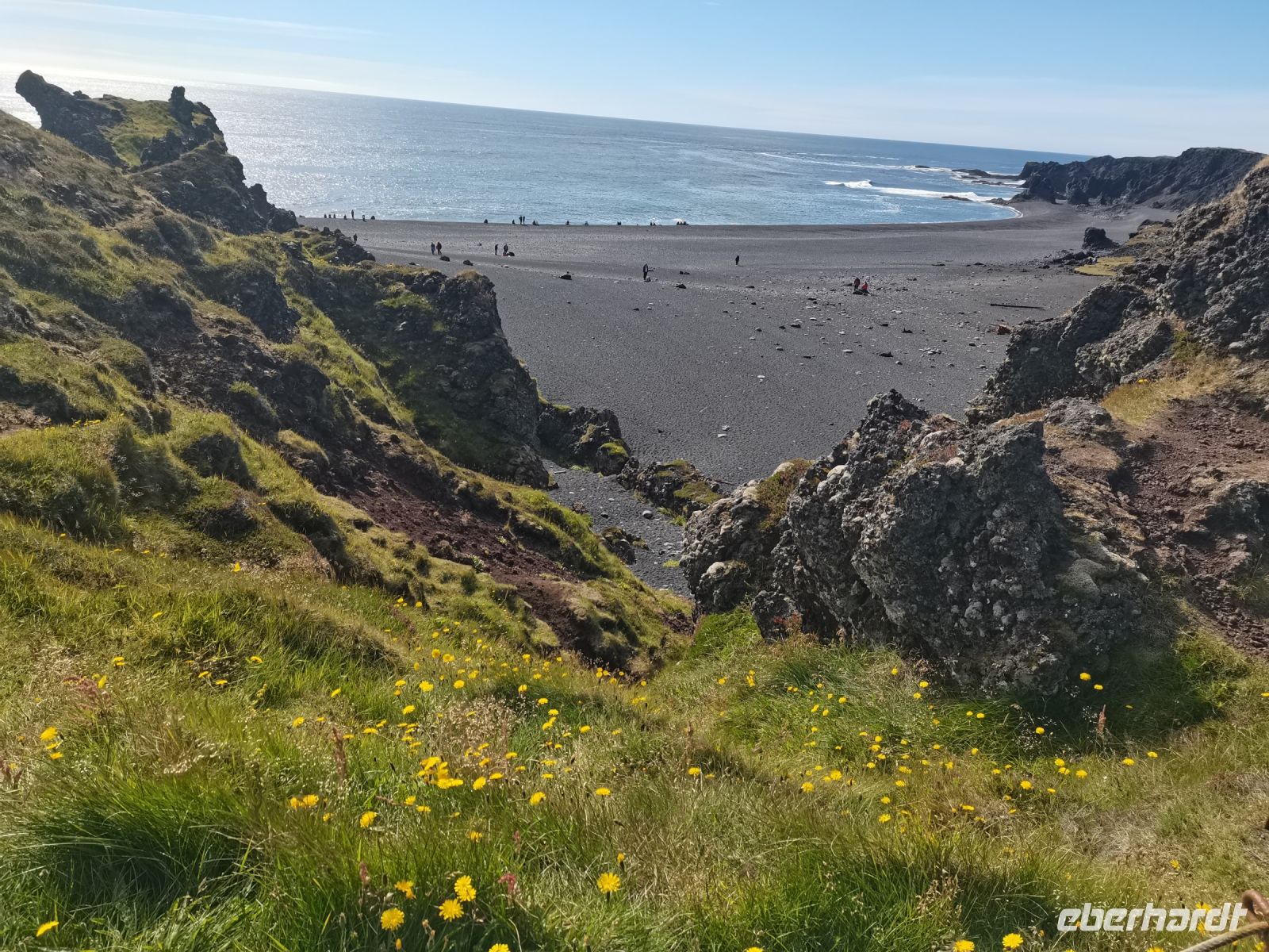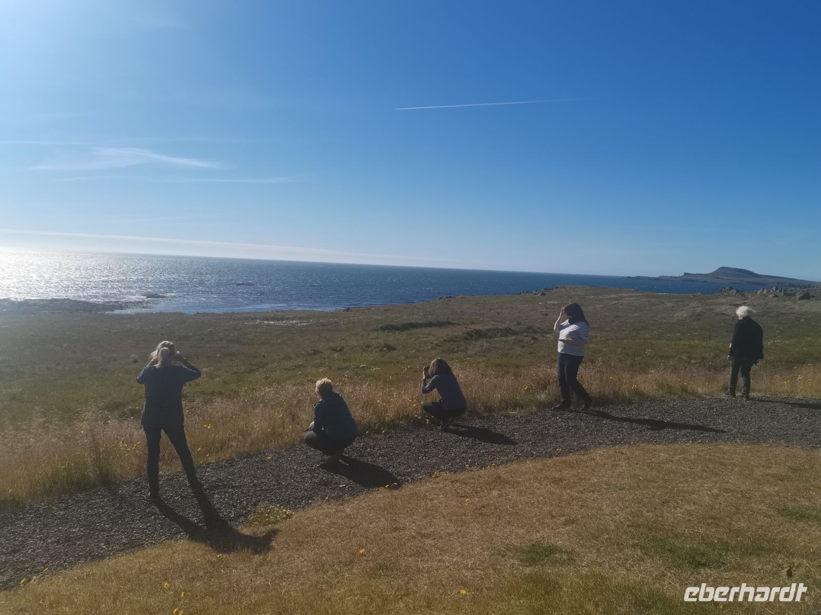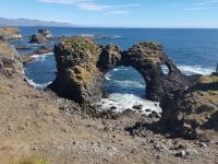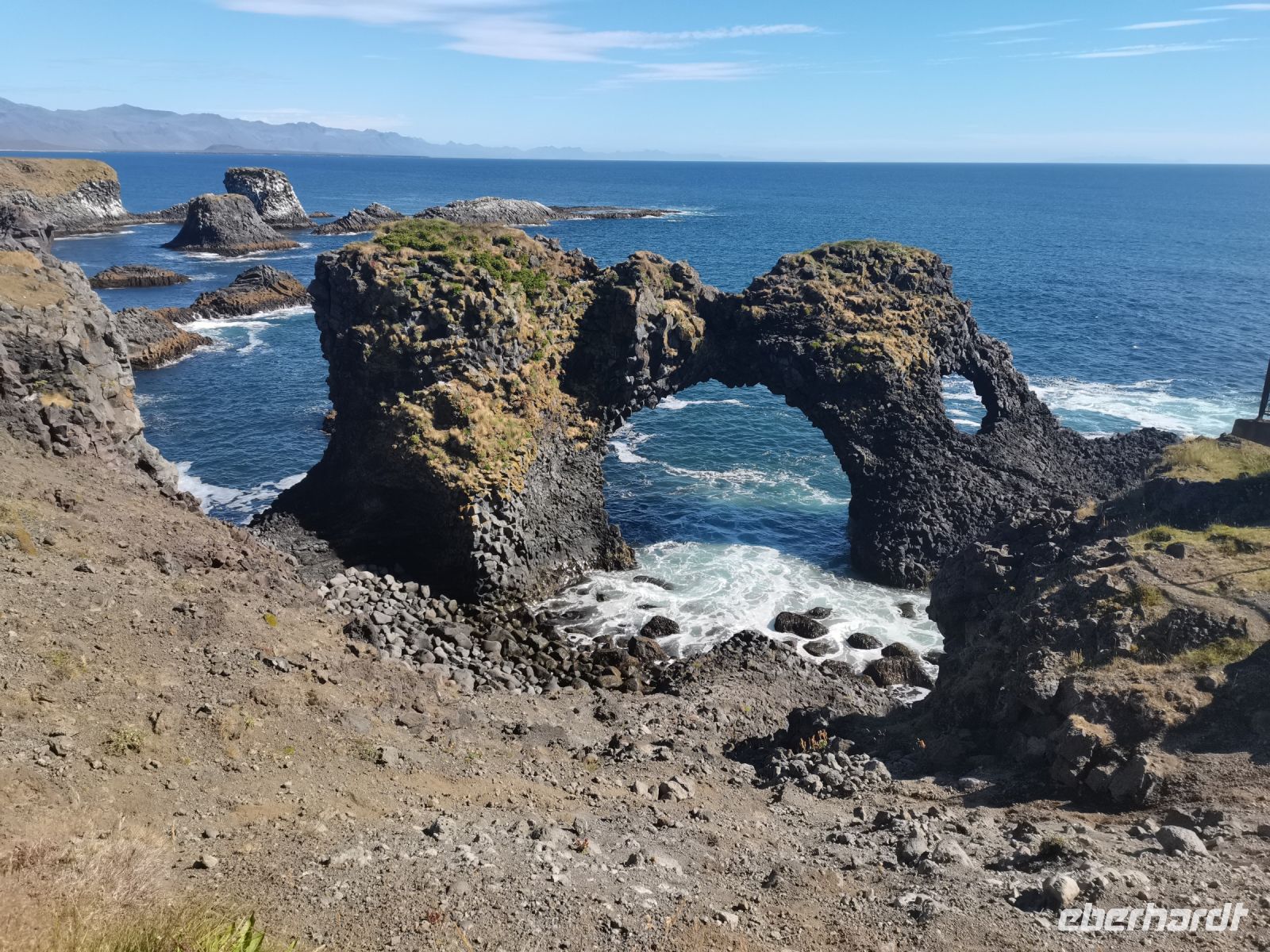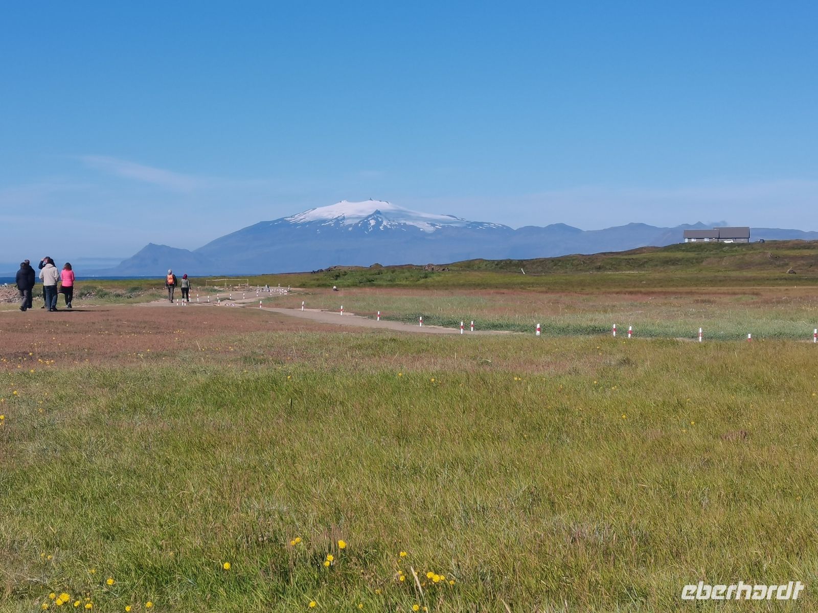Was für ein Glück! Wir haben wieder schönes Wetter. Nach einer Stunde Fahrt halten wir in Borgarnes, ein kleiner Ort, in dessen Nähe wir auch am Abend übernachten. Auf dem Weg entlang der Küste nach Arnarstapi machen wir viele spontane Foto-Stopps. Wir besuchen den Robben- und Seehundstrand Ytri Tunga, ein weißer, feiner Sandstrand. In Arnarstapi legen wir die Mittagspause ein und genießen die typisch isländische Küche. Rosa führt uns anschließend über einen schönen Pfad zu den imposanten Felsformationen an der Küste bis zum Hafen mit den kleinen Fischerbooten. Von hier sehen wir bereits den 1446 Meter hohen Vulkan Snæfellsjökull am westlichen Ende der Halbinsel Snæfellsnes. Der Himmel ist strahlend blau. Im Bus freuen wir uns über die wunderschönen Fotos und Filme, die wir an dieser Küste aufnehmen konnten.