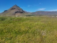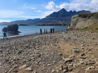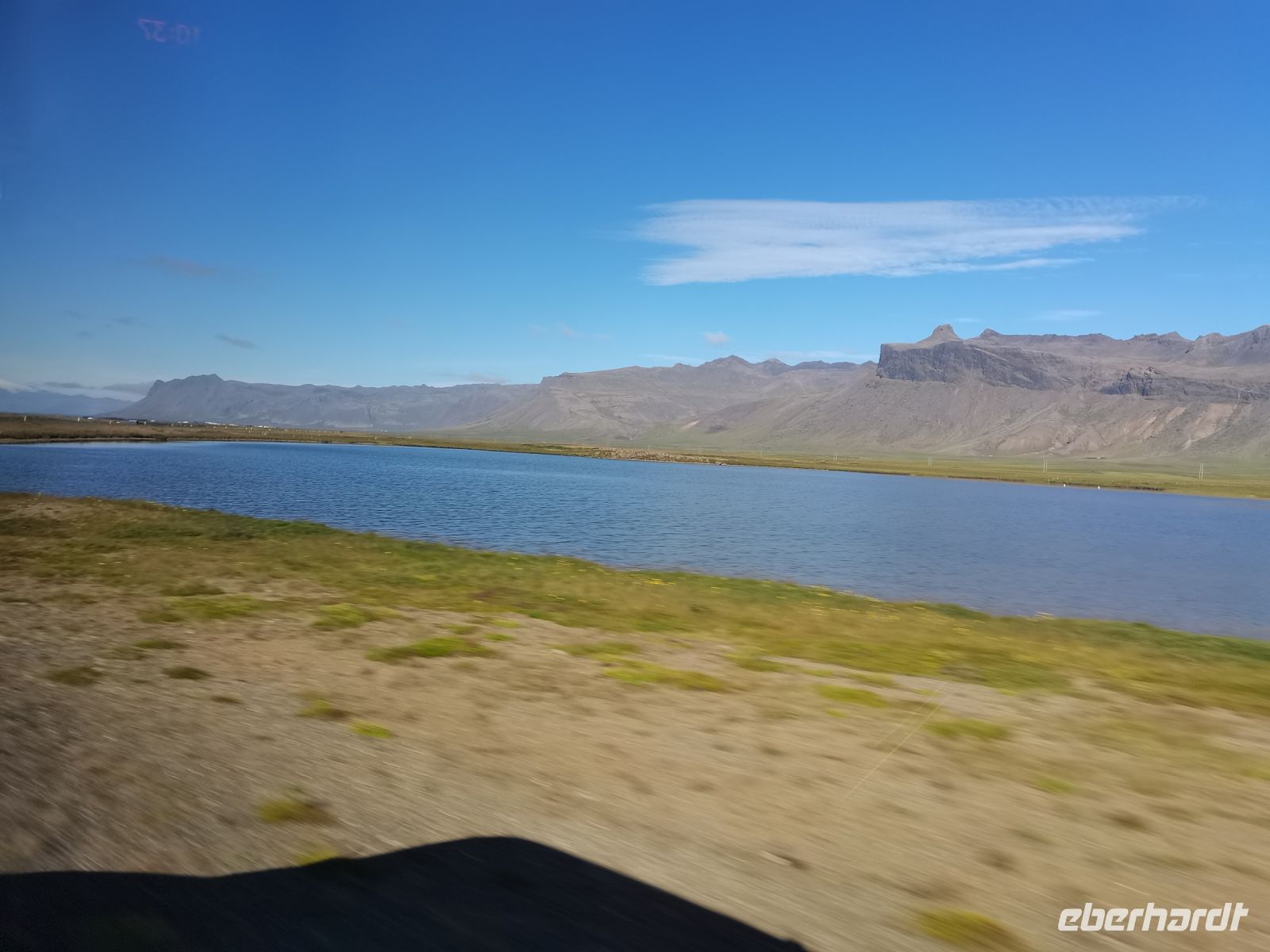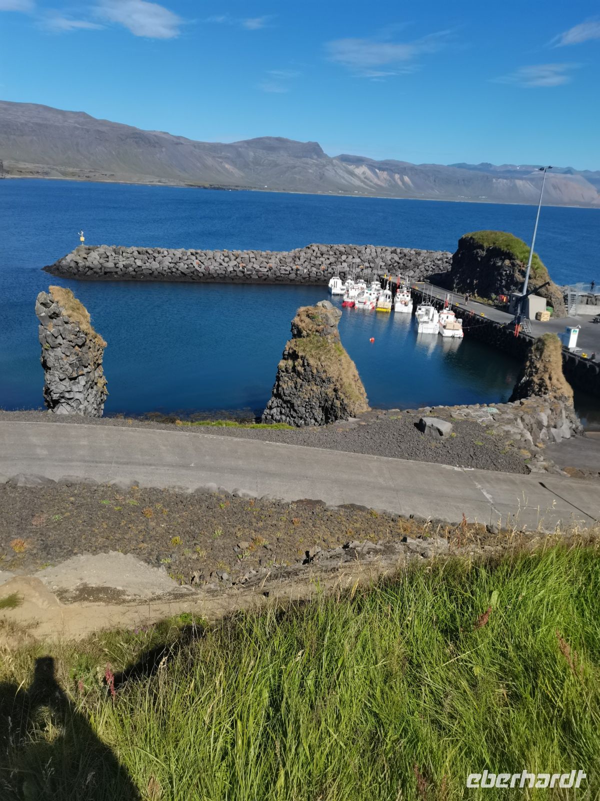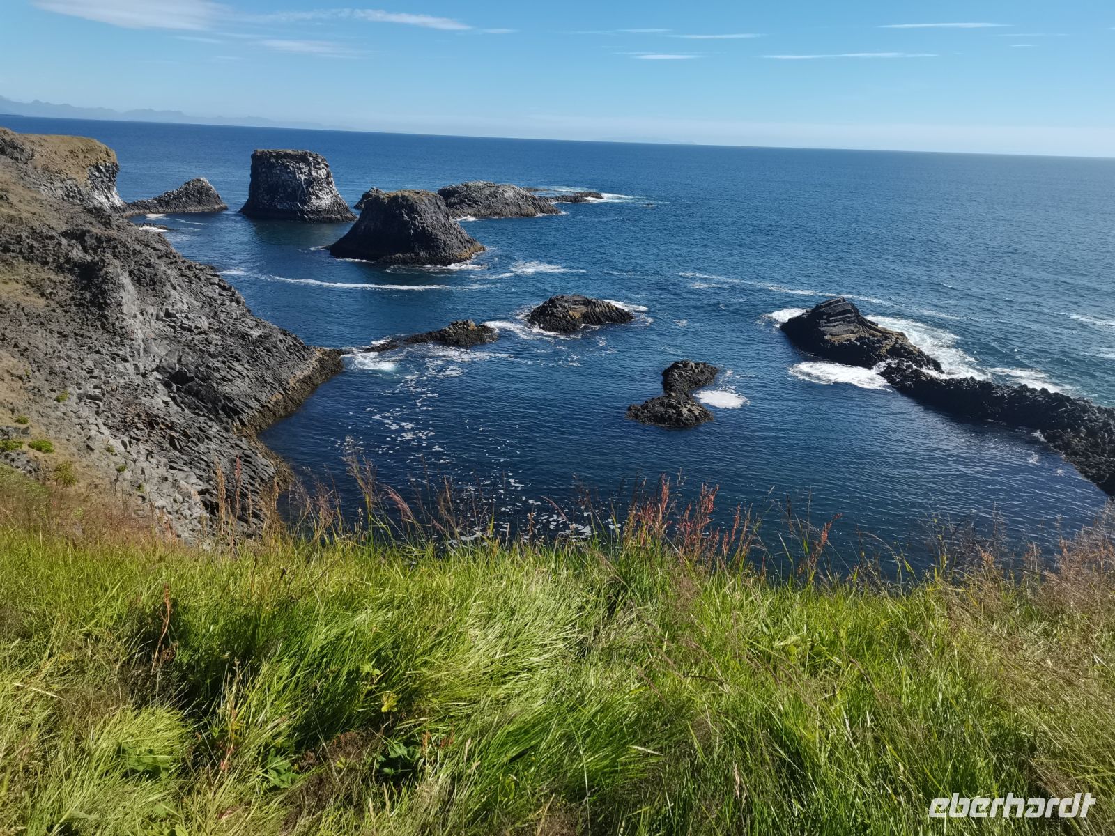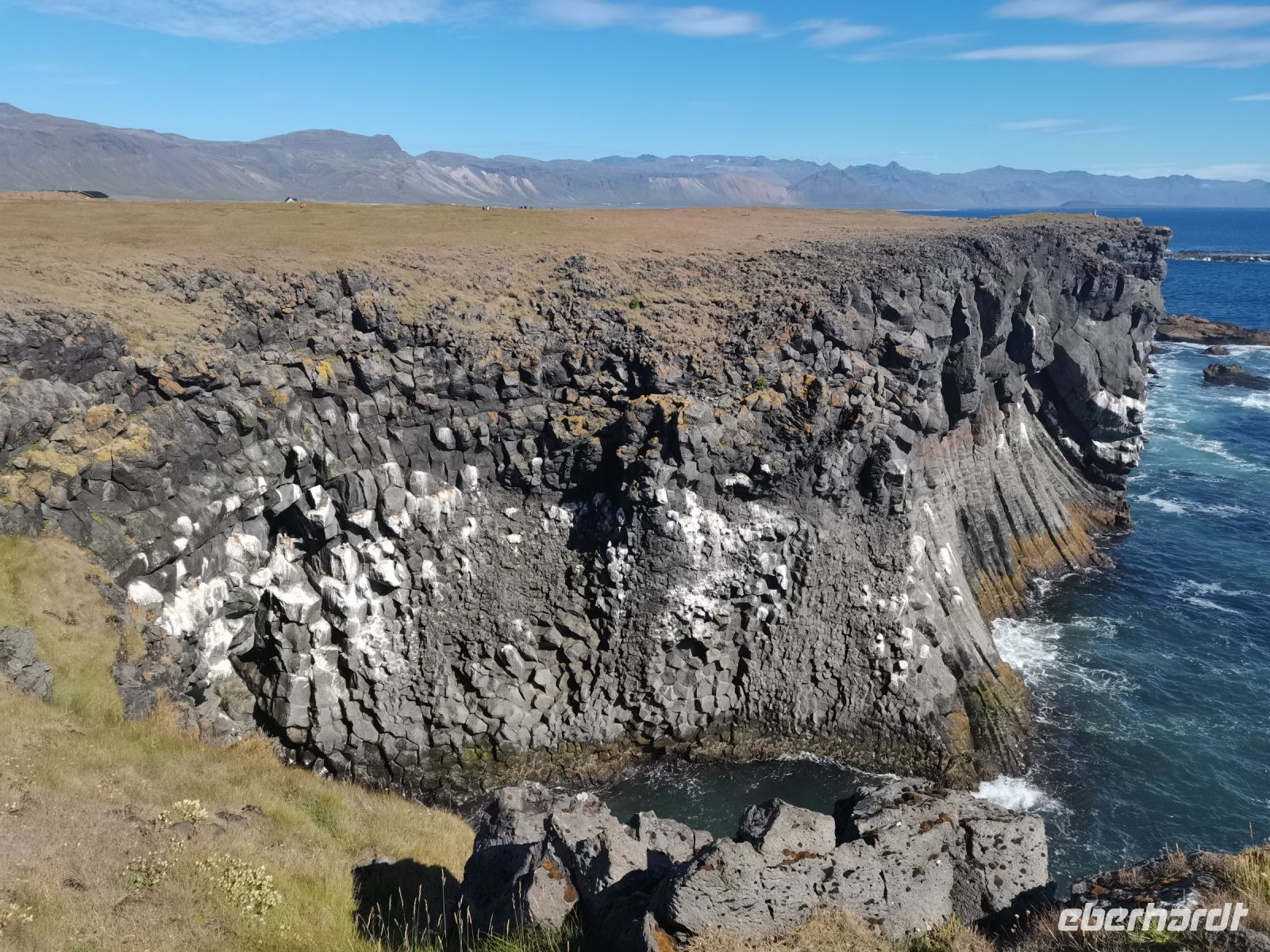 Was für ein Glück! Wir haben wieder schönes Wetter. Nach einer Stunde Fahrt halten wir in Borgarnes, ein kleiner Ort, in dessen Nähe wir auch am Abend übernachten. Auf dem Weg entlang der Küste nach Arnarstapi machen wir viele spontane Foto-Stopps. Wir besuchen den Robben- und Seehundstrand Ytri Tunga, ein weißer, feiner Sandstrand. In Arnarstapi legen wir die Mittagspause ein und genießen die typisch isländische Küche. Rosa führt uns anschließend über einen schönen Pfad zu den imposanten Felsformationen an der Küste bis zum Hafen mit den kleinen Fischerbooten. Von hier sehen wir bereits den 1446 Meter hohen Vulkan Snæfellsjökull am westlichen Ende der Halbinsel Snæfellsnes. Der Himmel ist strahlend blau. Im Bus freuen wir uns über die wunderschönen Fotos und Filme, die wir an dieser Küste aufnehmen konnten.