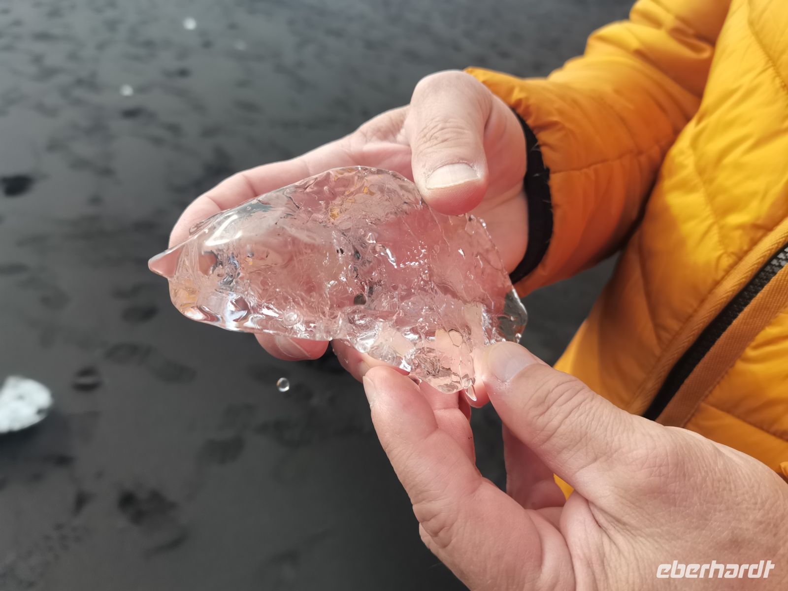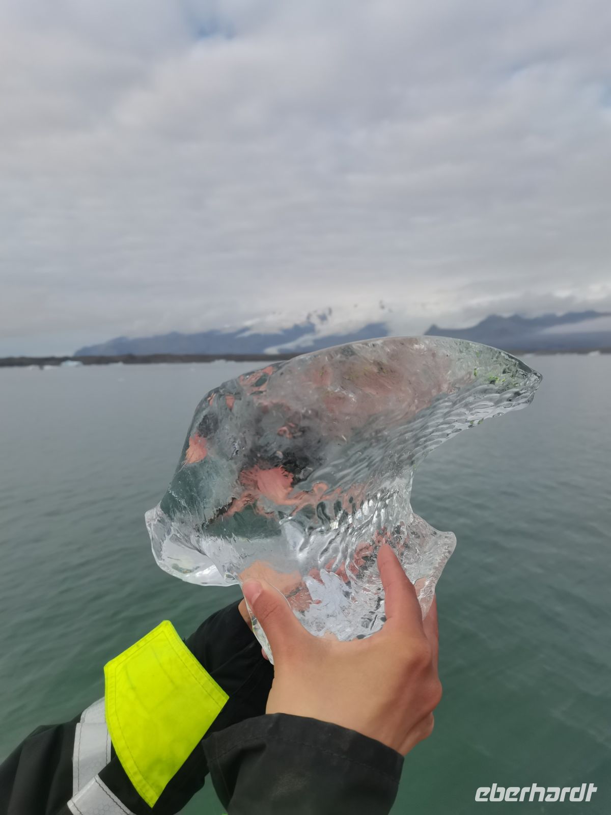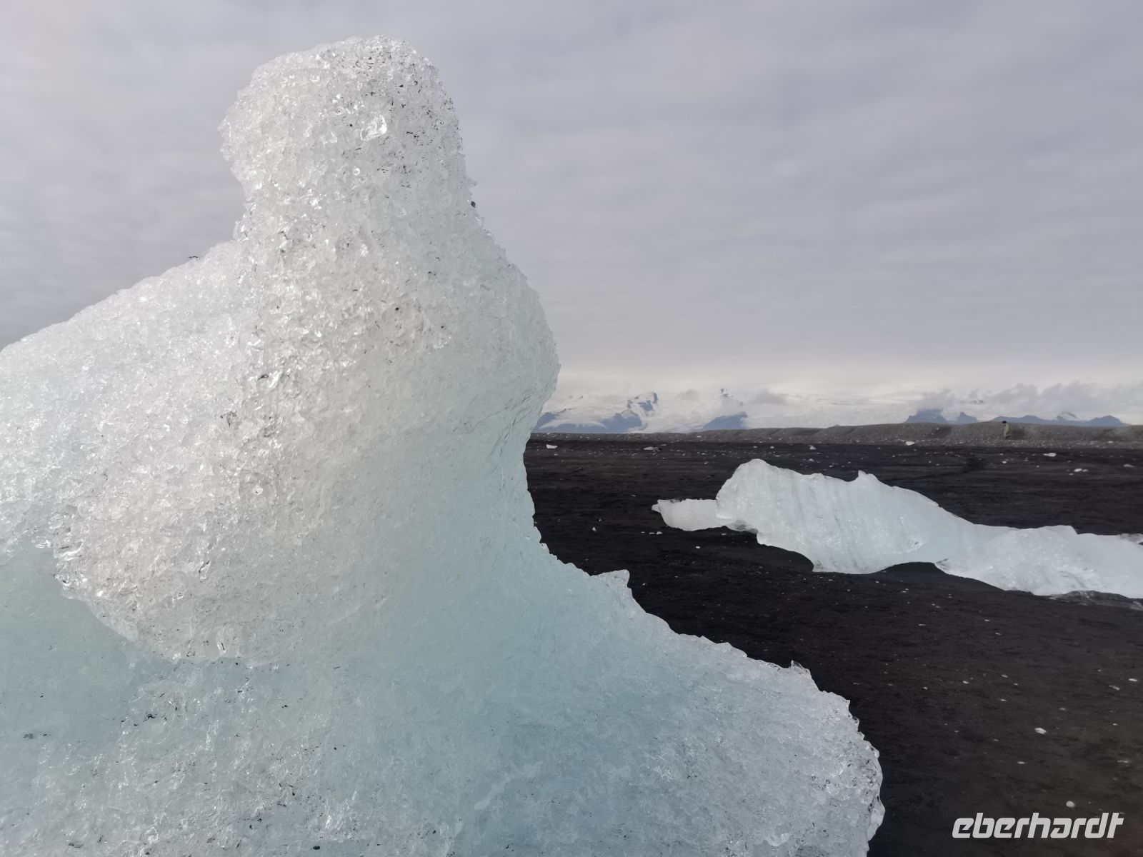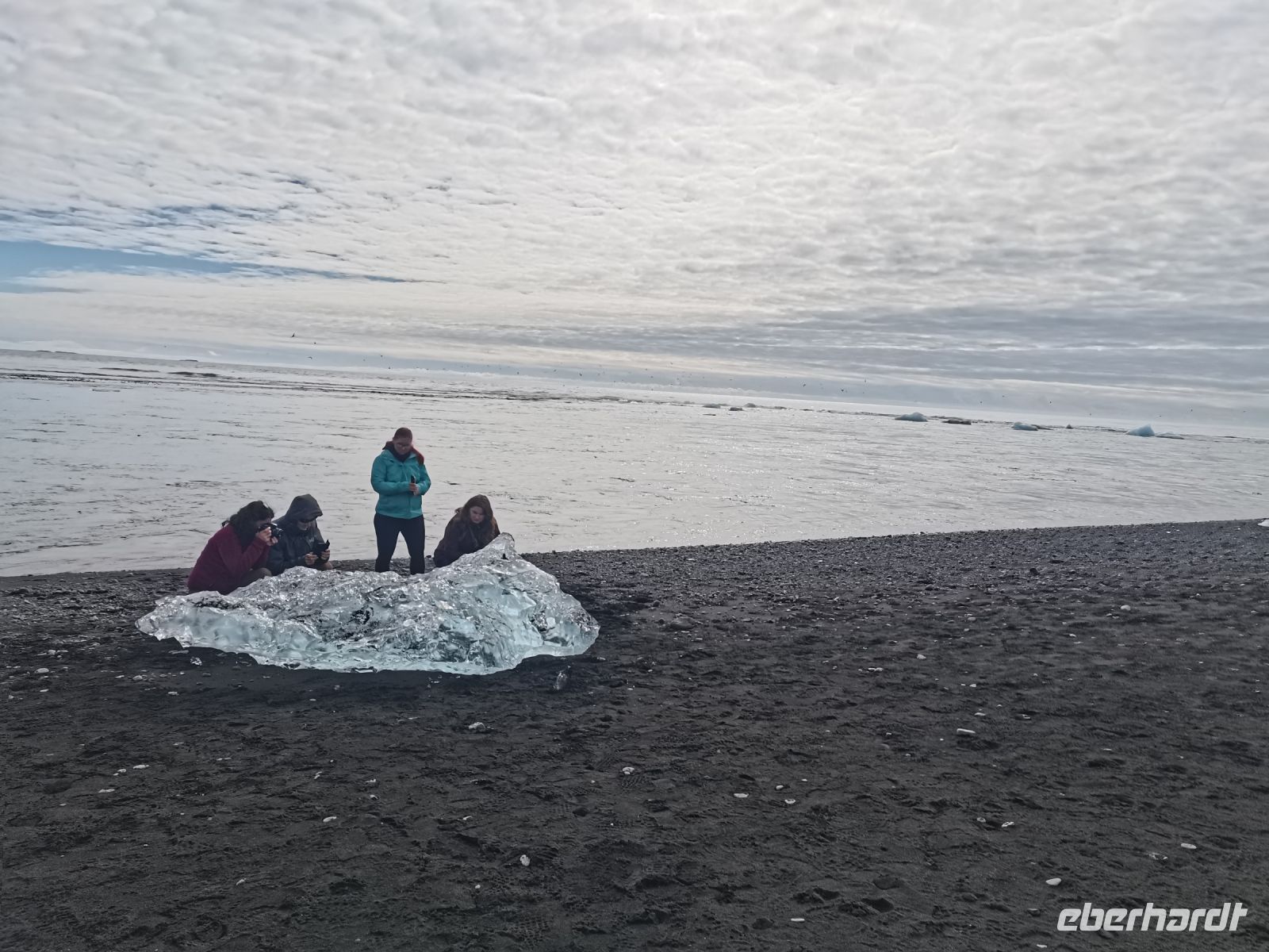 Nach der spektakulären Bootsfahrt erwartet uns am Bus ein Gläschen des isländischen Schnaps Brennivin mit original Gletscher-Eiswürfeln und kleinen Snacks aus proteinreichem Trockenfisch und Lavaboden-Brot. Anschließend sehen wir uns den nahen Strand hinter der Brücke über die Lagune an. Riesige Eisbrocken ragen am Strand hervor oder schwimmen im Wasser. Eine spektakuläre Szenerie liegt vor unseren Augen.