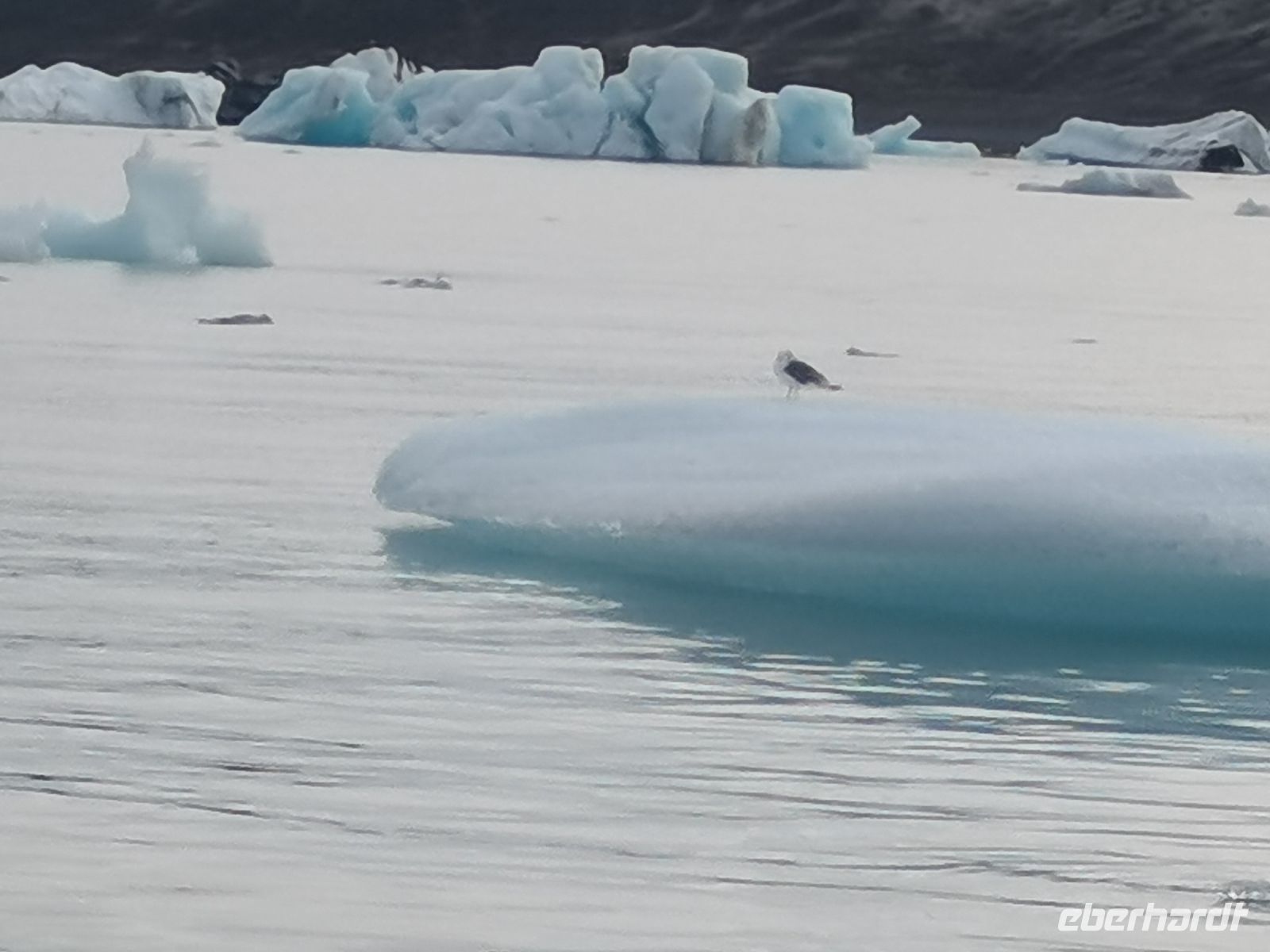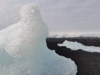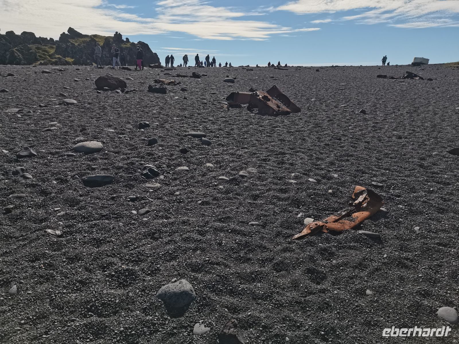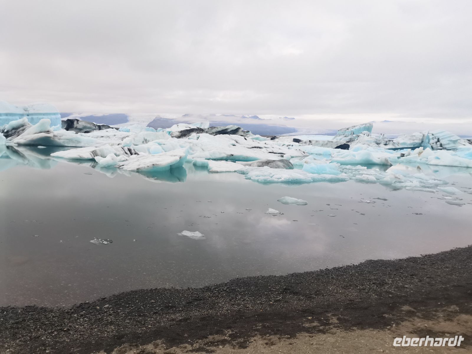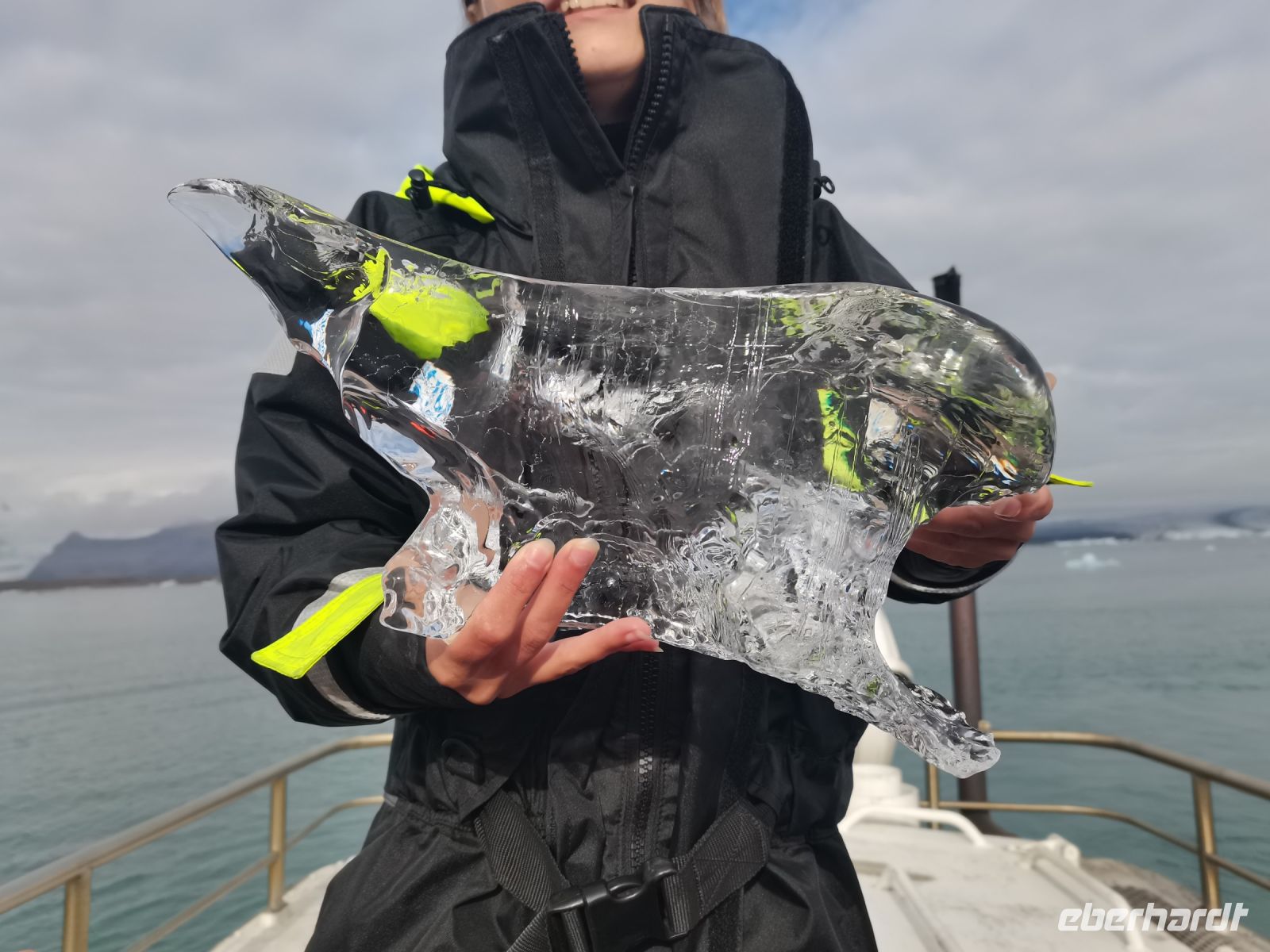 Nach der spektakulären Bootsfahrt erwartet uns am Bus ein Gläschen des isländischen Schnaps Brennivin mit original Gletscher-Eiswürfeln und kleinen Snacks aus proteinreichem Trockenfisch und Lavaboden-Brot. Anschließend sehen wir uns den nahen Strand hinter der Brücke über die Lagune an. Riesige Eisbrocken ragen am Strand hervor oder schwimmen im Wasser. Eine spektakuläre Szenerie liegt vor unseren Augen.