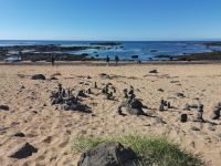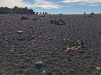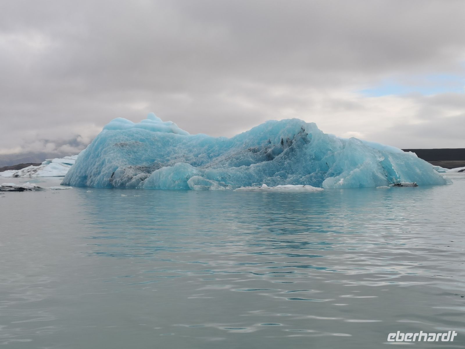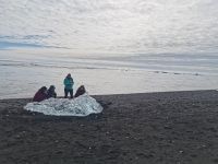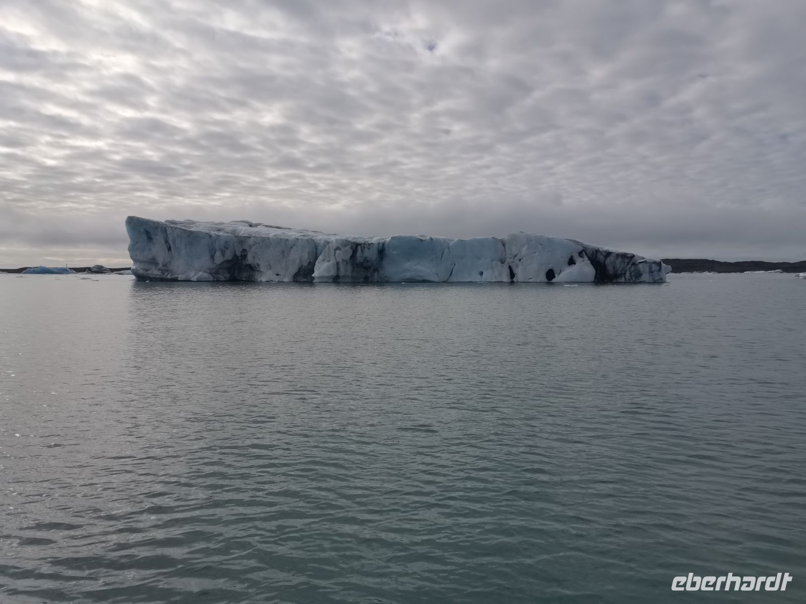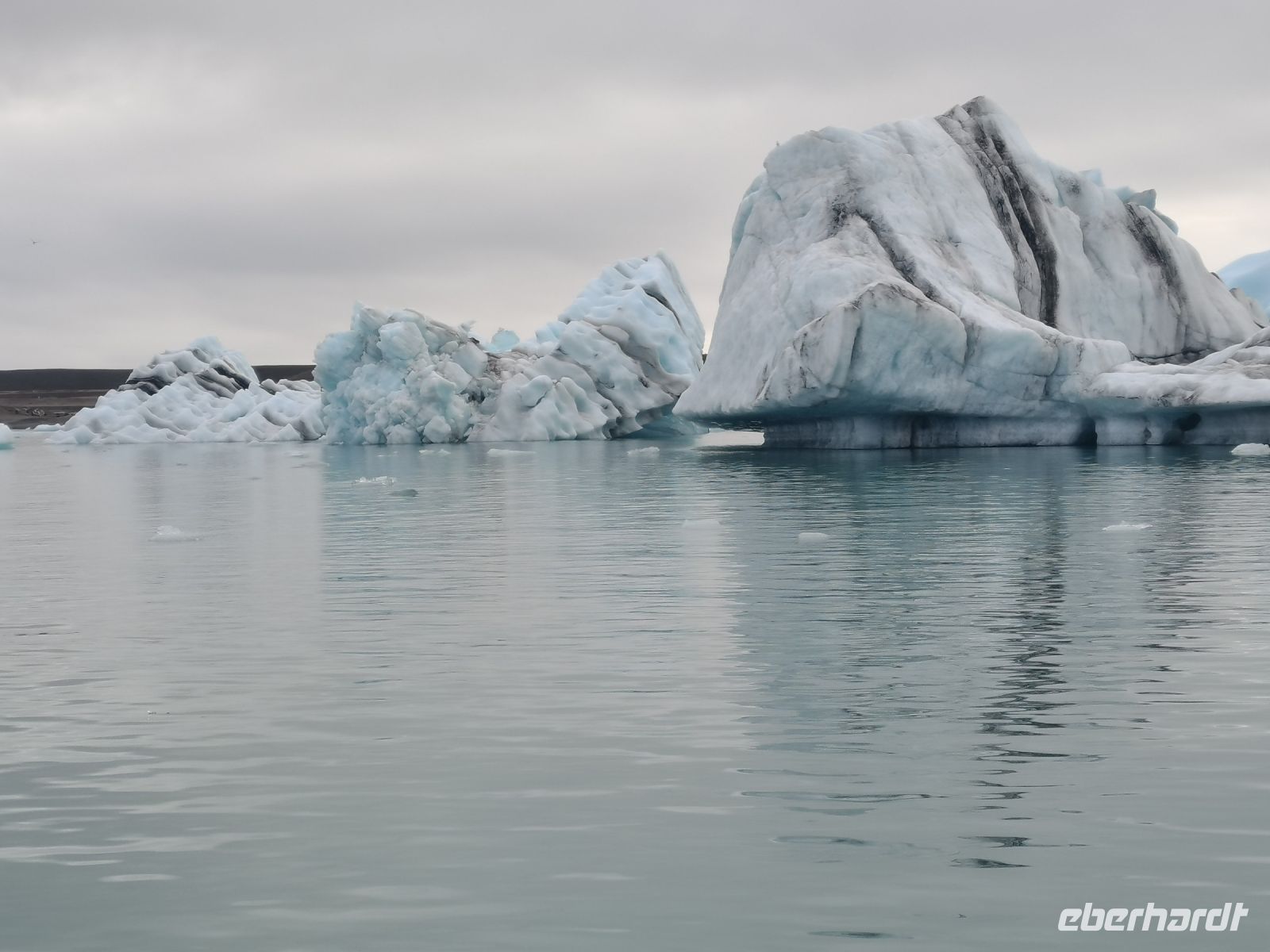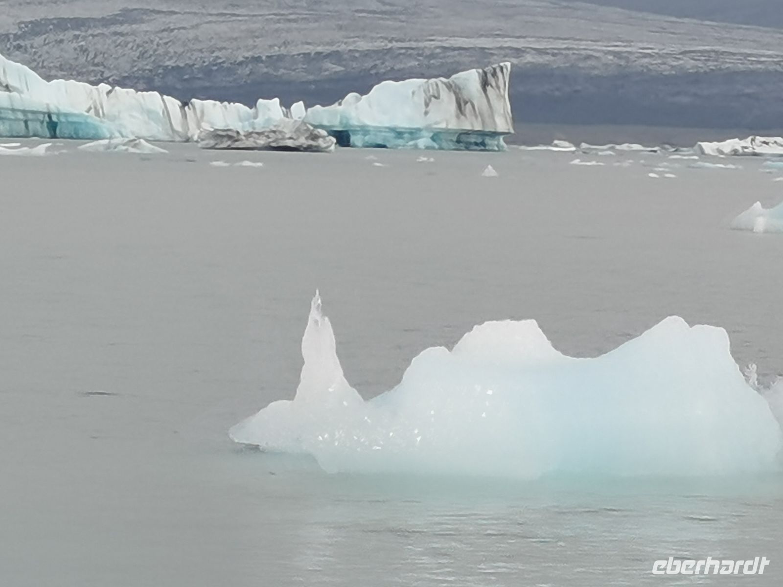 Nach der spektakulären Bootsfahrt erwartet uns am Bus ein Gläschen des isländischen Schnaps Brennivin mit original Gletscher-Eiswürfeln und kleinen Snacks aus proteinreichem Trockenfisch und Lavaboden-Brot. Anschließend sehen wir uns den nahen Strand hinter der Brücke über die Lagune an. Riesige Eisbrocken ragen am Strand hervor oder schwimmen im Wasser. Eine spektakuläre Szenerie liegt vor unseren Augen.