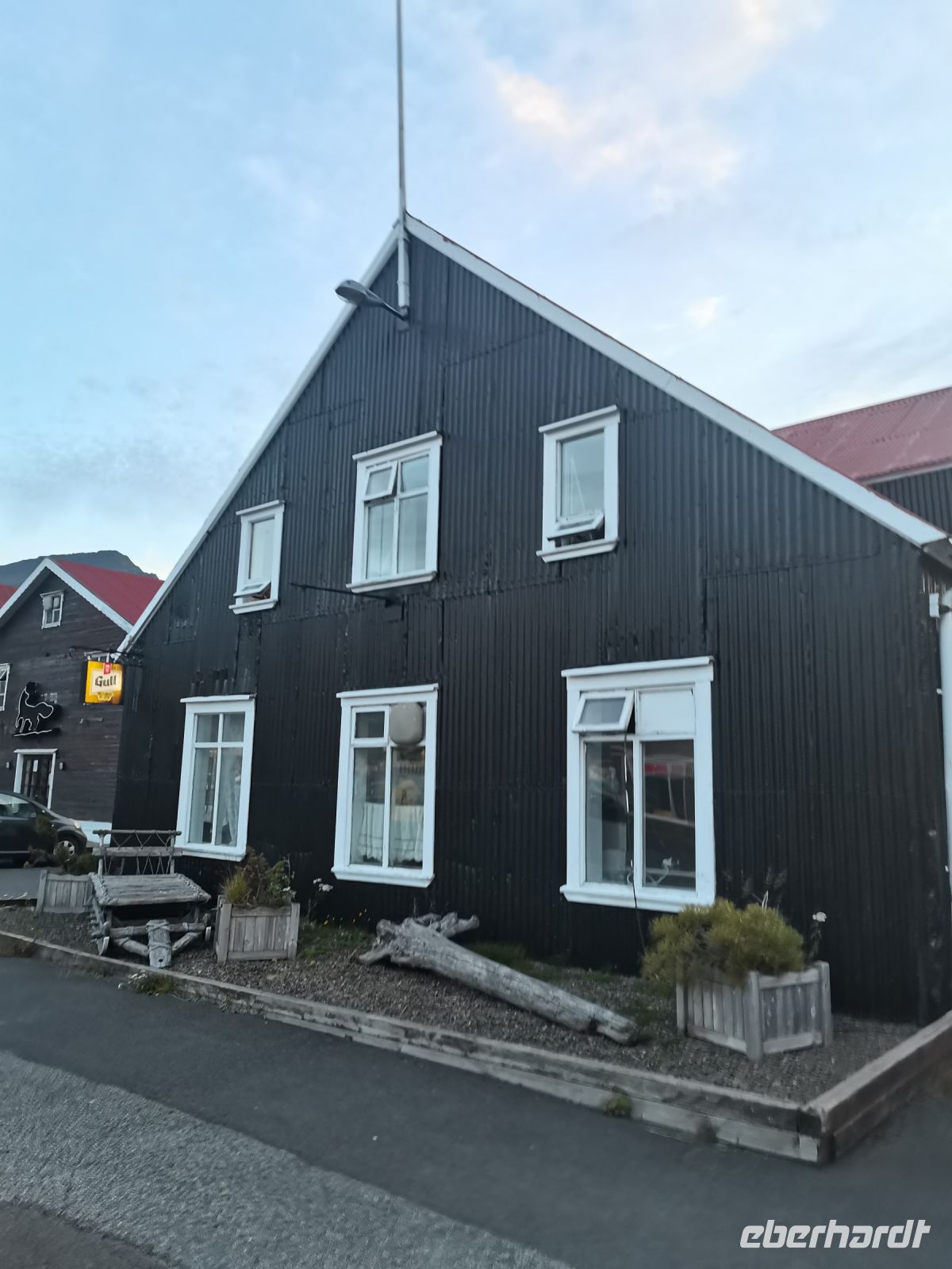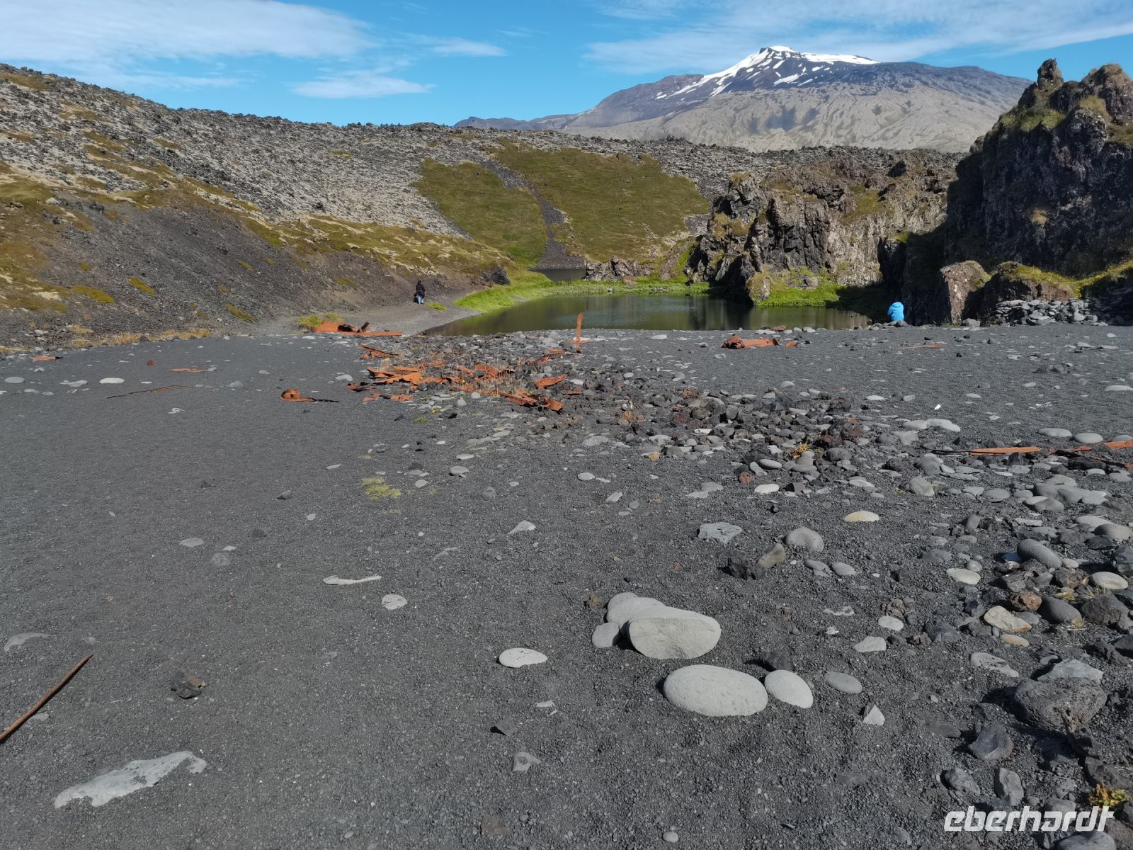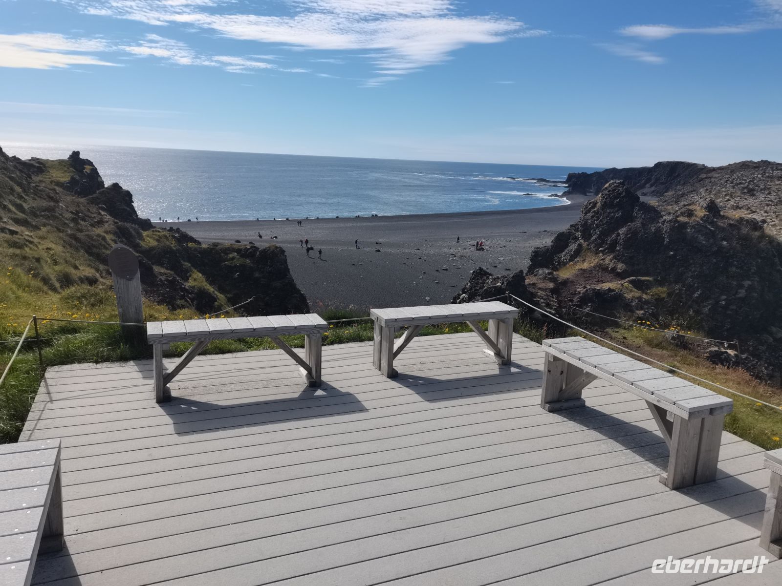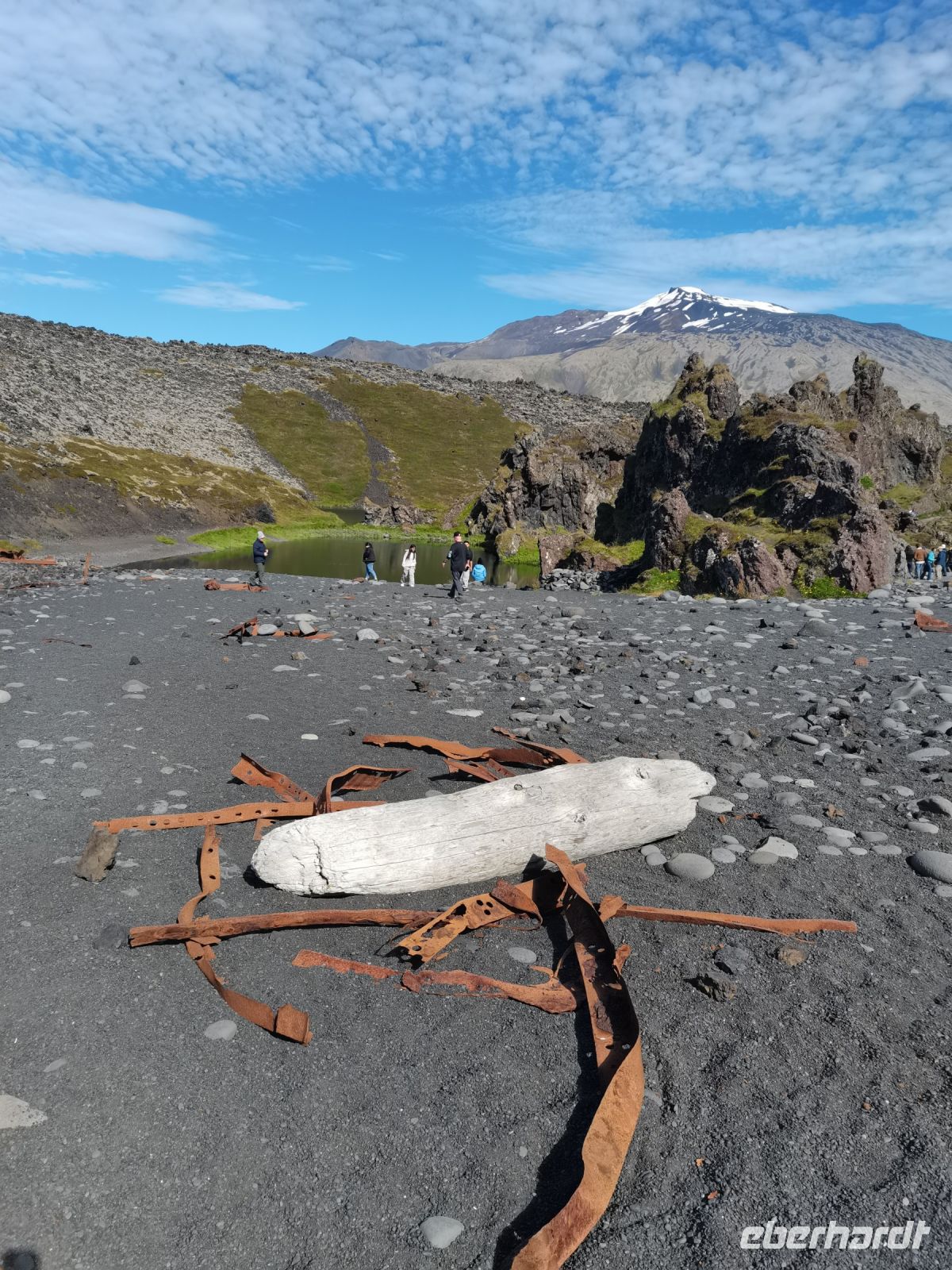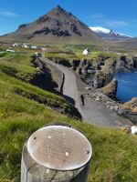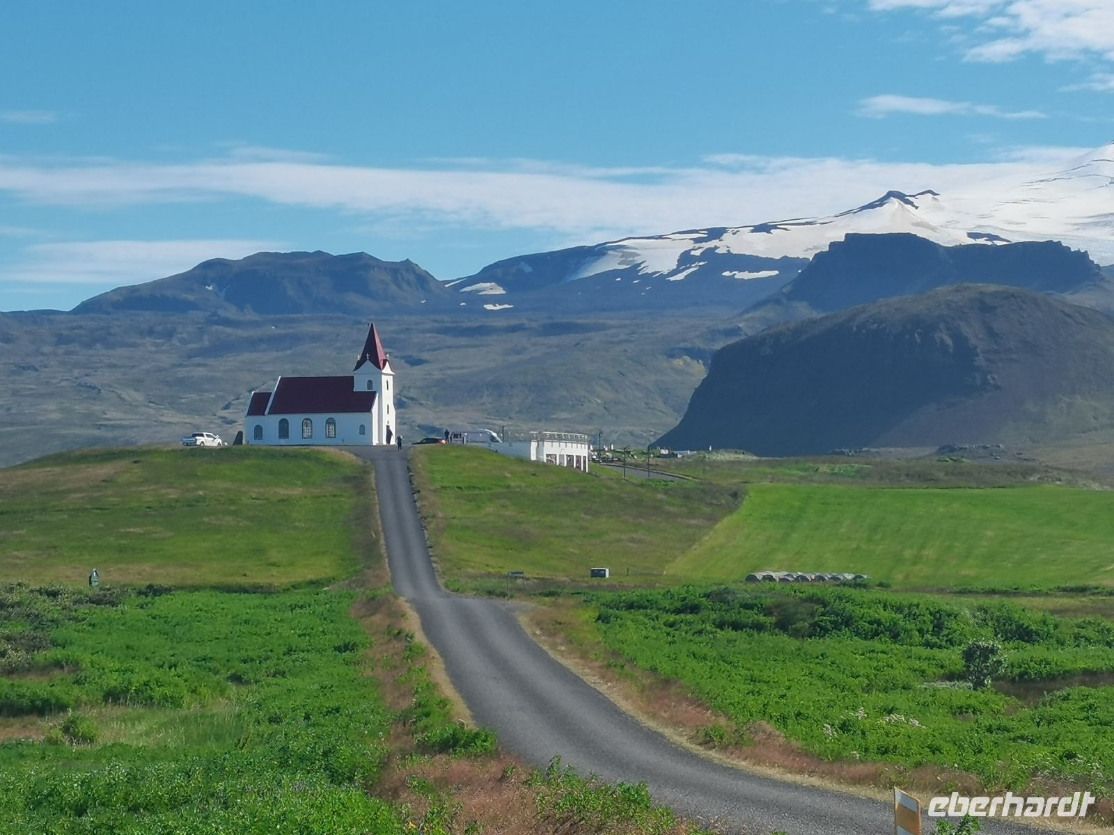 Der nächste Halt ist mitten im Nationalpark Snæfellsjökull an der Bucht Djúpalónssandur. Hier soll ein Schiffswrack liegen. Wir steigen einen zerklüfteten Felspfad hinunter. Die Formen erinnern an Skulpturen und Trolle. Wir gelangen schnell in eine weite Bucht mit schwarzem Sand und einem kleinen See. Tatsächlich liegen hier verstreut die Teile eines britischen Schiffswracks von 1948. Sie erinnern an die vielen Toten, die hier beim Schiffsbruch ums Leben gekommen sind. In der breiten Bucht auf der Halbinsel Snaefellsnes lagen einst viele Fischerboote, doch die Arbeit war hart und gefährlich, weshalb die Fischer aus den einstigen Dörfern weggezogen sind. Auf der Weiterfahrt bieten sich immer neue atemberaubende Ausblicke.Wir machen einen kurzen Stopp im ehemaligen Fischerort Ólafsvik. Hier stehen eine moderne Kirche und eines der ältesten Häuser Islands. Heute ist das zweistöckige Holzhaus von 1844 ein Museum.