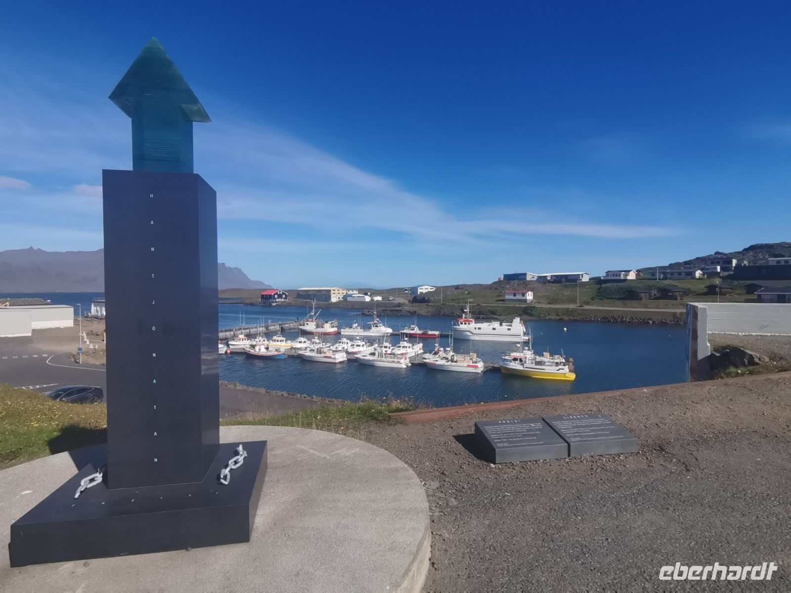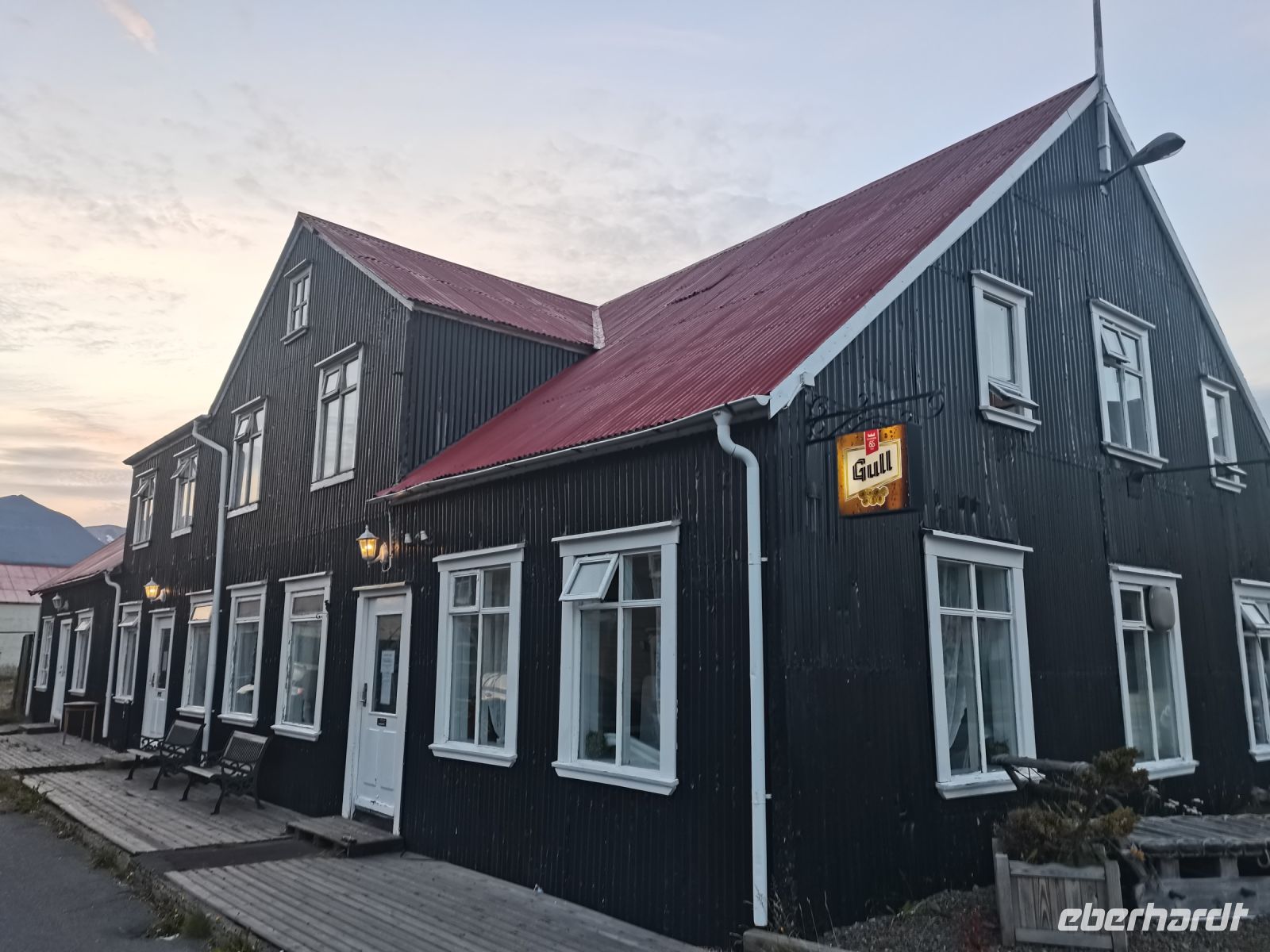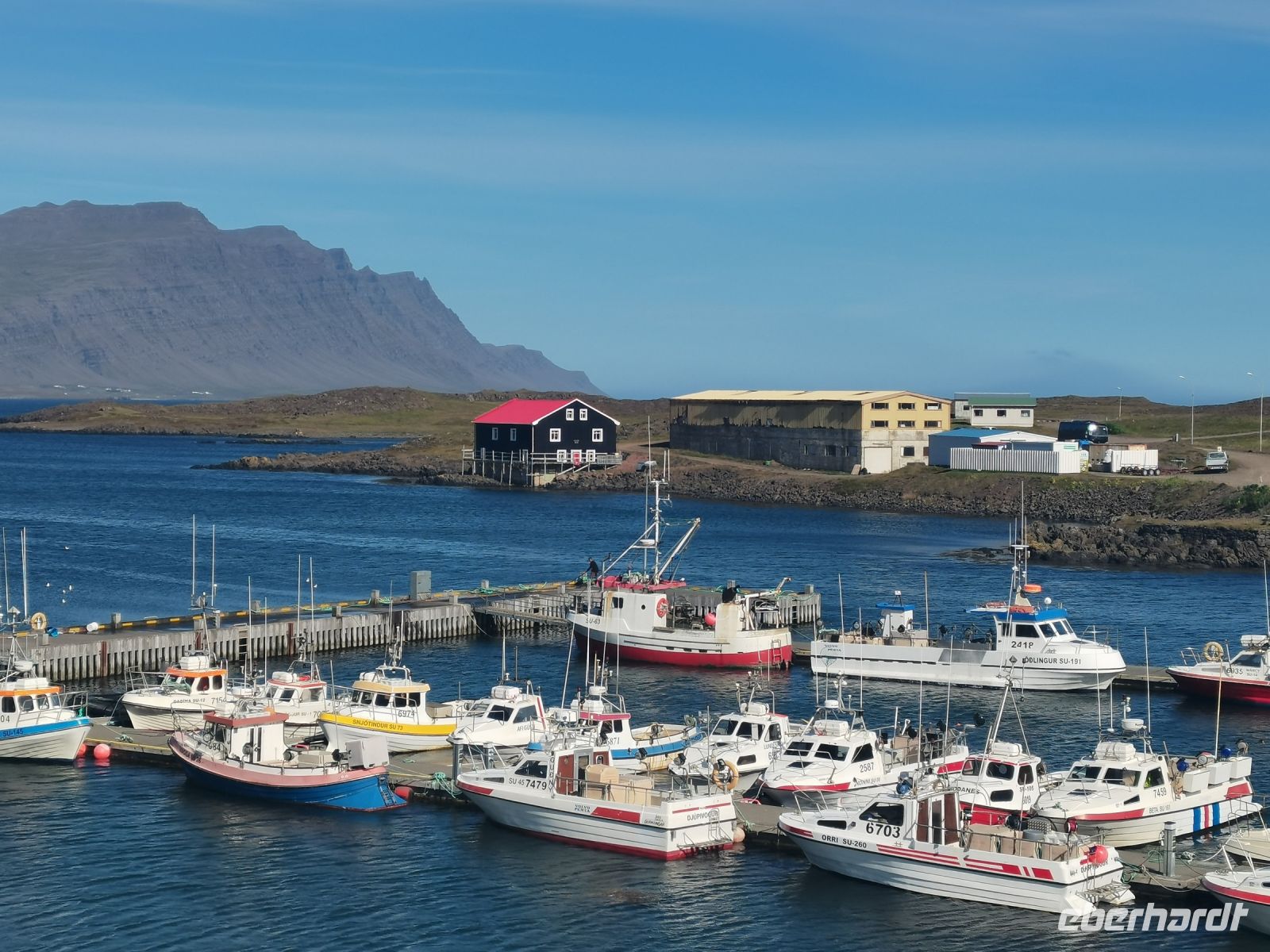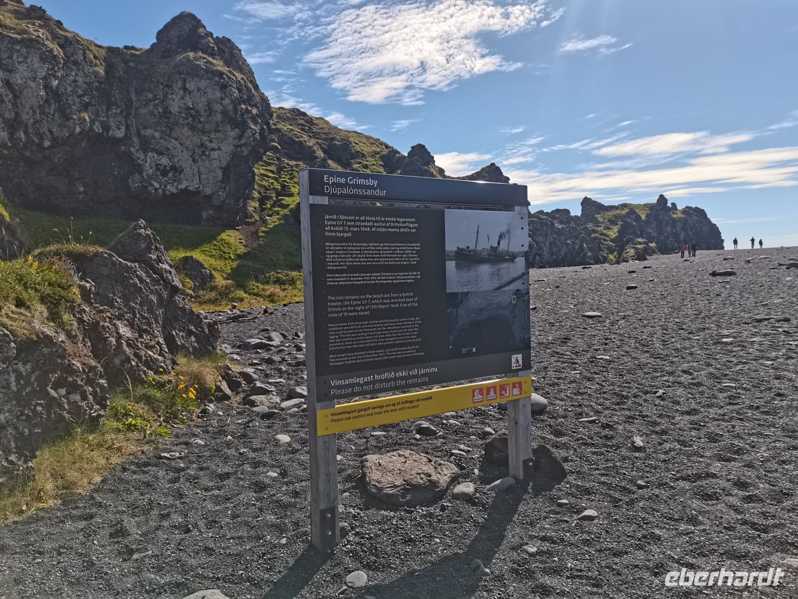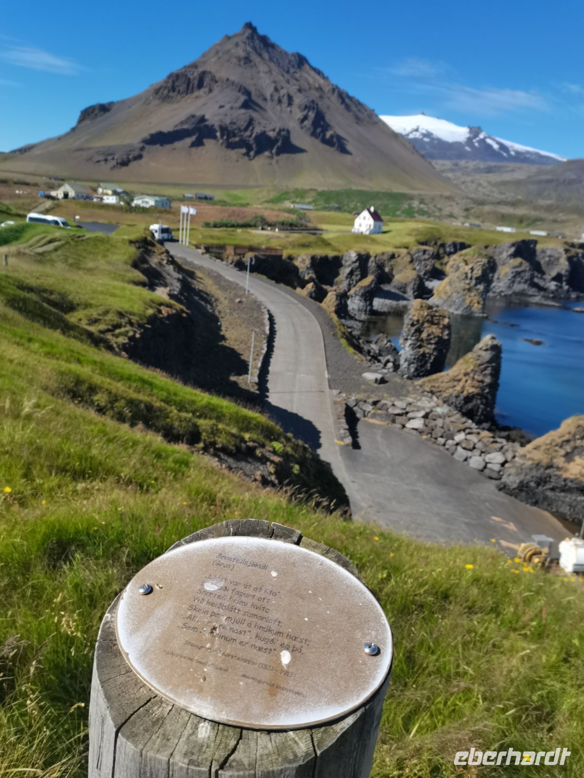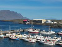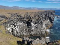 Der nächste Halt ist mitten im Nationalpark Snæfellsjökull an der Bucht Djúpalónssandur. Hier soll ein Schiffswrack liegen. Wir steigen einen zerklüfteten Felspfad hinunter. Die Formen erinnern an Skulpturen und Trolle. Wir gelangen schnell in eine weite Bucht mit schwarzem Sand und einem kleinen See. Tatsächlich liegen hier verstreut die Teile eines britischen Schiffswracks von 1948. Sie erinnern an die vielen Toten, die hier beim Schiffsbruch ums Leben gekommen sind. In der breiten Bucht auf der Halbinsel Snaefellsnes lagen einst viele Fischerboote, doch die Arbeit war hart und gefährlich, weshalb die Fischer aus den einstigen Dörfern weggezogen sind. Auf der Weiterfahrt bieten sich immer neue atemberaubende Ausblicke.Wir machen einen kurzen Stopp im ehemaligen Fischerort Ólafsvik. Hier stehen eine moderne Kirche und eines der ältesten Häuser Islands. Heute ist das zweistöckige Holzhaus von 1844 ein Museum.