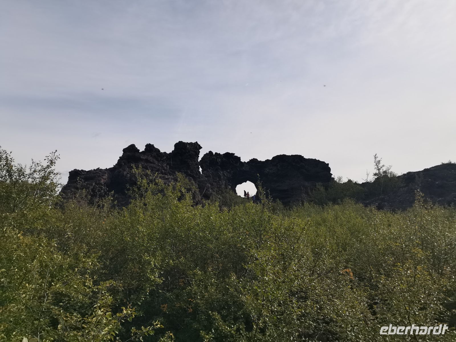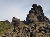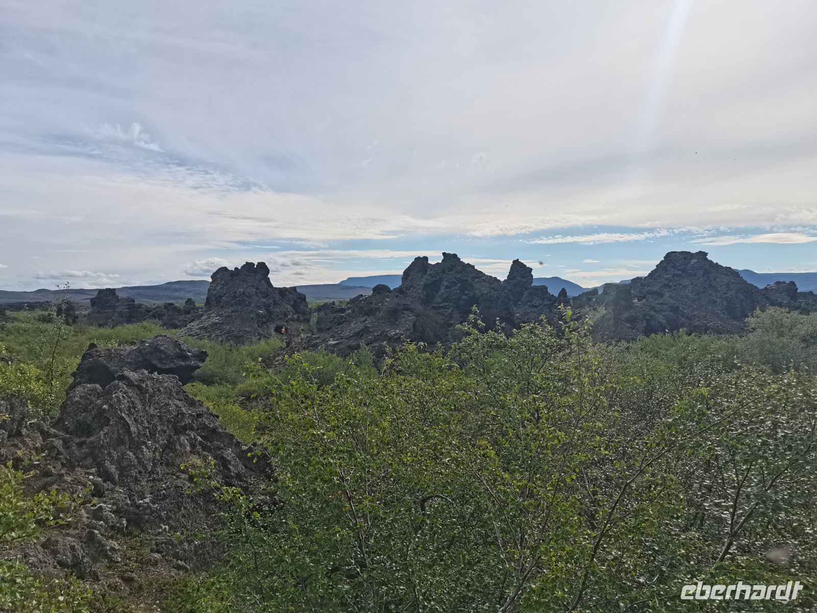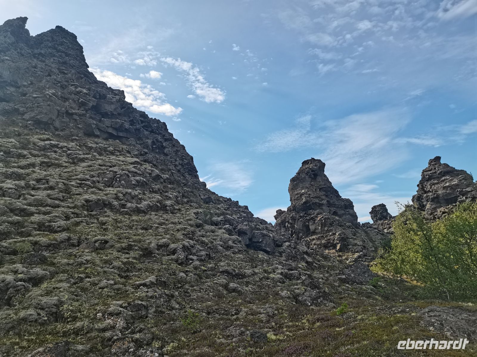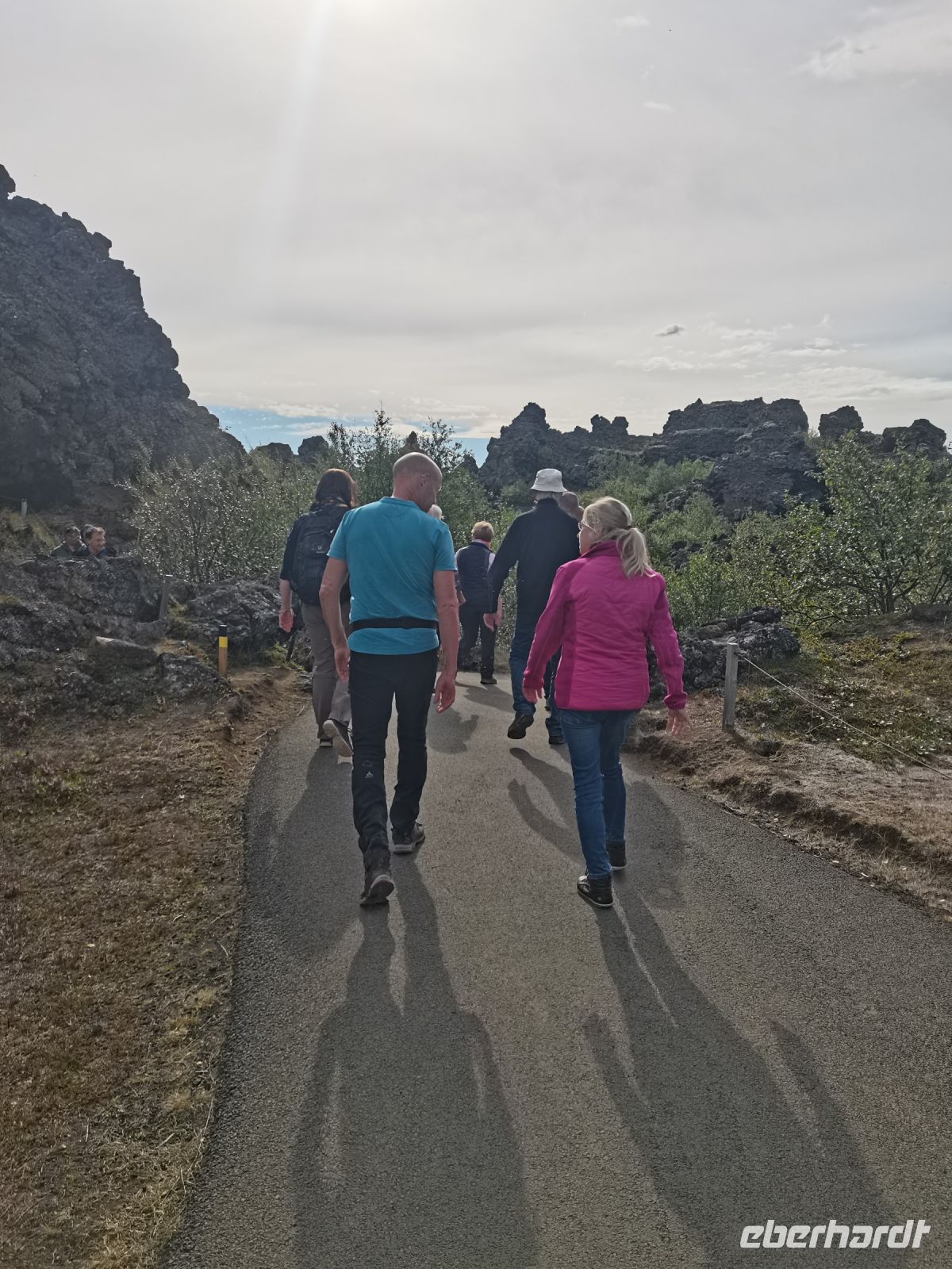 Nach einer kurzen Fahrt erreichen wir das Felslabyrinth Dimmuborgir. Der Name bedeutet "Dunkle Burgen", und wir hören viele Geschichten über Trolle, die teils versteinert in den zerklüfteten Felsformationen zu entdecken sind. Tatsächlich handelt es sich bei diesen Felsen um erstarrte Lava, in der sich inzwischen Pflanzen angesiedelt haben. Darunter sind auch viele Steinpilze, die uns sofort ins Auge springen. Das Gebiet soll die Heimat der 13 isländischen Weihnachtsmänner und vieler Trolle sein, von denen wir auf unserer Reise immer wieder zu hören bekommen.