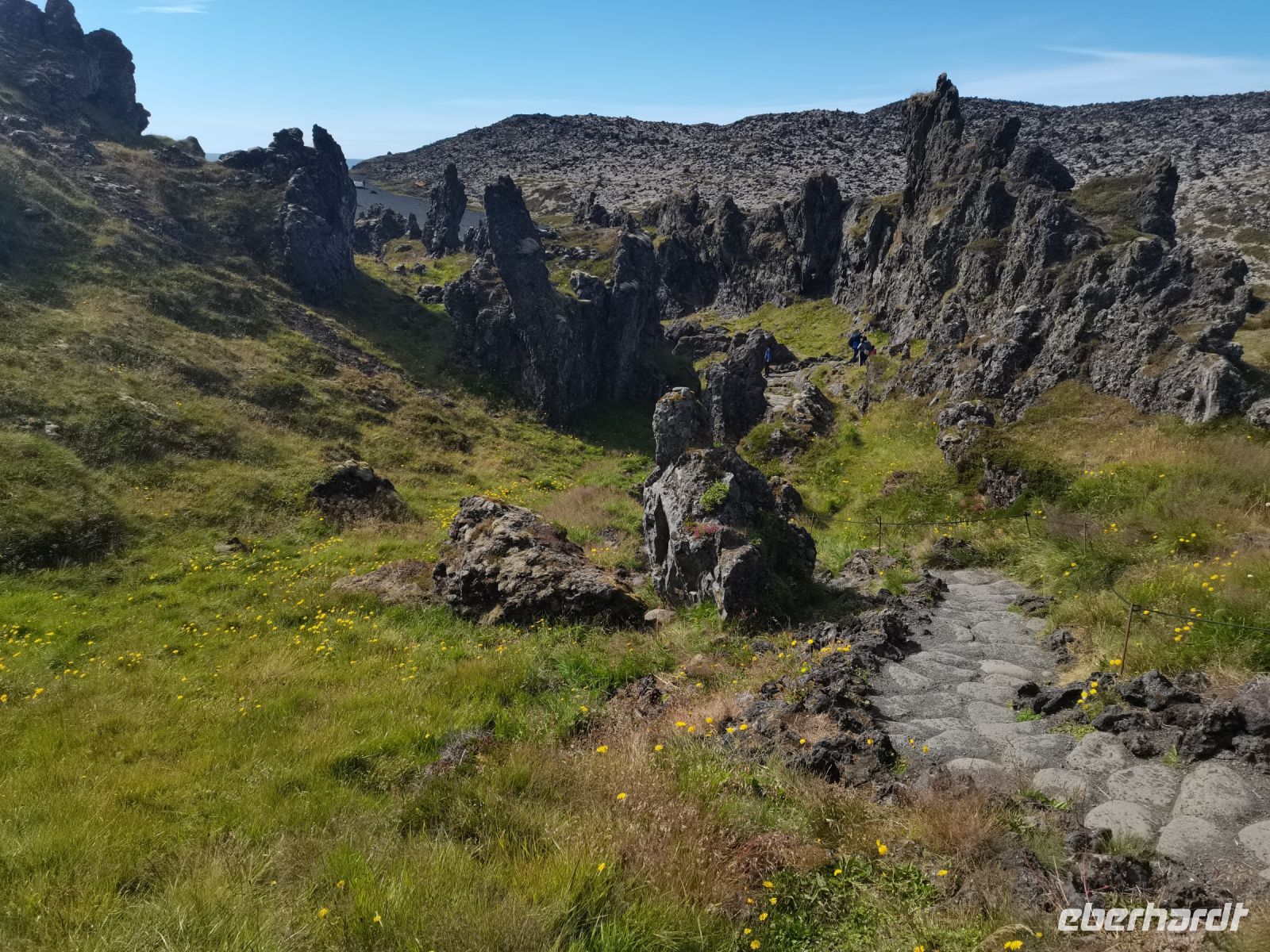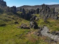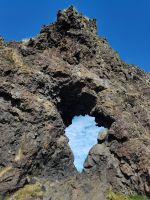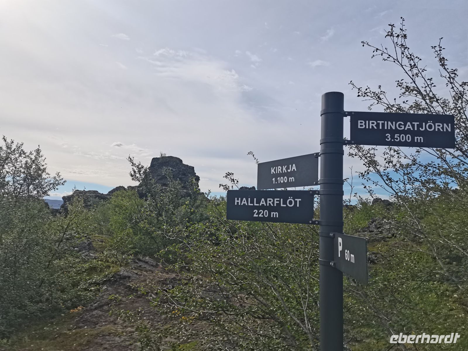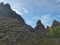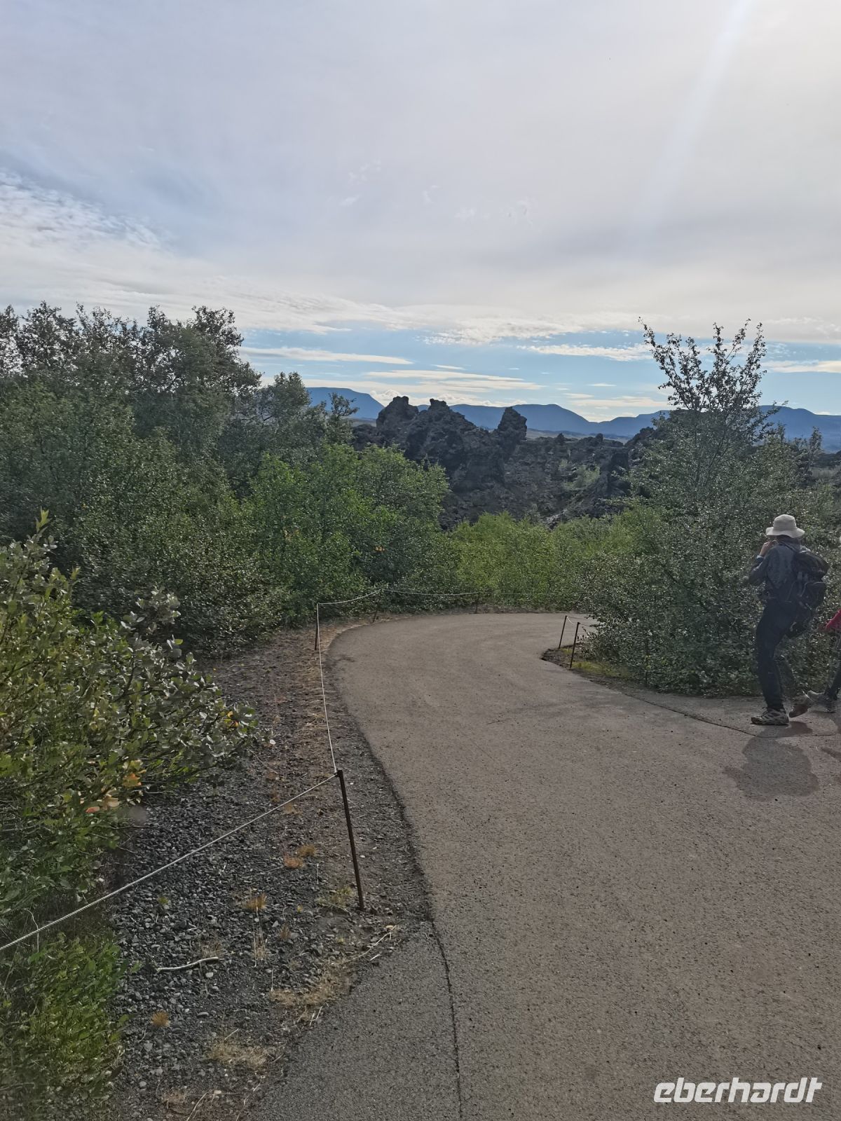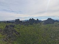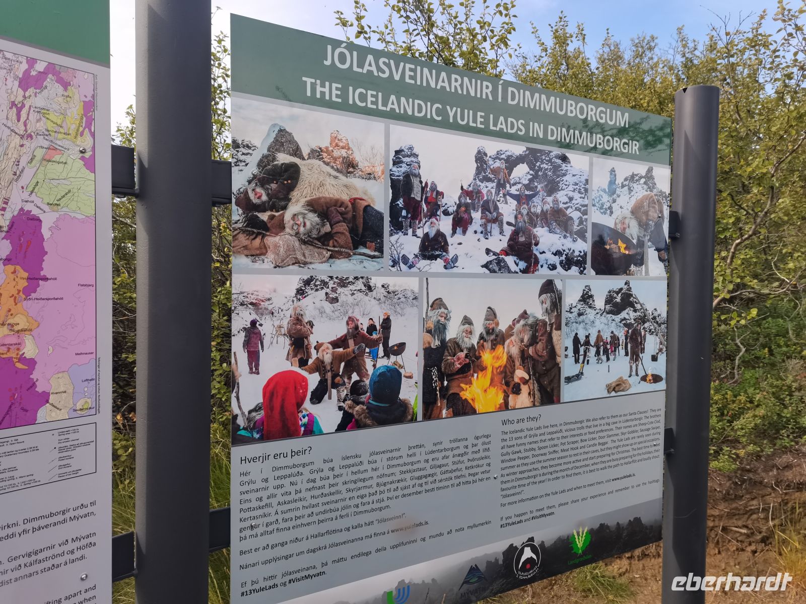 Nach einer kurzen Fahrt erreichen wir das Felslabyrinth Dimmuborgir. Der Name bedeutet "Dunkle Burgen", und wir hören viele Geschichten über Trolle, die teils versteinert in den zerklüfteten Felsformationen zu entdecken sind. Tatsächlich handelt es sich bei diesen Felsen um erstarrte Lava, in der sich inzwischen Pflanzen angesiedelt haben. Darunter sind auch viele Steinpilze, die uns sofort ins Auge springen. Das Gebiet soll die Heimat der 13 isländischen Weihnachtsmänner und vieler Trolle sein, von denen wir auf unserer Reise immer wieder zu hören bekommen.
