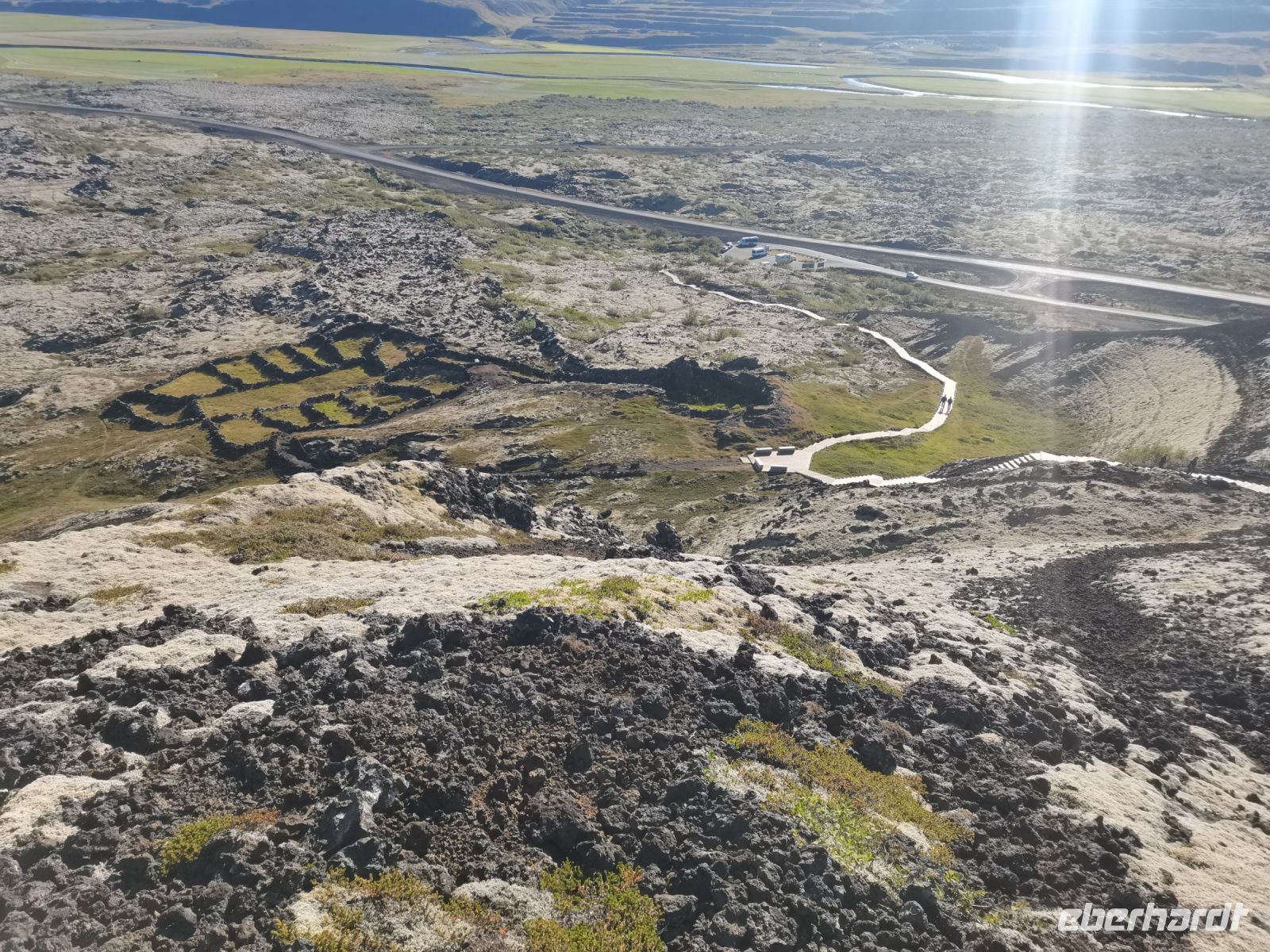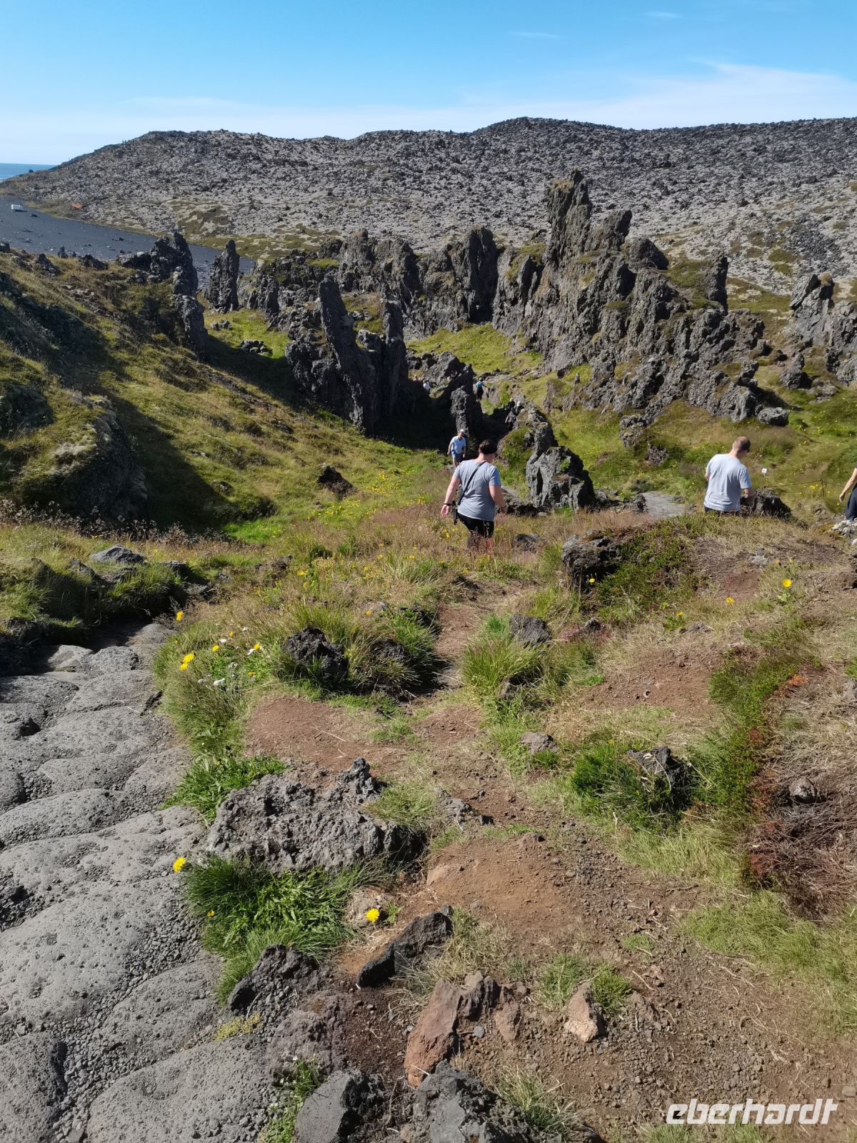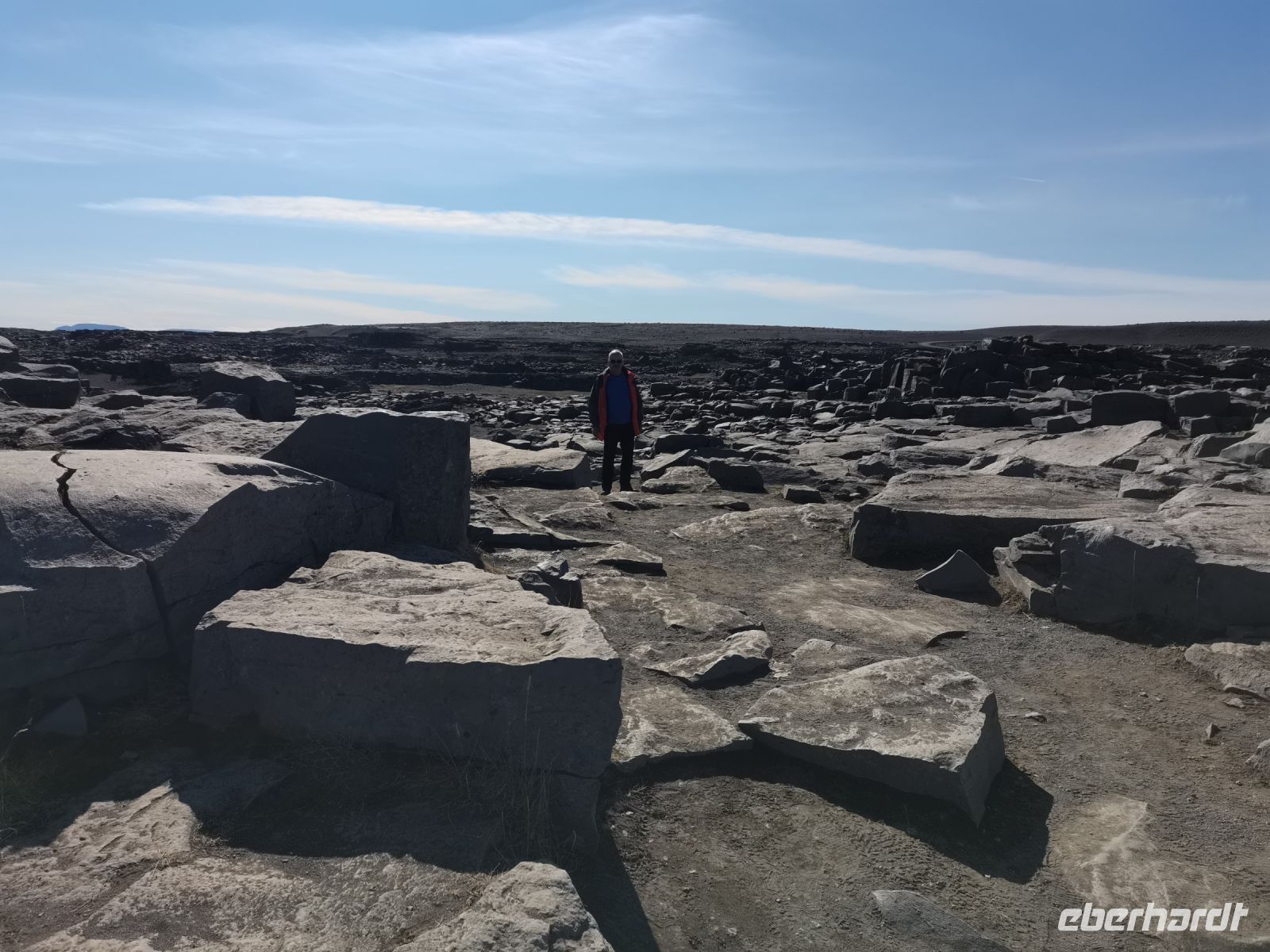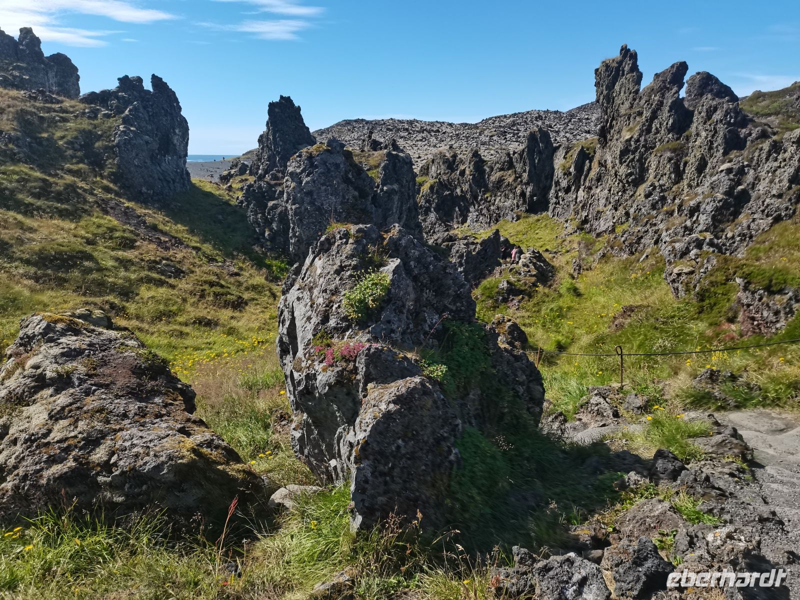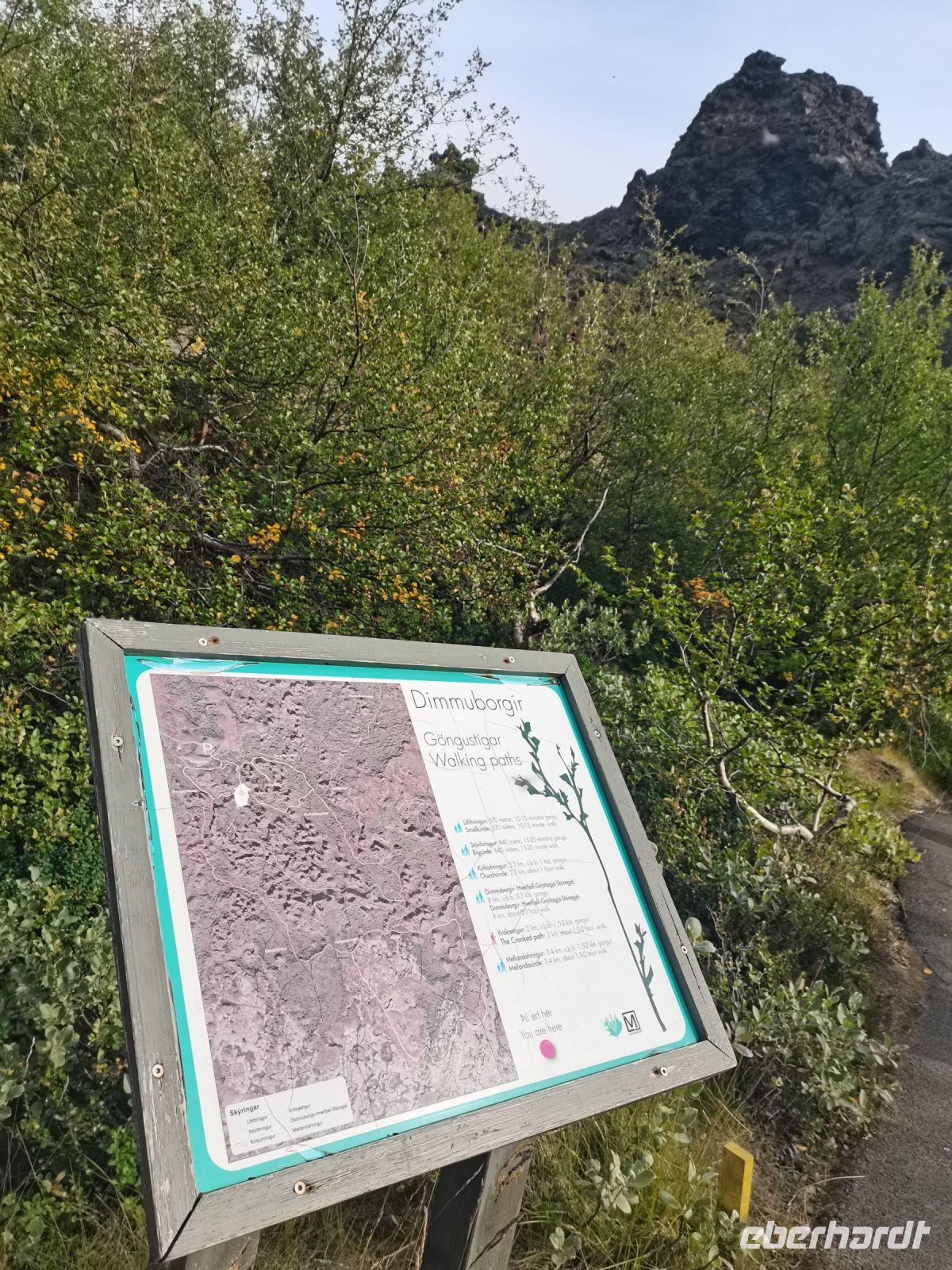 Nach einer kurzen Fahrt erreichen wir das Felslabyrinth Dimmuborgir. Der Name bedeutet "Dunkle Burgen", und wir hören viele Geschichten über Trolle, die teils versteinert in den zerklüfteten Felsformationen zu entdecken sind. Tatsächlich handelt es sich bei diesen Felsen um erstarrte Lava, in der sich inzwischen Pflanzen angesiedelt haben. Darunter sind auch viele Steinpilze, die uns sofort ins Auge springen. Das Gebiet soll die Heimat der 13 isländischen Weihnachtsmänner und vieler Trolle sein, von denen wir auf unserer Reise immer wieder zu hören bekommen.