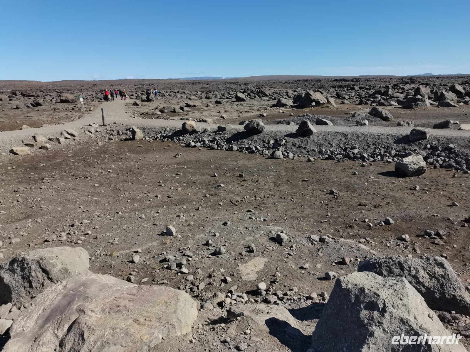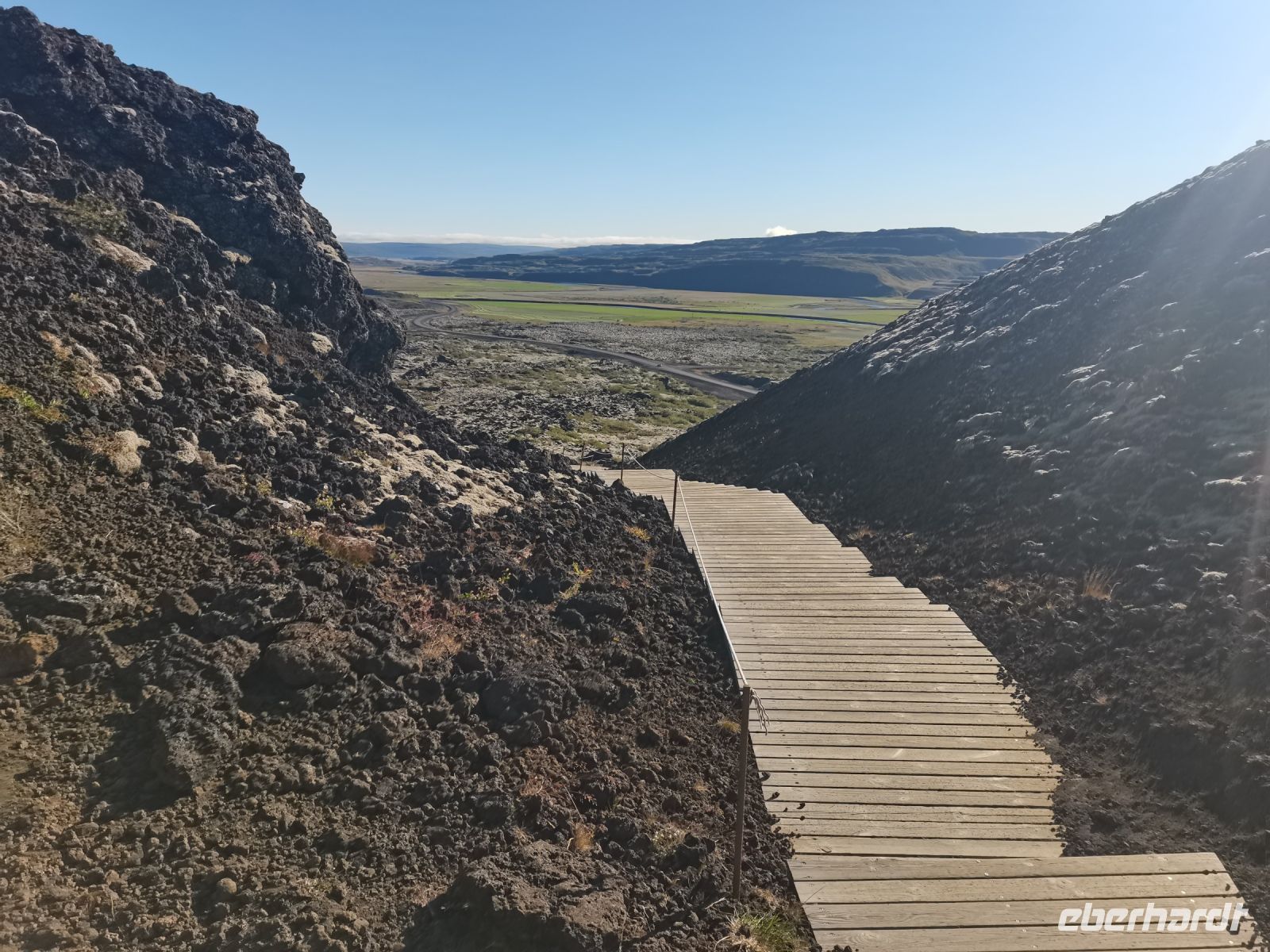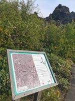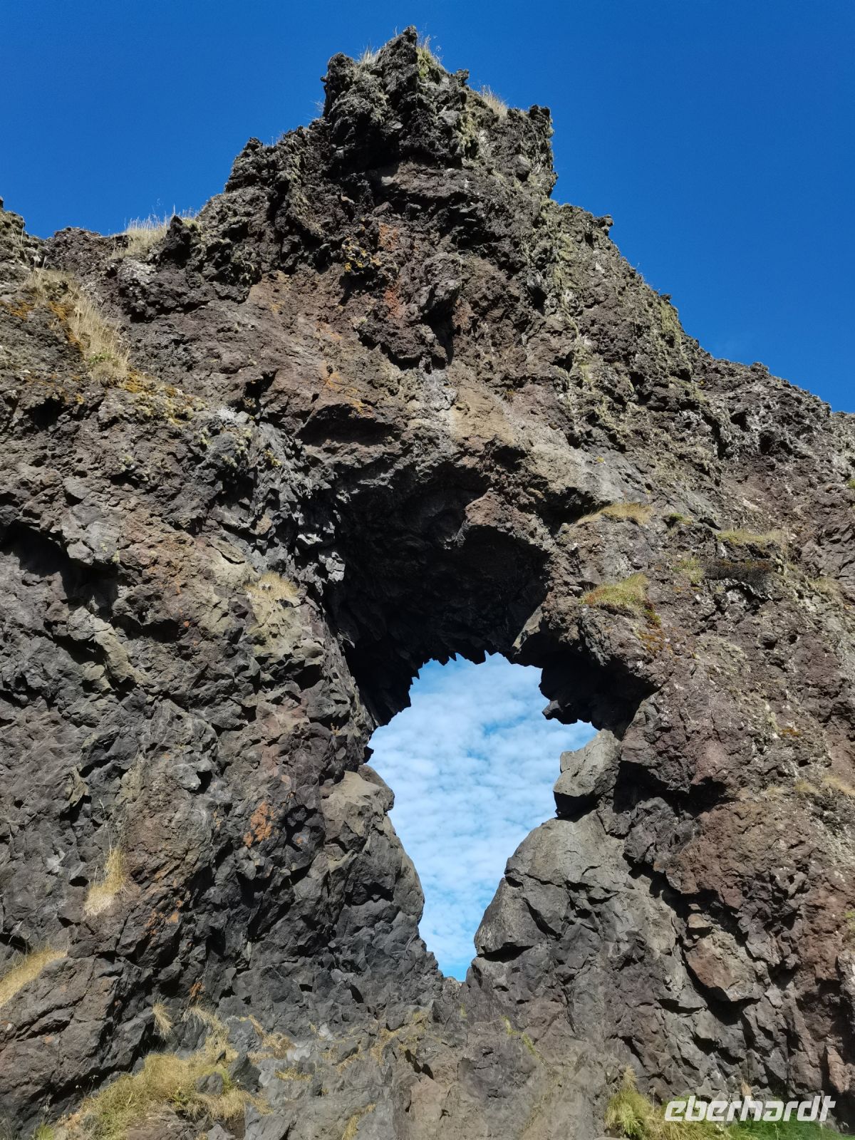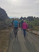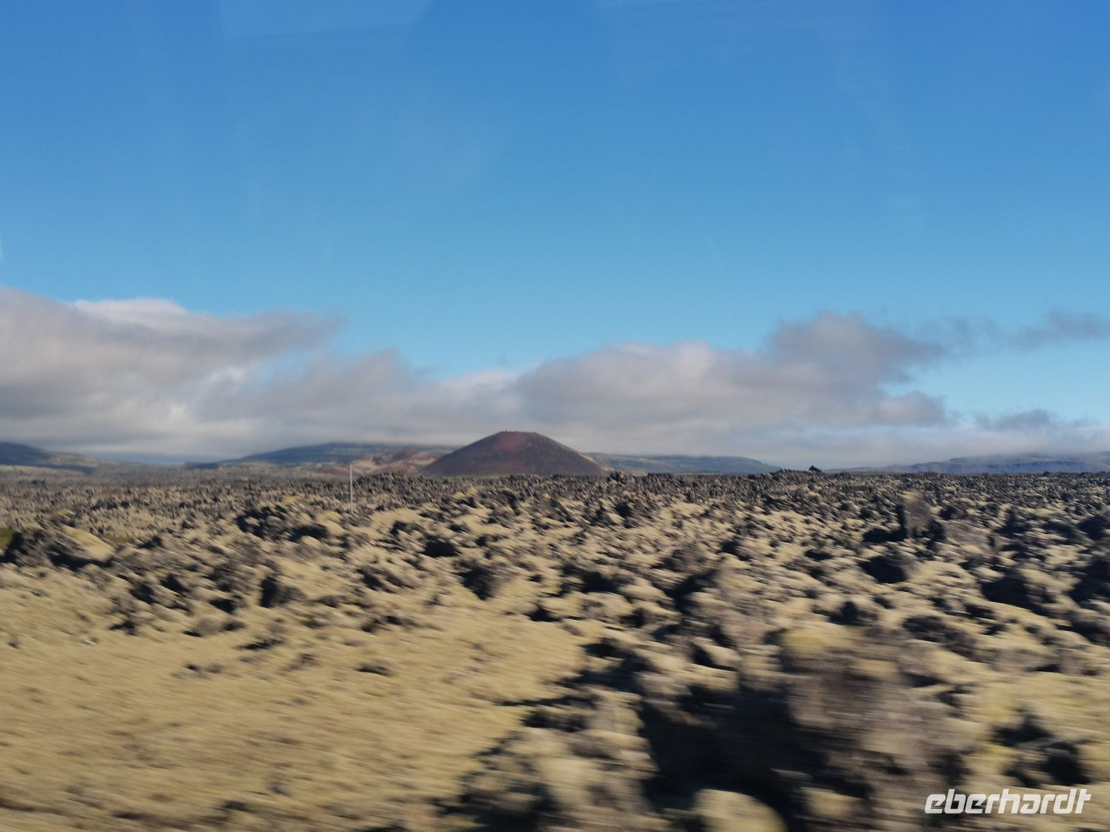 Nach einer kurzen Fahrt erreichen wir das Felslabyrinth Dimmuborgir. Der Name bedeutet "Dunkle Burgen", und wir hören viele Geschichten über Trolle, die teils versteinert in den zerklüfteten Felsformationen zu entdecken sind. Tatsächlich handelt es sich bei diesen Felsen um erstarrte Lava, in der sich inzwischen Pflanzen angesiedelt haben. Darunter sind auch viele Steinpilze, die uns sofort ins Auge springen. Das Gebiet soll die Heimat der 13 isländischen Weihnachtsmänner und vieler Trolle sein, von denen wir auf unserer Reise immer wieder zu hören bekommen.