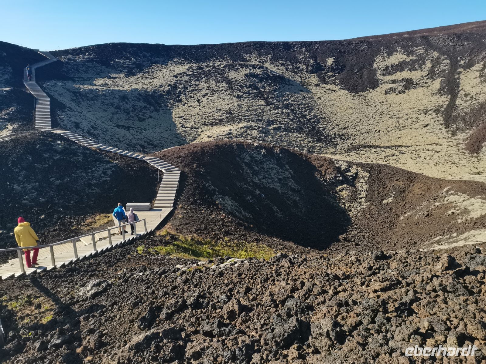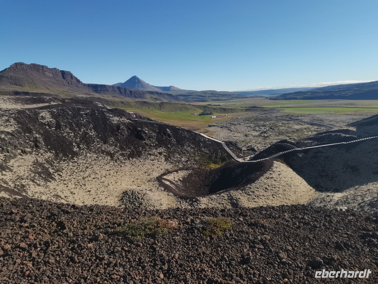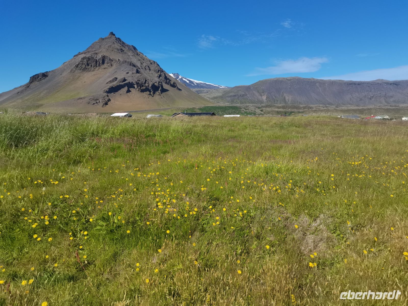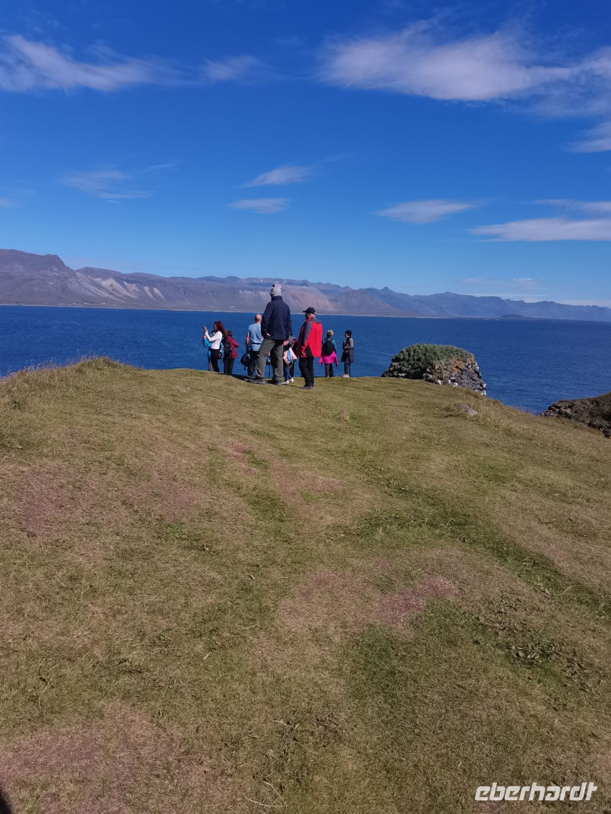 Nach dem Frühstück brechen wir bei strahlender Sonne auf, um die Halbinsel Snaefellsnes weiter zu erkunden. Wir freuen uns auf eine Vulkanwanderung am Krater Grabrok. Festes Schuhwerk und windfeste Jacken haben wir natürlich dabei. Bequeme Stufen bringen uns hoch zum Krater. Ein herrlicher Blick nach unten und eine enorme Weite in die unberührte Landschaft Islands eröffnen sich, als wir oben angekommen sind. Wir sind fast ganz für uns und genießen den atemberaubenden Blick. Ganz unten sehen wir eine alte Steinmauer, die einen Schafpferch umgibt. Die Vergangenheit ist in Island ganz nah, denn Schafe werden in Island noch heute im steinernen Pferch zusammengetrieben. Langsam schlendern wir die Treppen wieder hinunter zum Busparkplatz, denn heute gibt es viel zu sehen.