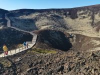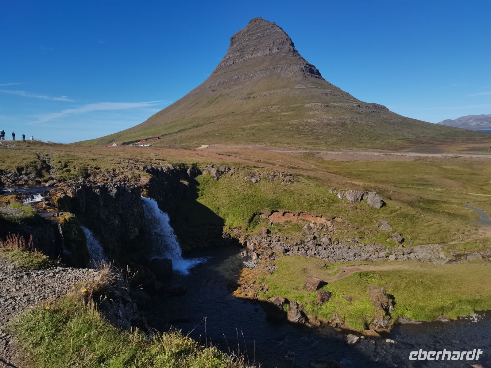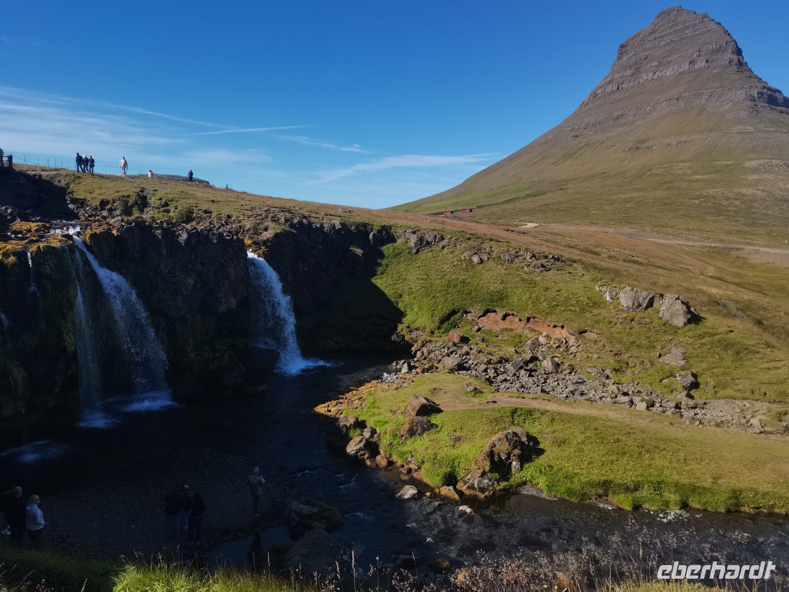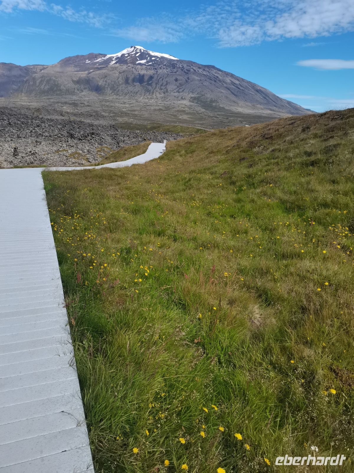 Nach dem Frühstück brechen wir bei strahlender Sonne auf, um die Halbinsel Snaefellsnes weiter zu erkunden. Wir freuen uns auf eine Vulkanwanderung am Krater Grabrok. Festes Schuhwerk und windfeste Jacken haben wir natürlich dabei. Bequeme Stufen bringen uns hoch zum Krater. Ein herrlicher Blick nach unten und eine enorme Weite in die unberührte Landschaft Islands eröffnen sich, als wir oben angekommen sind. Wir sind fast ganz für uns und genießen den atemberaubenden Blick. Ganz unten sehen wir eine alte Steinmauer, die einen Schafpferch umgibt. Die Vergangenheit ist in Island ganz nah, denn Schafe werden in Island noch heute im steinernen Pferch zusammengetrieben. Langsam schlendern wir die Treppen wieder hinunter zum Busparkplatz, denn heute gibt es viel zu sehen.