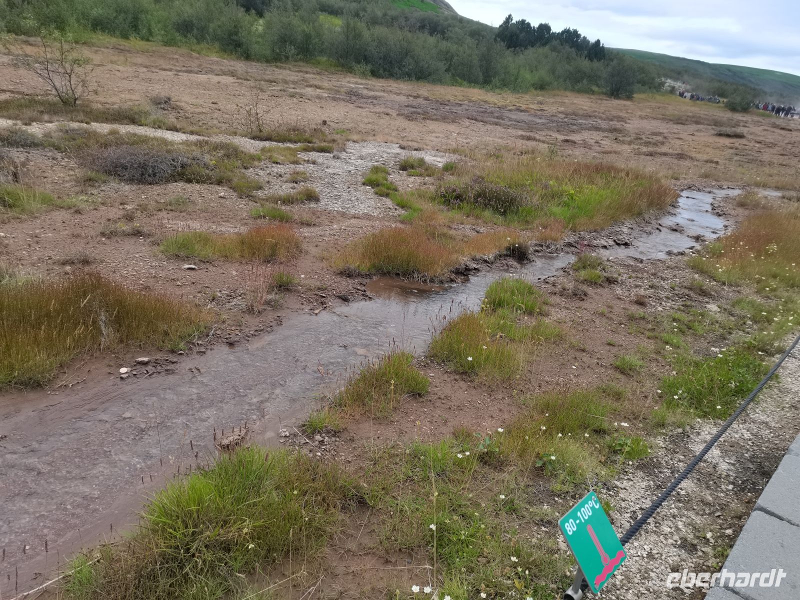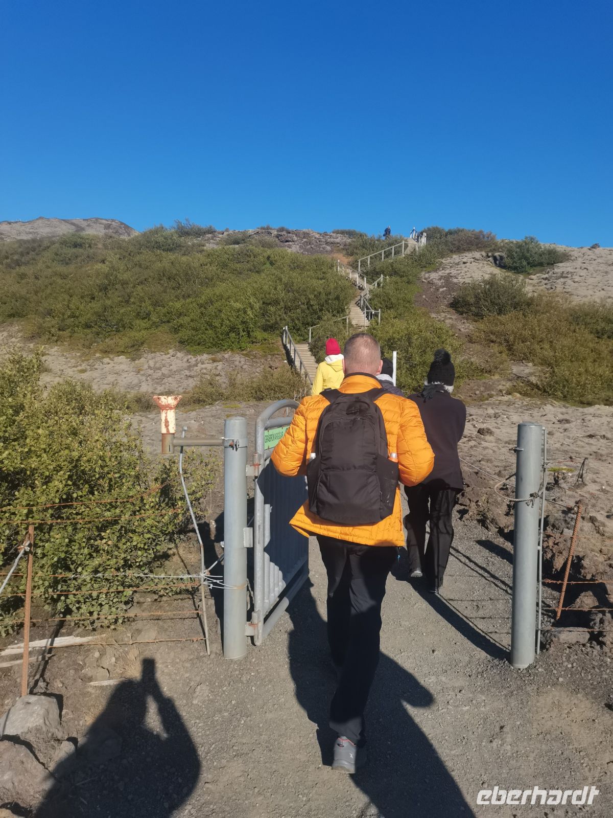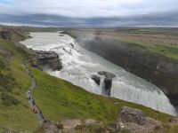 Noch stark beeindruckt erwartet uns bereits das nächste Highlight auf dem "Golden Circle": Wir erreichen Gullfoss, den goldenen Wasserfall. Auf der Fahrt erzählt uns Rósa von dem Rechtsstreit eines Bauern, zu dessen Grundbesitz der Wasserfall gehörte, mit einem englischen Geschäftsmann, der die Energie des Wasserfalls 1907 für ein Wasserkraftwerk nutzen wollte. Die Tochter des Bauern, Sigríður, setzte sich mit viel Einsatz und Hartnäckigkeit über Jahre für die Naturbelassenheit des Wasserfalls ein. Sie gewinnt. Heute wird sie als erste Umweltschützerin Islands gefeiert. Der Pfad zum Wasserfall trägt ihren Namen. Wir hören das Tosen schon aus der Ferne. Beim Gletscher Langjökull entspringt der Hvítá-Fluss, bevor er dramatisch 32 Meter tief über die beiden Stufen des Gullfoss hinunter stürzt. Wir können sehr nah an den Fluss herantreten, passen aber auf, dass uns die Gischt nicht zu sehr nass spritzt, während wir Fotos und Videos von den 11 und 21 Meter hohen Kaskaden machen.