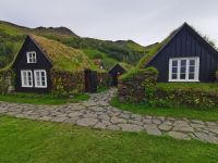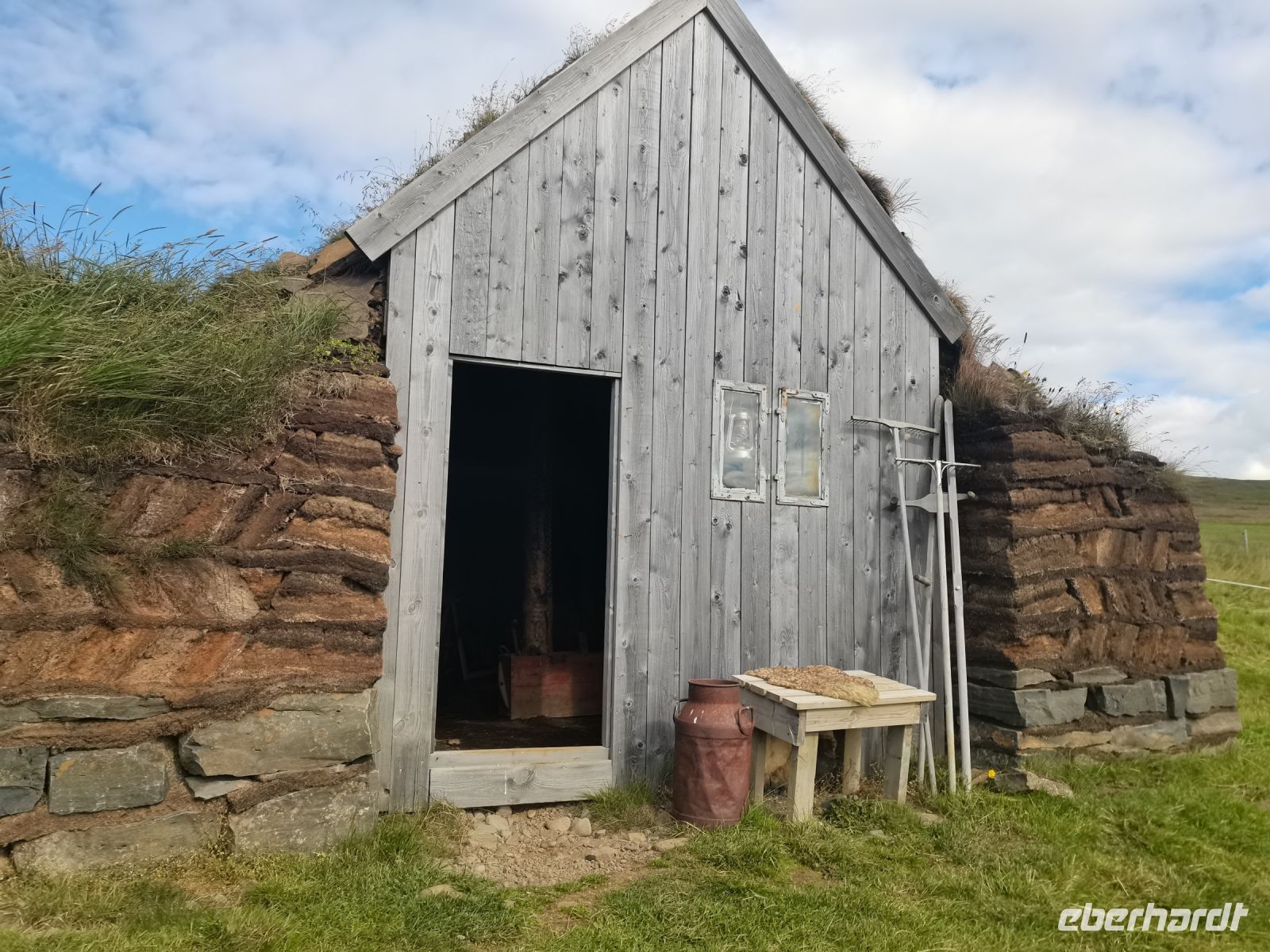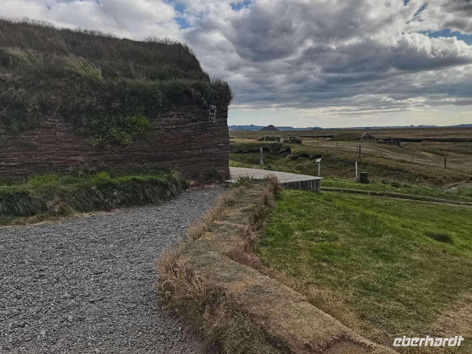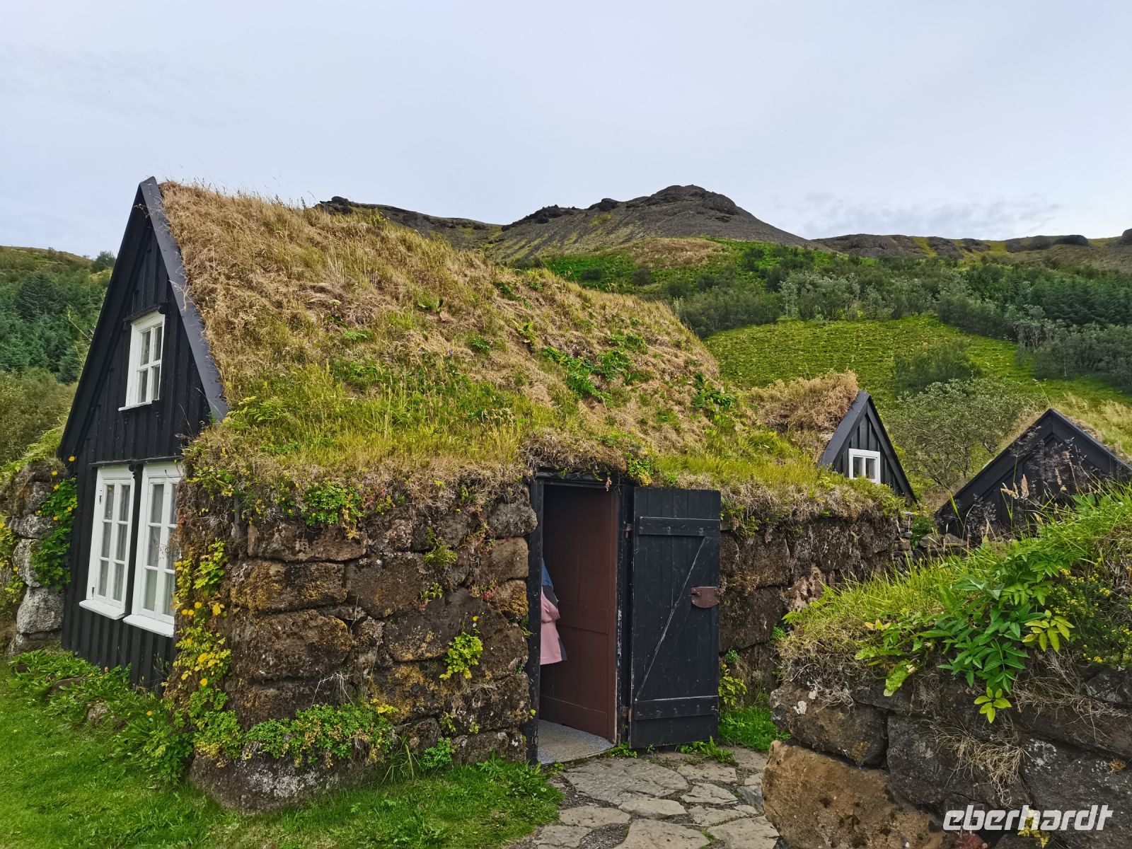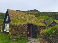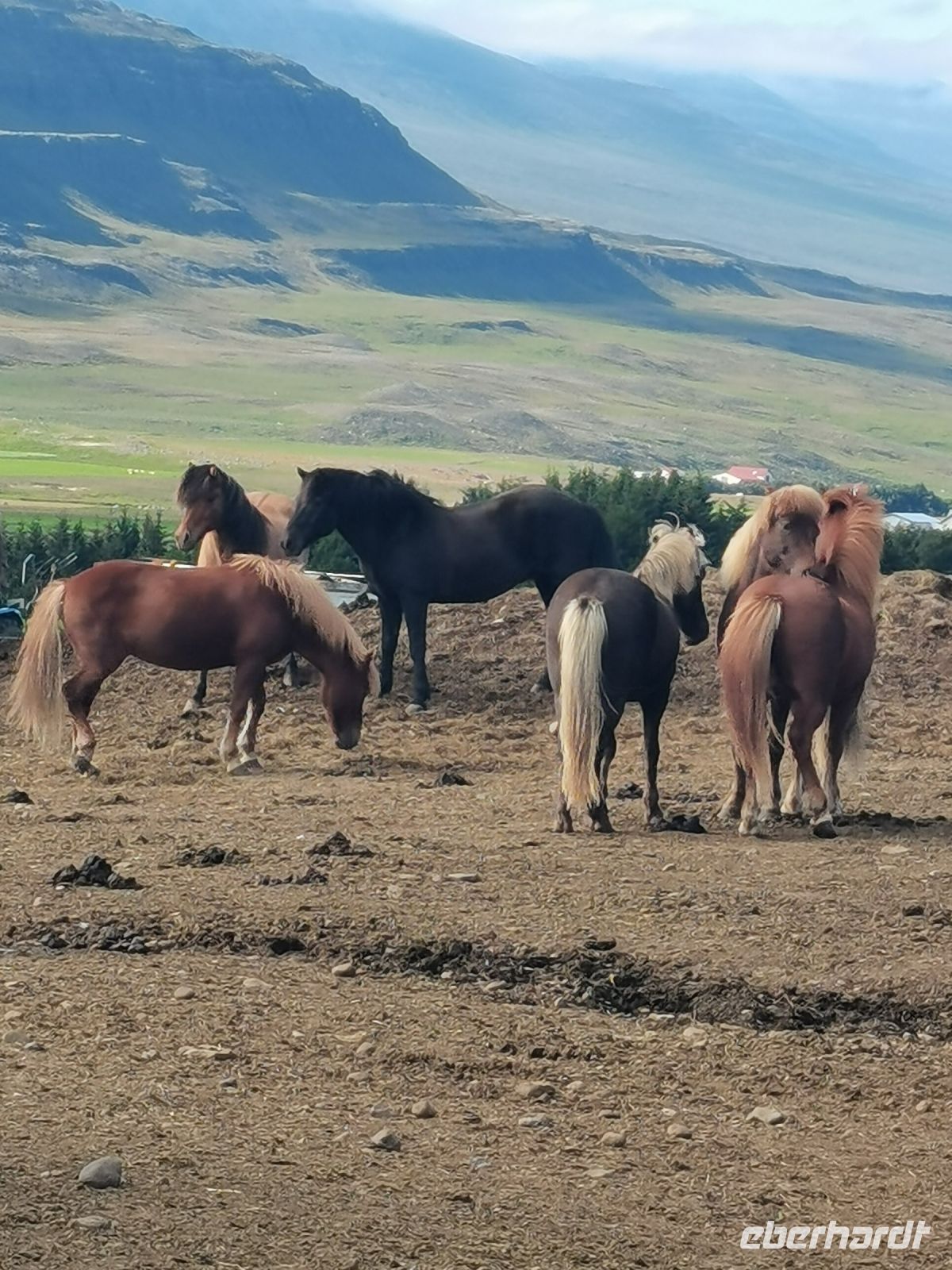 Der nächste Stopp ist besonders ungewöhnlich und liegt in einer Landschaft aus vielen kleinen Hügeln. Wir halten an der Gedenkstätte, an der die letzte Hinrichtung Islands im Jahr 1830 stattgefunden hat. Das Beil traf die Mörderin Agnes Magnusdottir, eine Magd, und ihren Komplizen Friðrik Sigurðsson. Wir schreiten durch ein rotes Eisentor und lesen auf den Steintafeln am Wegesrand Stück für Stück die bewegende Geschichte aus den rauen Zeiten Islands, in denen Armut, harte Arbeit und Einsamkeit vorherrschten. Im Anschluss machen wir Rast im Ort Blönduós. Gestärkt erreichen wir den Pferdehof Lytingsstadir. Hier erwarten uns die Inhaber und zwei junge Kennerinnen von Islandpferden. Die beiden Deutschen verbringen den Sommer auf der Insel. Sie erzählen uns von den Besonderheiten der Tiere, die einmal fort von Island, niemals mehr zurückkommen dürfen. Wir sehen die verschiedenen Galopparten in der Vorführung und besuchen die typischen Torfhäuser, die auf dem Gelände authentisch nachgebaut wurden. Im Anschluss sind wir zu einer Kaffee- bzw. Teepause eingeladen, bei der uns das Gebäck "Eheglück" angeboten wird. Es ist so köstlich, dass wir uns das Rezept mit nach Hause nehmen.