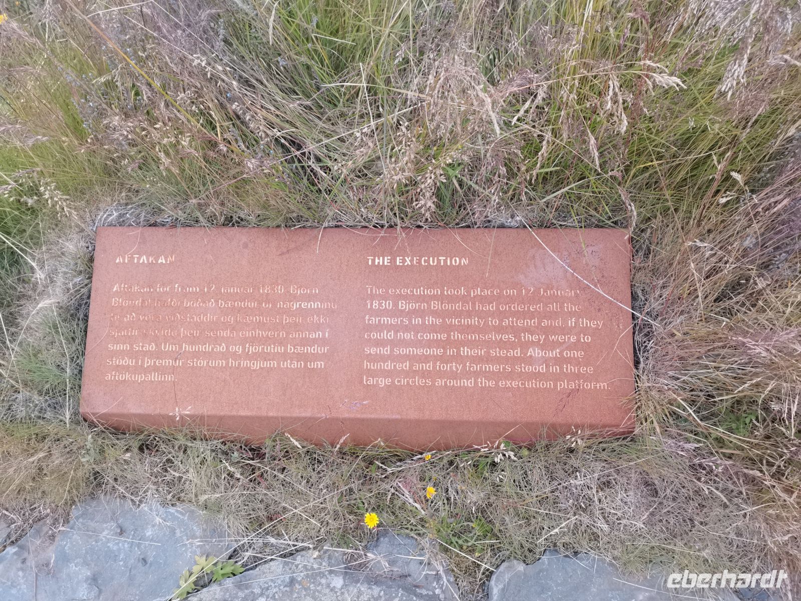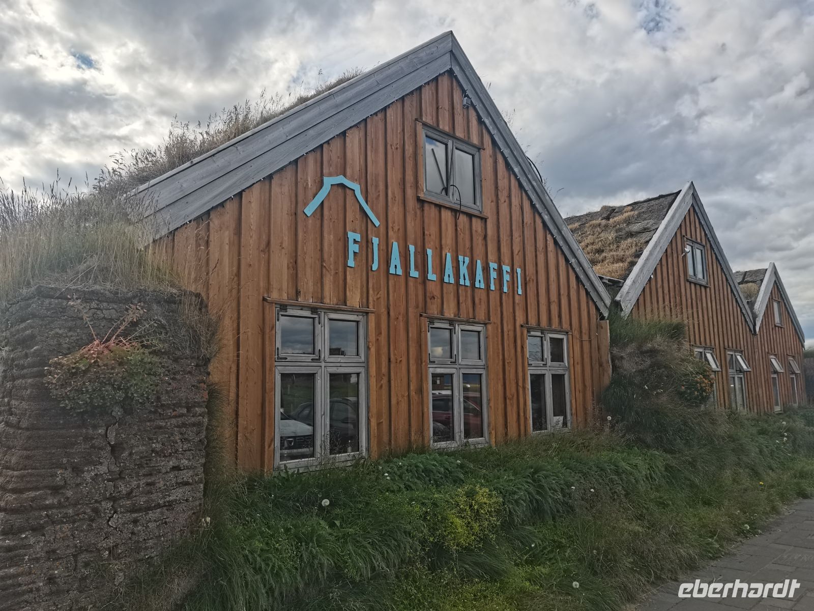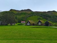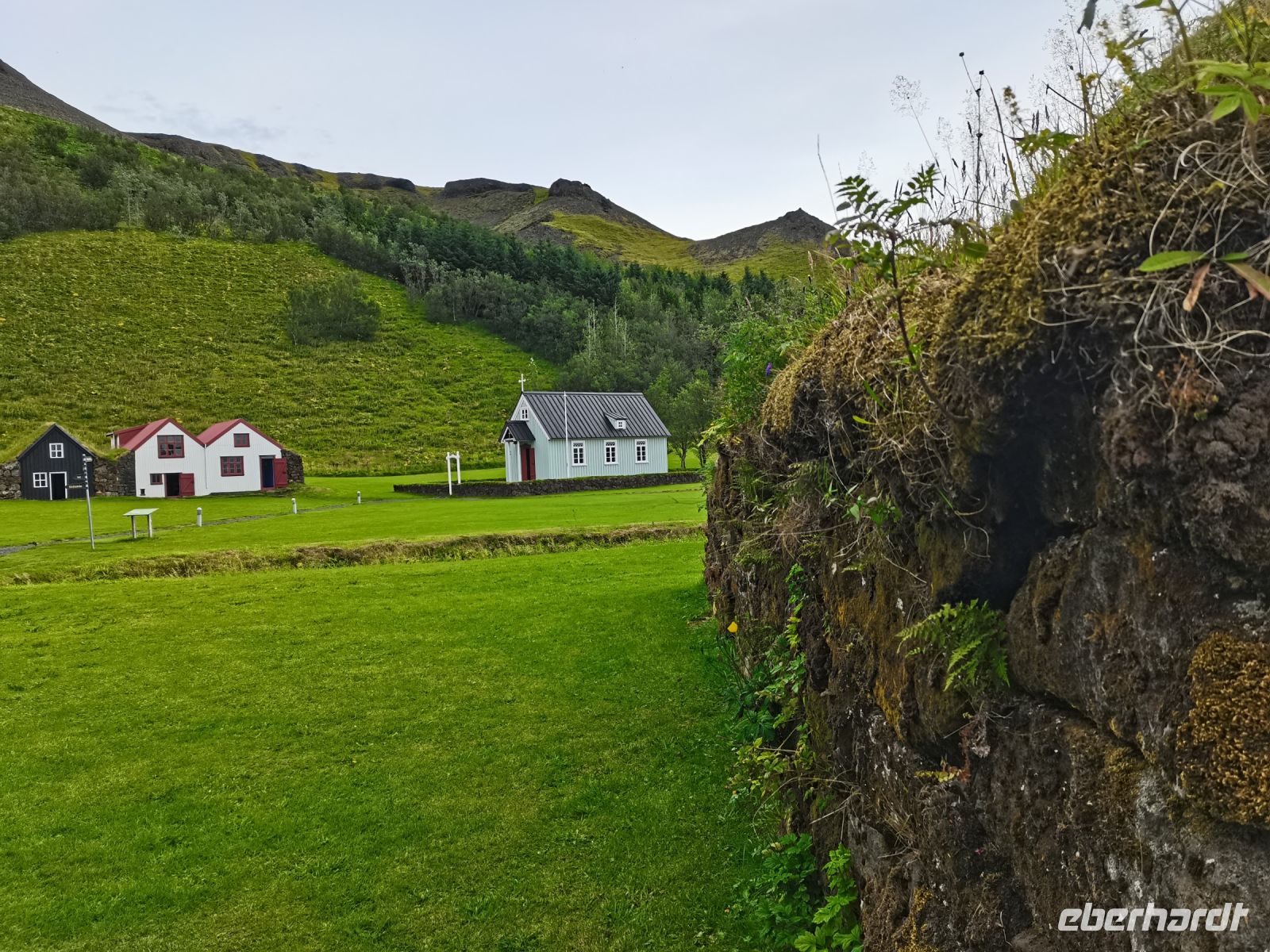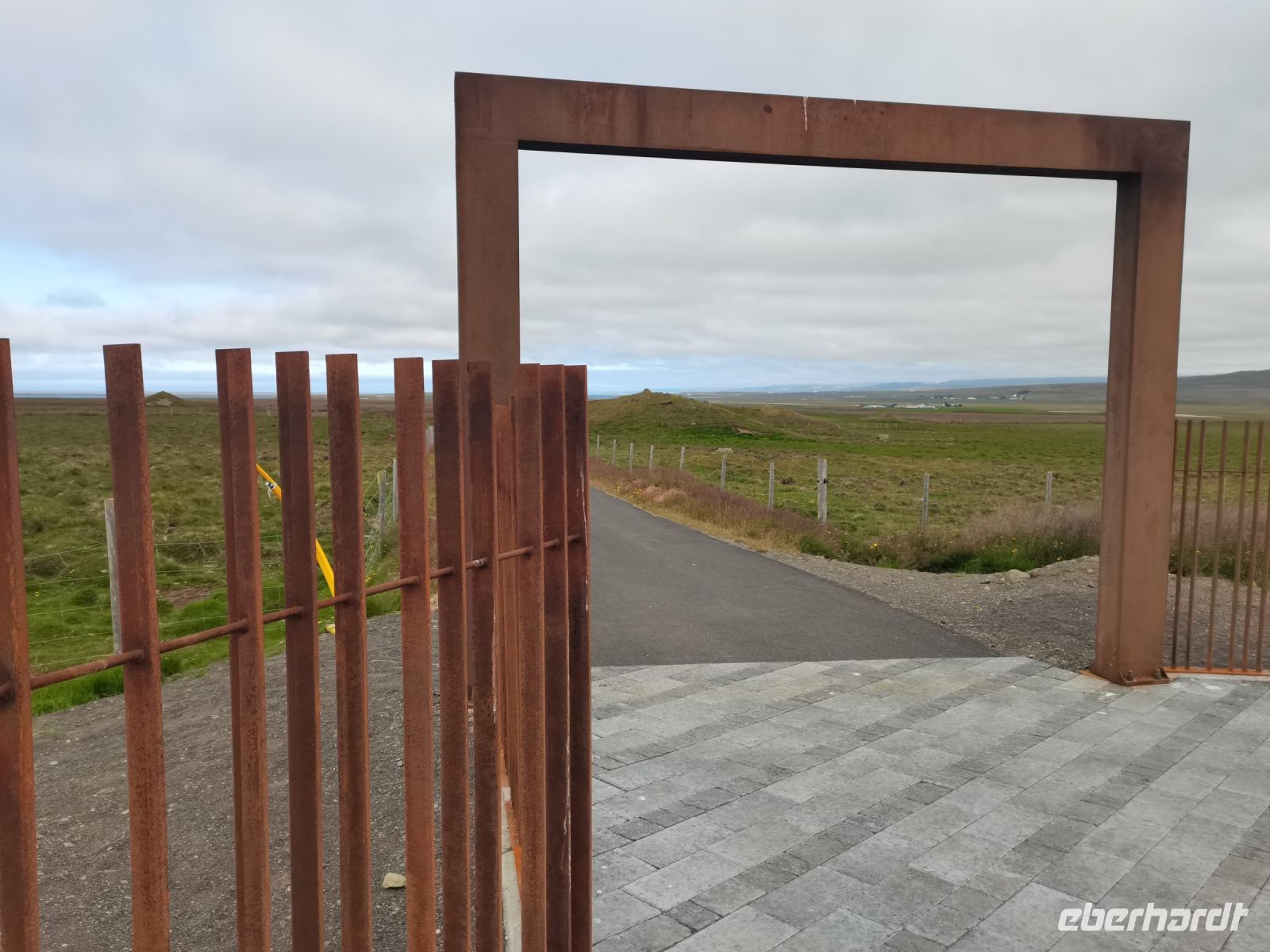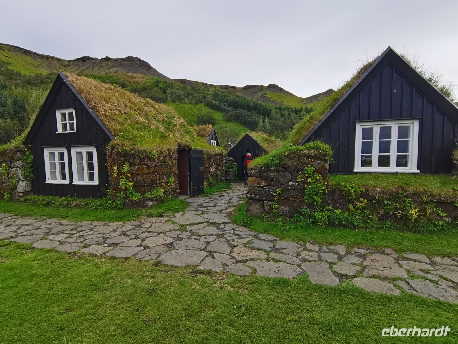Der nächste Stopp ist besonders ungewöhnlich und liegt in einer Landschaft aus vielen kleinen Hügeln. Wir halten an der Gedenkstätte, an der die letzte Hinrichtung Islands im Jahr 1830 stattgefunden hat. Das Beil traf die Mörderin Agnes Magnusdottir, eine Magd, und ihren Komplizen Friðrik Sigurðsson. Wir schreiten durch ein rotes Eisentor und lesen auf den Steintafeln am Wegesrand Stück für Stück die bewegende Geschichte aus den rauen Zeiten Islands, in denen Armut, harte Arbeit und Einsamkeit vorherrschten. Im Anschluss machen wir Rast im Ort Blönduós. Gestärkt erreichen wir den Pferdehof Lytingsstadir. Hier erwarten uns die Inhaber und zwei junge Kennerinnen von Islandpferden. Die beiden Deutschen verbringen den Sommer auf der Insel. Sie erzählen uns von den Besonderheiten der Tiere, die einmal fort von Island, niemals mehr zurückkommen dürfen. Wir sehen die verschiedenen Galopparten in der Vorführung und besuchen die typischen Torfhäuser, die auf dem Gelände authentisch nachgebaut wurden. Im Anschluss sind wir zu einer Kaffee- bzw. Teepause eingeladen, bei der uns das Gebäck "Eheglück" angeboten wird. Es ist so köstlich, dass wir uns das Rezept mit nach Hause nehmen.