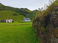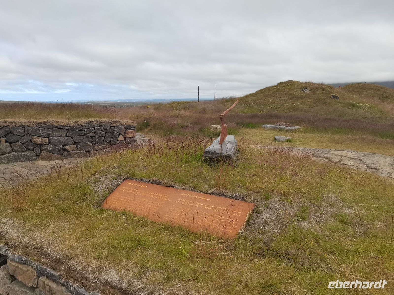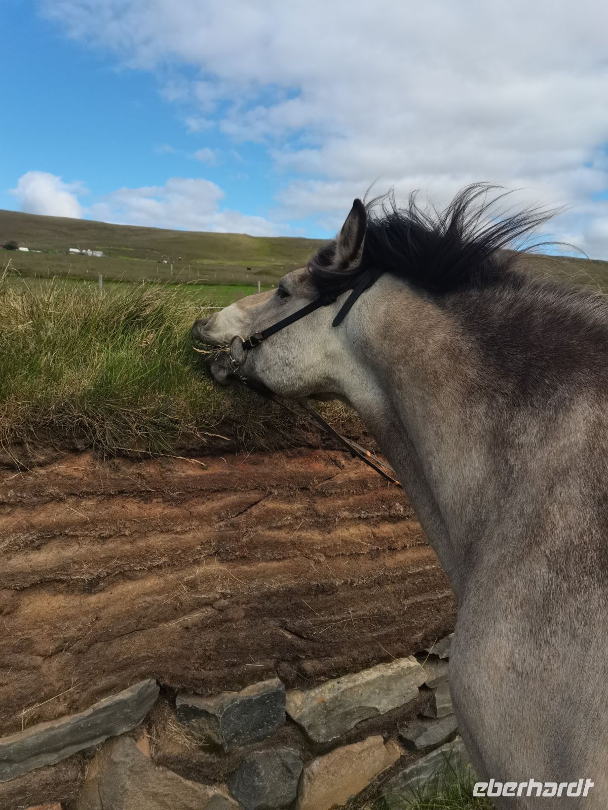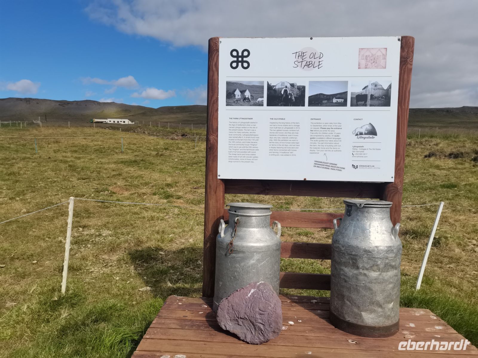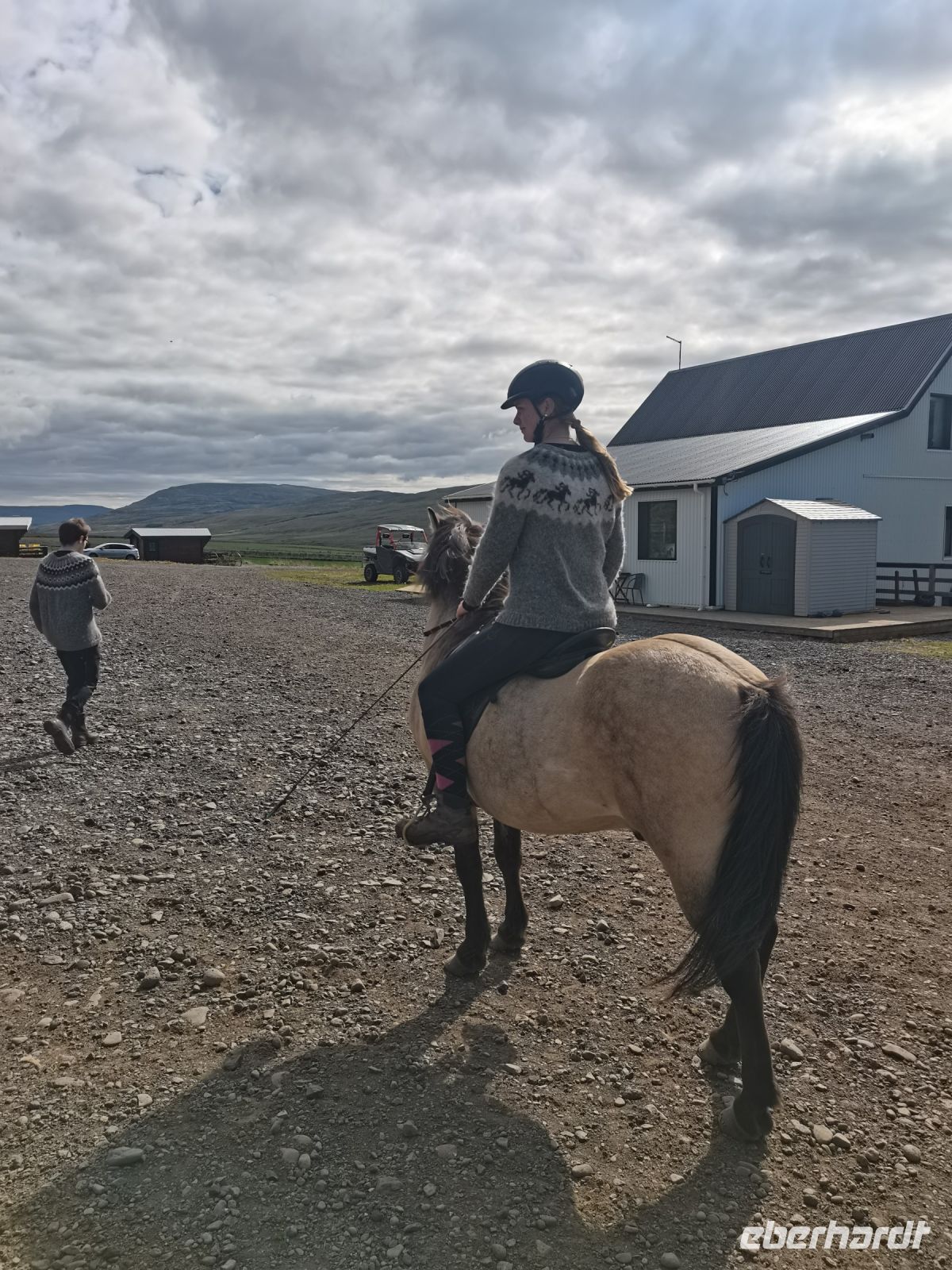 Der nächste Stopp ist besonders ungewöhnlich und liegt in einer Landschaft aus vielen kleinen Hügeln. Wir halten an der Gedenkstätte, an der die letzte Hinrichtung Islands im Jahr 1830 stattgefunden hat. Das Beil traf die Mörderin Agnes Magnusdottir, eine Magd, und ihren Komplizen Friðrik Sigurðsson. Wir schreiten durch ein rotes Eisentor und lesen auf den Steintafeln am Wegesrand Stück für Stück die bewegende Geschichte aus den rauen Zeiten Islands, in denen Armut, harte Arbeit und Einsamkeit vorherrschten. Im Anschluss machen wir Rast im Ort Blönduós. Gestärkt erreichen wir den Pferdehof Lytingsstadir. Hier erwarten uns die Inhaber und zwei junge Kennerinnen von Islandpferden. Die beiden Deutschen verbringen den Sommer auf der Insel. Sie erzählen uns von den Besonderheiten der Tiere, die einmal fort von Island, niemals mehr zurückkommen dürfen. Wir sehen die verschiedenen Galopparten in der Vorführung und besuchen die typischen Torfhäuser, die auf dem Gelände authentisch nachgebaut wurden. Im Anschluss sind wir zu einer Kaffee- bzw. Teepause eingeladen, bei der uns das Gebäck "Eheglück" angeboten wird. Es ist so köstlich, dass wir uns das Rezept mit nach Hause nehmen.