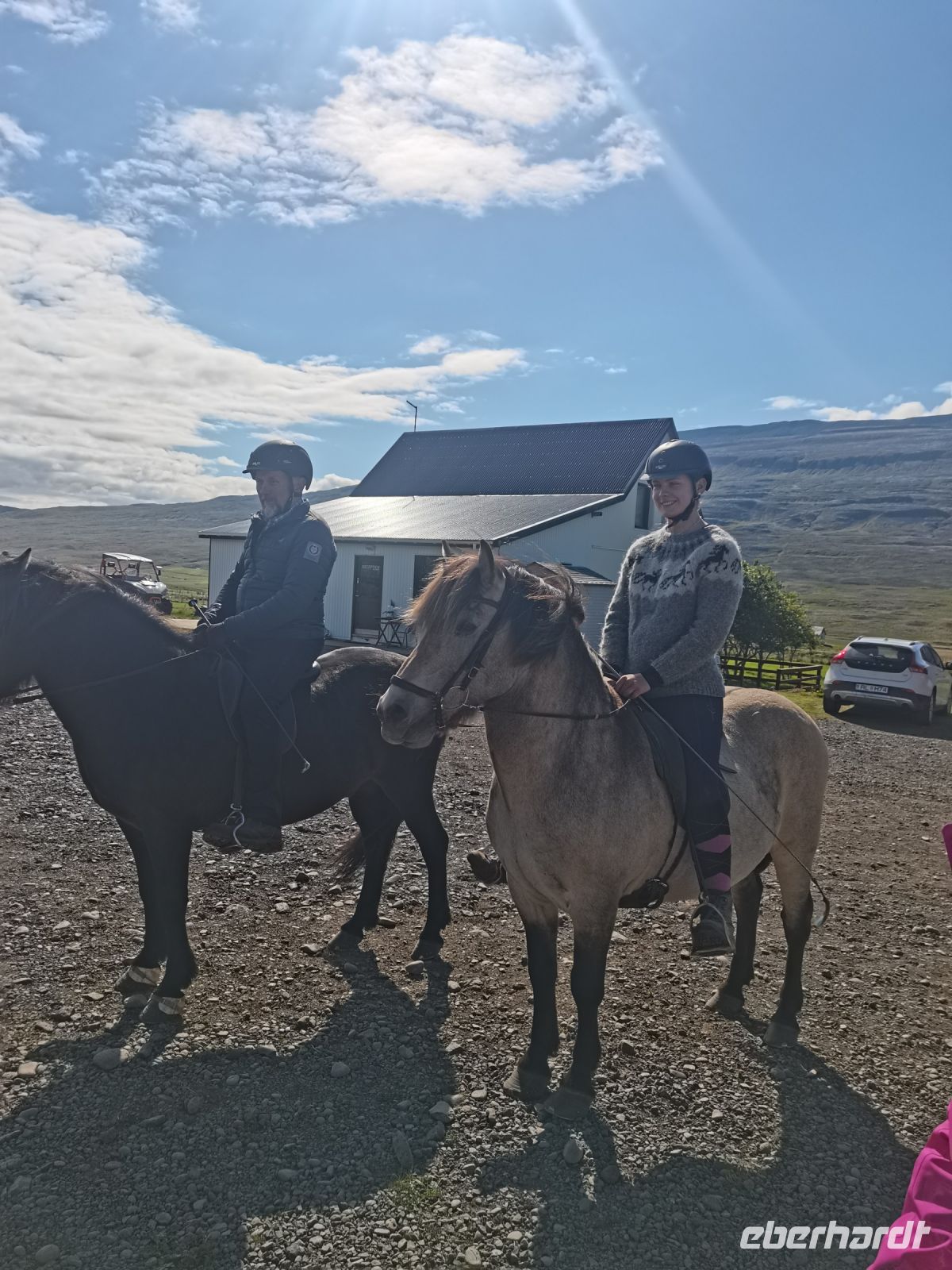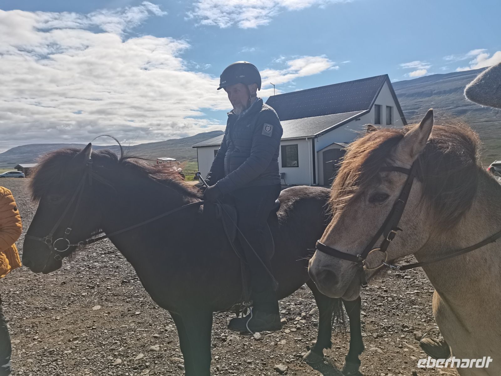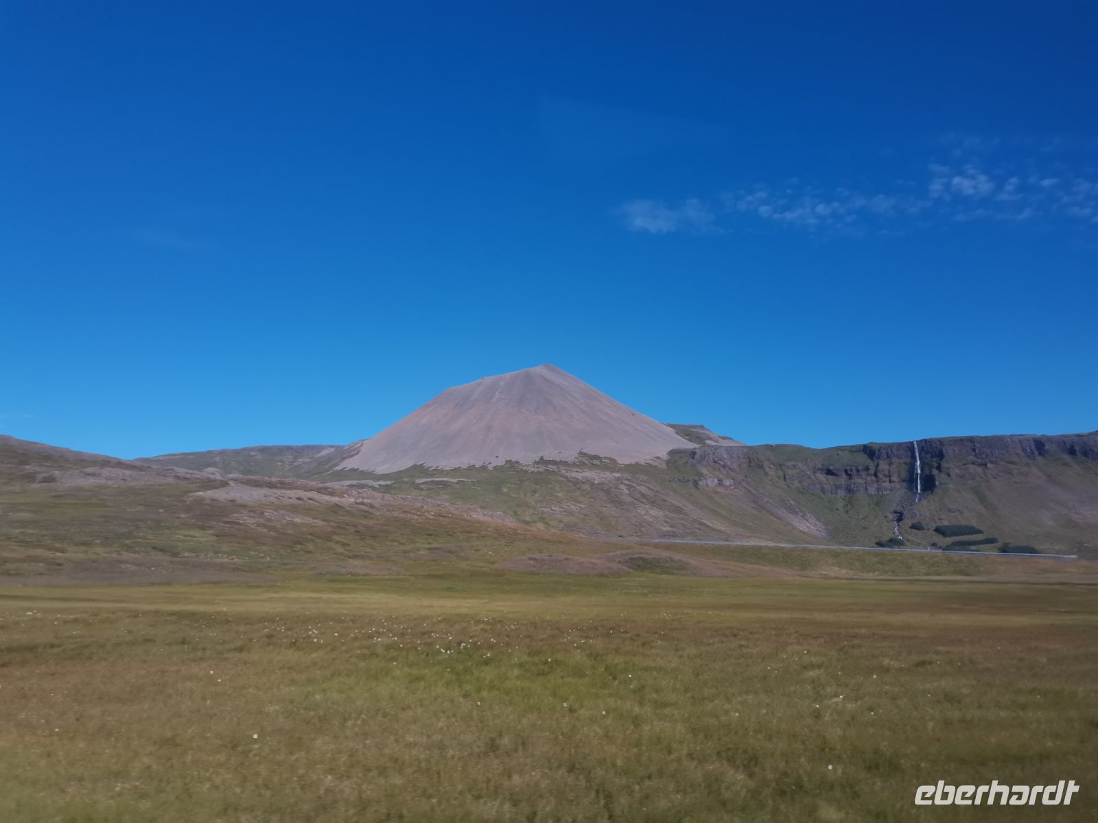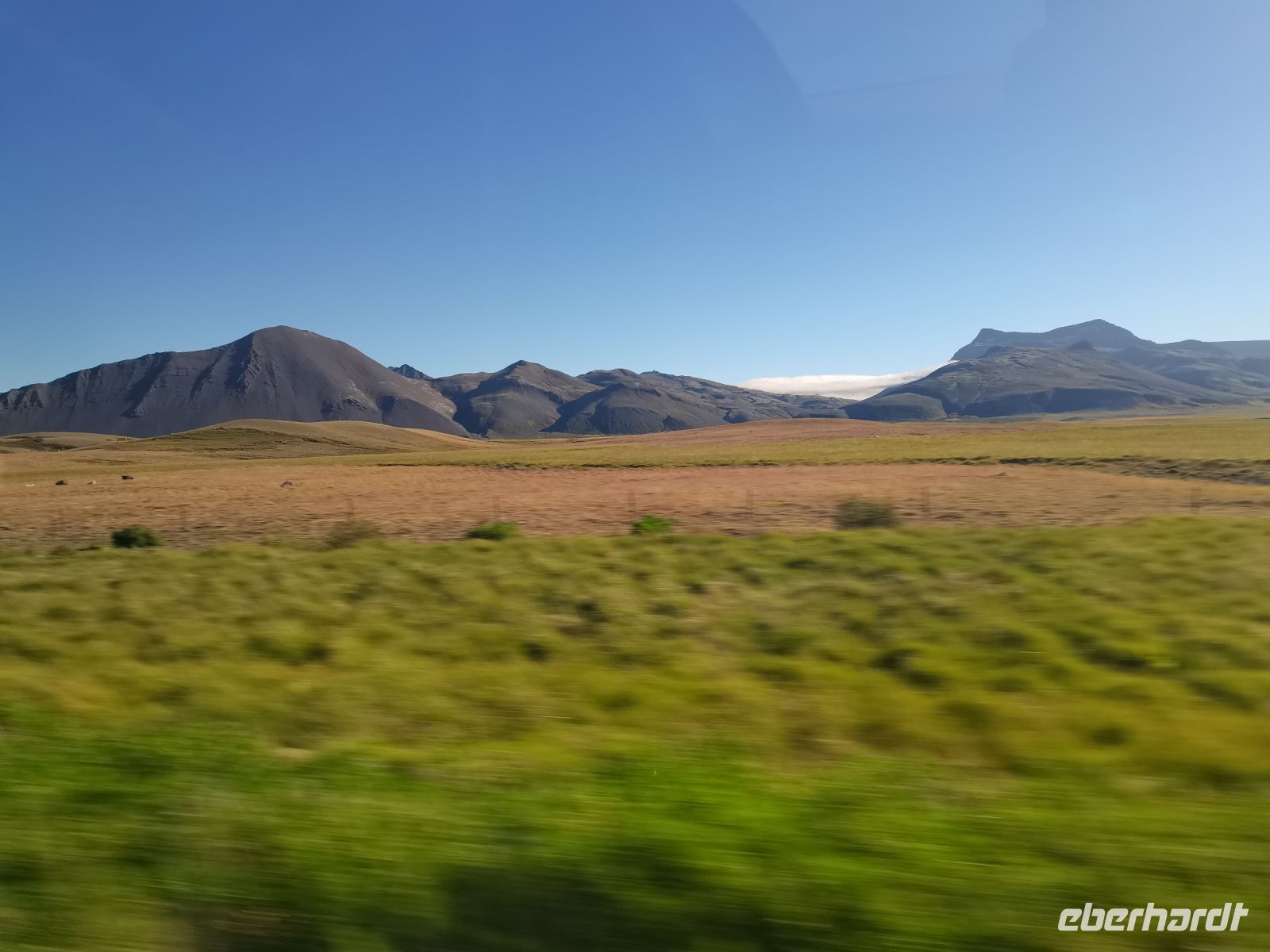 Der nächste Stopp ist besonders ungewöhnlich und liegt in einer Landschaft aus vielen kleinen Hügeln. Wir halten an der Gedenkstätte, an der die letzte Hinrichtung Islands im Jahr 1830 stattgefunden hat. Das Beil traf die Mörderin Agnes Magnusdottir, eine Magd, und ihren Komplizen Friðrik Sigurðsson. Wir schreiten durch ein rotes Eisentor und lesen auf den Steintafeln am Wegesrand Stück für Stück die bewegende Geschichte aus den rauen Zeiten Islands, in denen Armut, harte Arbeit und Einsamkeit vorherrschten. Im Anschluss machen wir Rast im Ort Blönduós. Gestärkt erreichen wir den Pferdehof Lytingsstadir. Hier erwarten uns die Inhaber und zwei junge Kennerinnen von Islandpferden. Die beiden Deutschen verbringen den Sommer auf der Insel. Sie erzählen uns von den Besonderheiten der Tiere, die einmal fort von Island, niemals mehr zurückkommen dürfen. Wir sehen die verschiedenen Galopparten in der Vorführung und besuchen die typischen Torfhäuser, die auf dem Gelände authentisch nachgebaut wurden. Im Anschluss sind wir zu einer Kaffee- bzw. Teepause eingeladen, bei der uns das Gebäck "Eheglück" angeboten wird. Es ist so köstlich, dass wir uns das Rezept mit nach Hause nehmen.