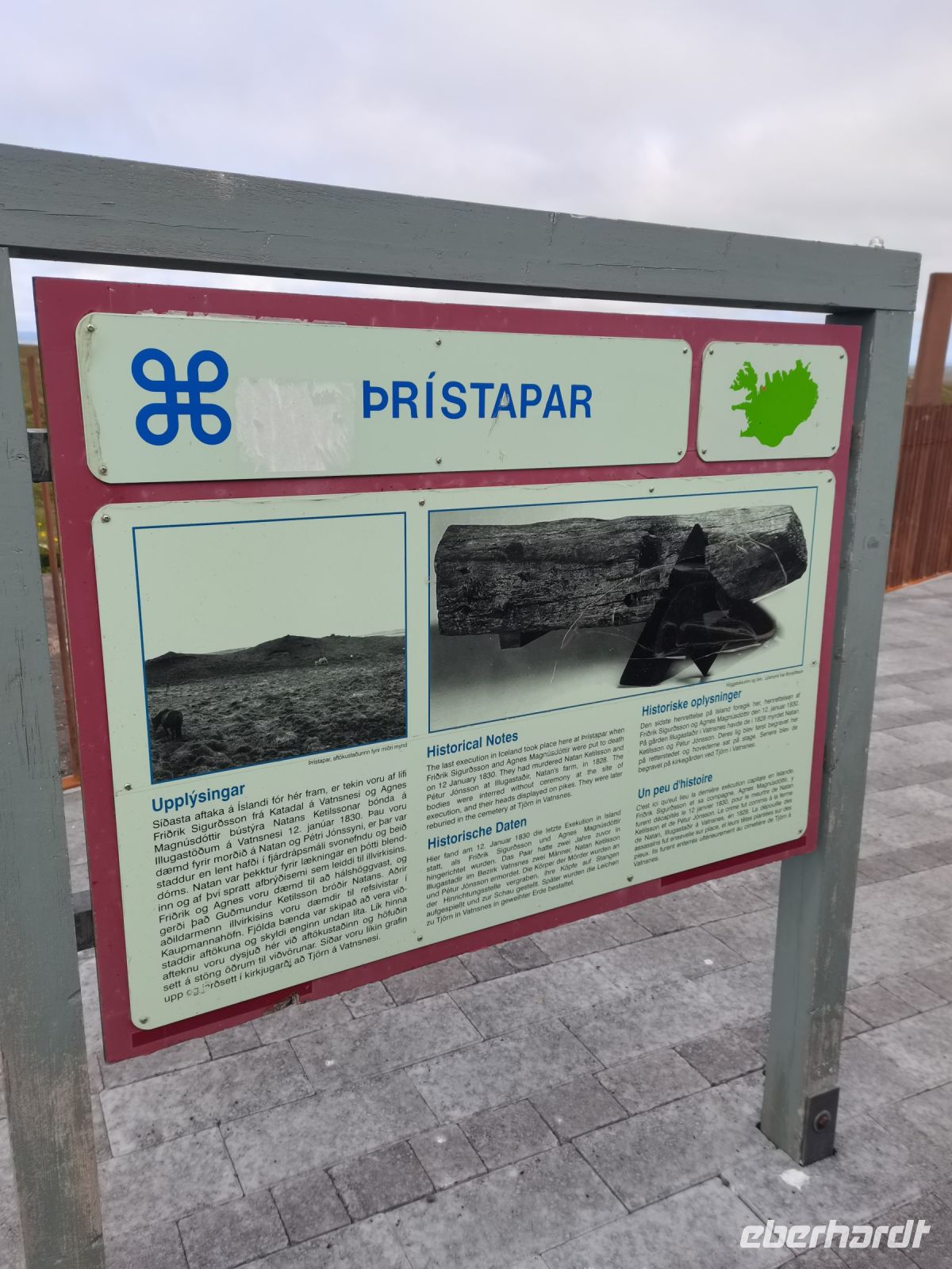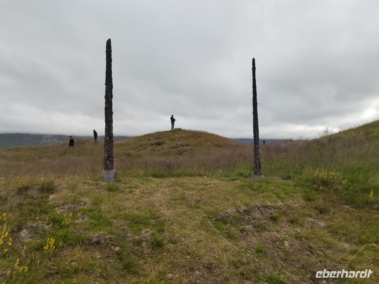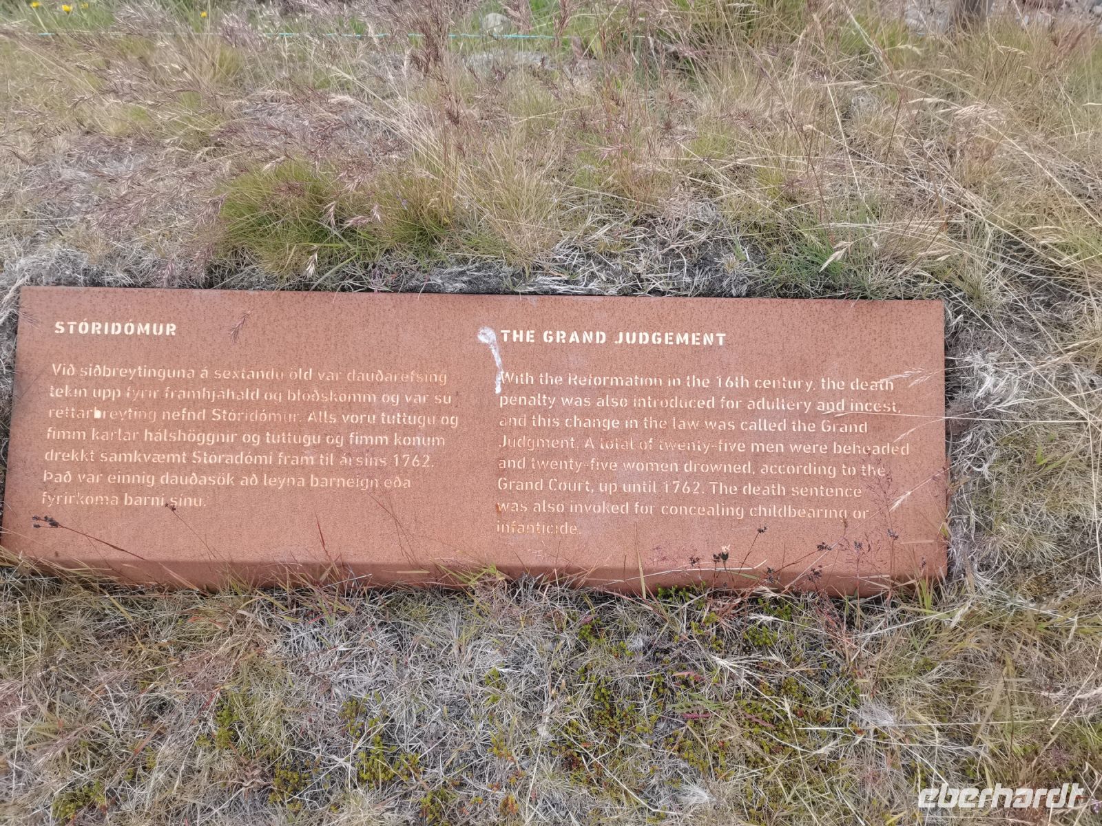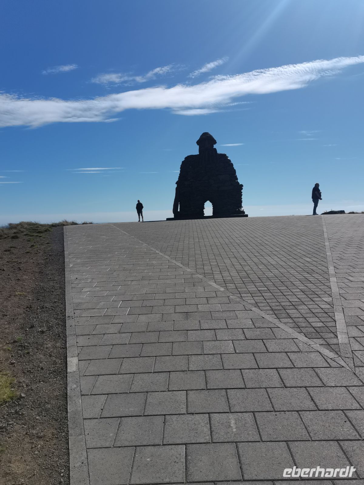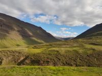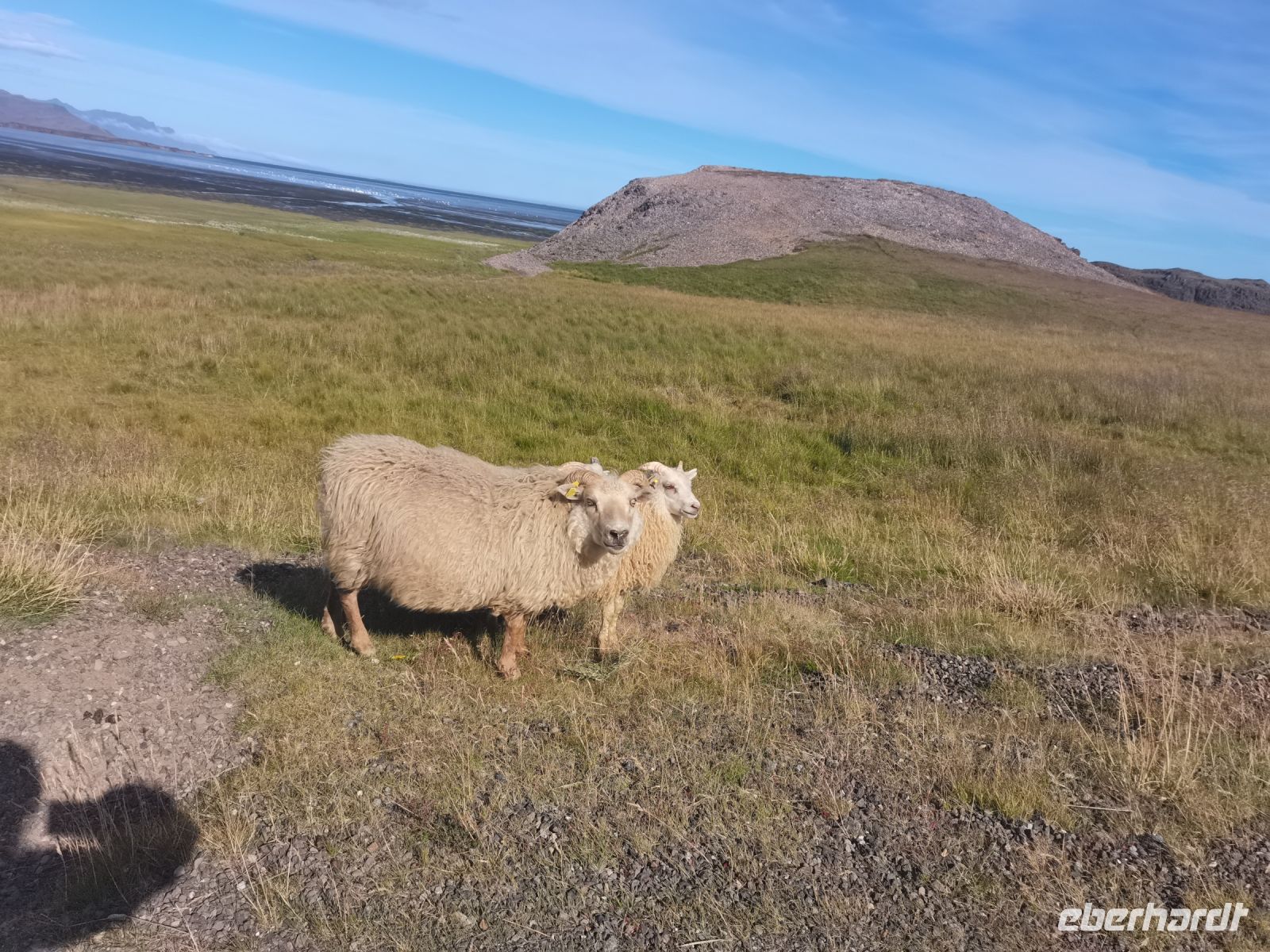 Der nächste Stopp ist besonders ungewöhnlich und liegt in einer Landschaft aus vielen kleinen Hügeln. Wir halten an der Gedenkstätte, an der die letzte Hinrichtung Islands im Jahr 1830 stattgefunden hat. Das Beil traf die Mörderin Agnes Magnusdottir, eine Magd, und ihren Komplizen Friðrik Sigurðsson. Wir schreiten durch ein rotes Eisentor und lesen auf den Steintafeln am Wegesrand Stück für Stück die bewegende Geschichte aus den rauen Zeiten Islands, in denen Armut, harte Arbeit und Einsamkeit vorherrschten. Im Anschluss machen wir Rast im Ort Blönduós. Gestärkt erreichen wir den Pferdehof Lytingsstadir. Hier erwarten uns die Inhaber und zwei junge Kennerinnen von Islandpferden. Die beiden Deutschen verbringen den Sommer auf der Insel. Sie erzählen uns von den Besonderheiten der Tiere, die einmal fort von Island, niemals mehr zurückkommen dürfen. Wir sehen die verschiedenen Galopparten in der Vorführung und besuchen die typischen Torfhäuser, die auf dem Gelände authentisch nachgebaut wurden. Im Anschluss sind wir zu einer Kaffee- bzw. Teepause eingeladen, bei der uns das Gebäck "Eheglück" angeboten wird. Es ist so köstlich, dass wir uns das Rezept mit nach Hause nehmen.