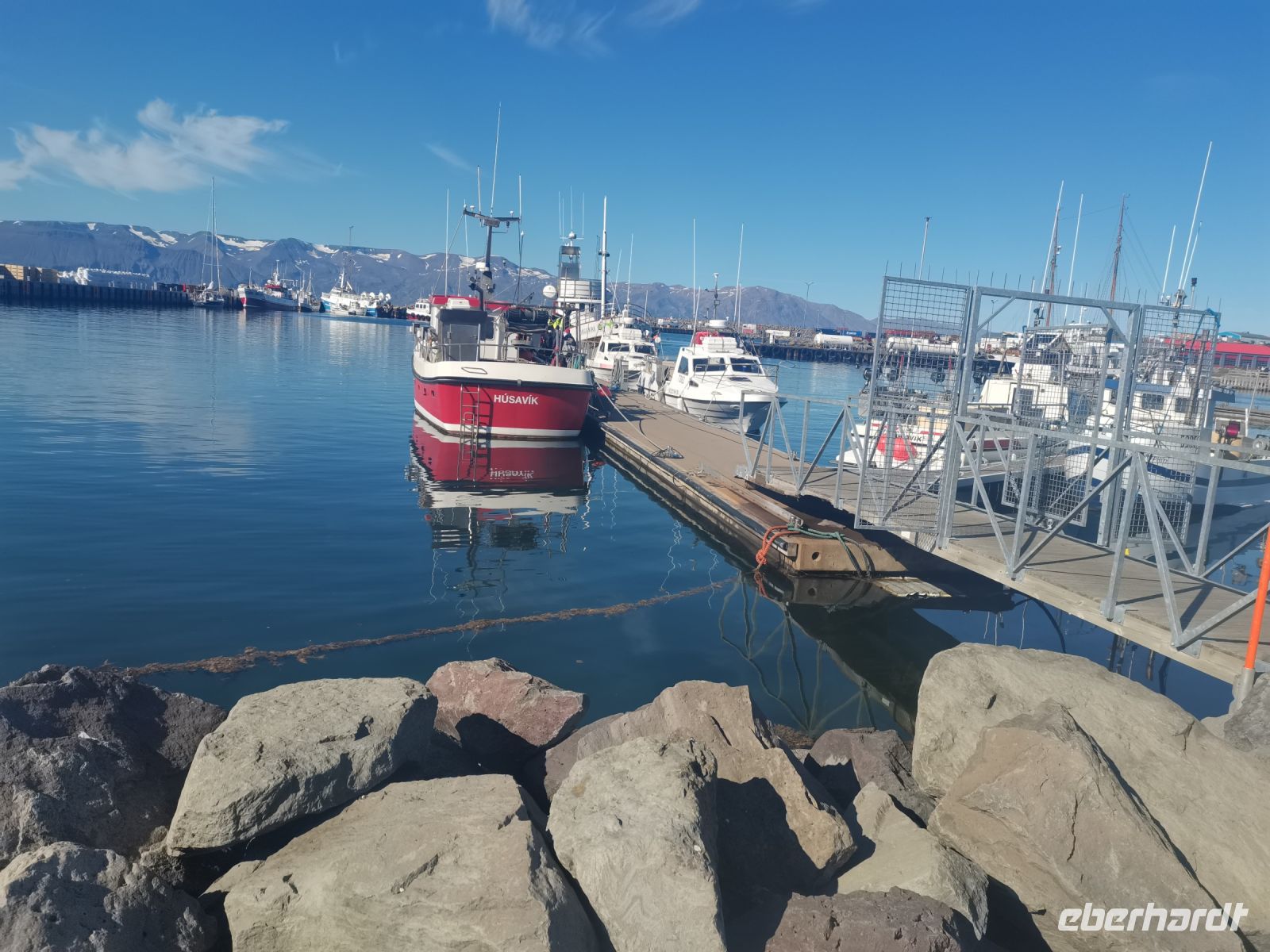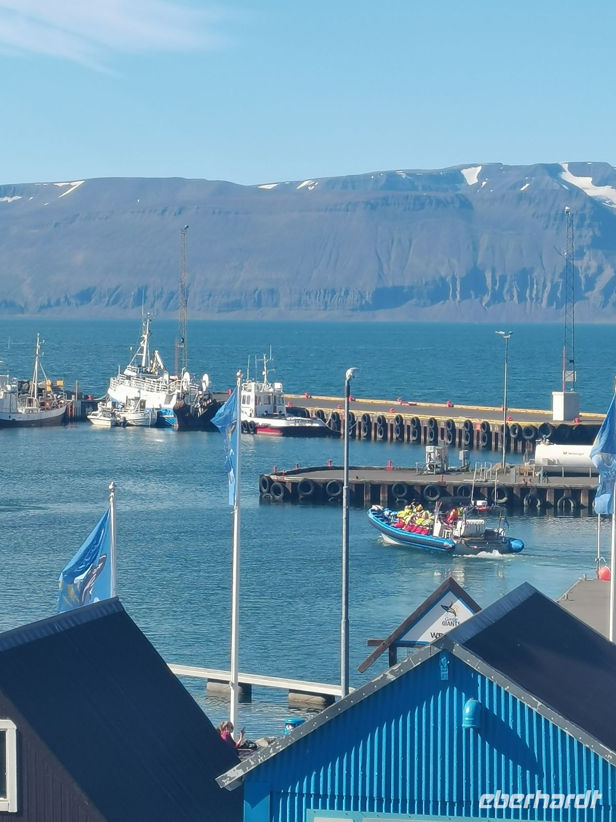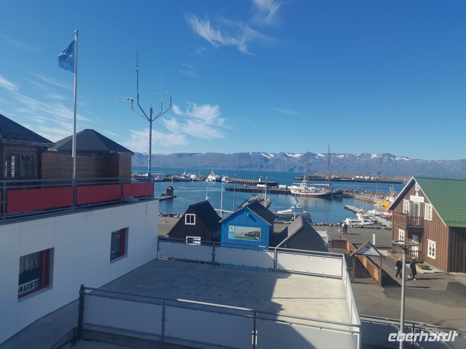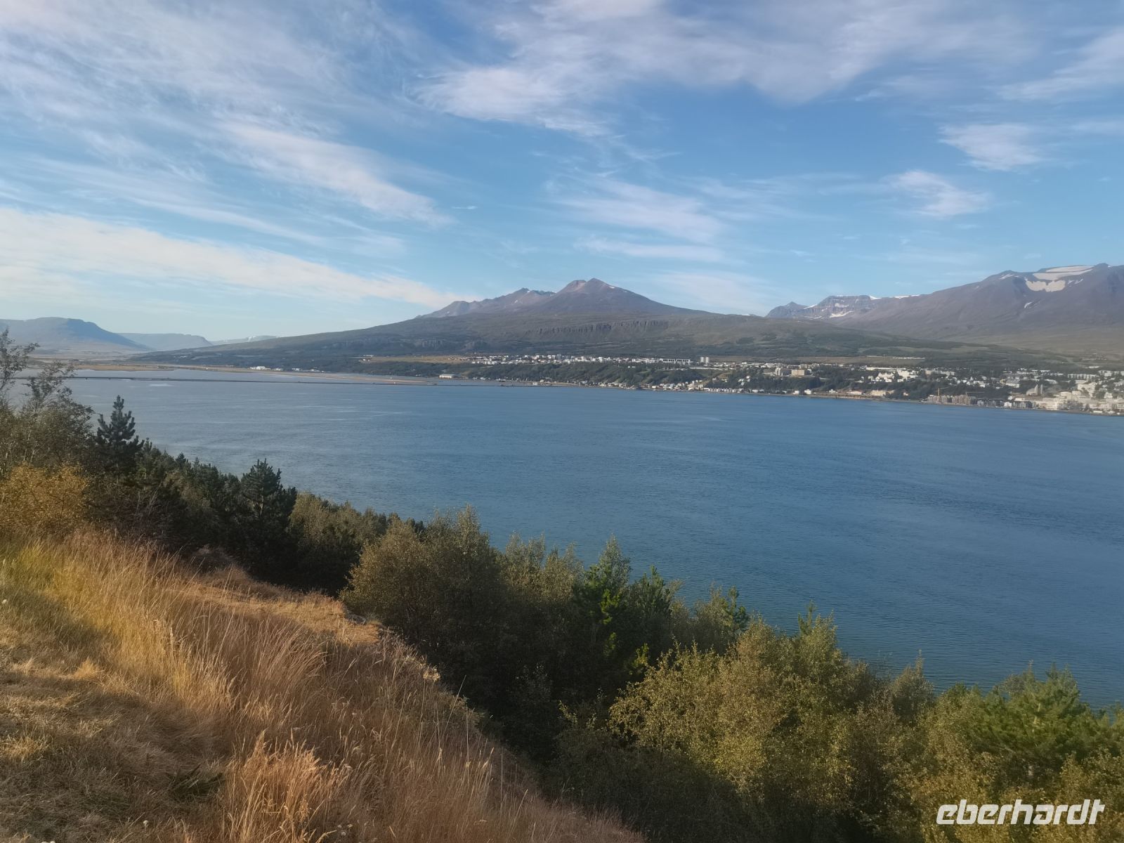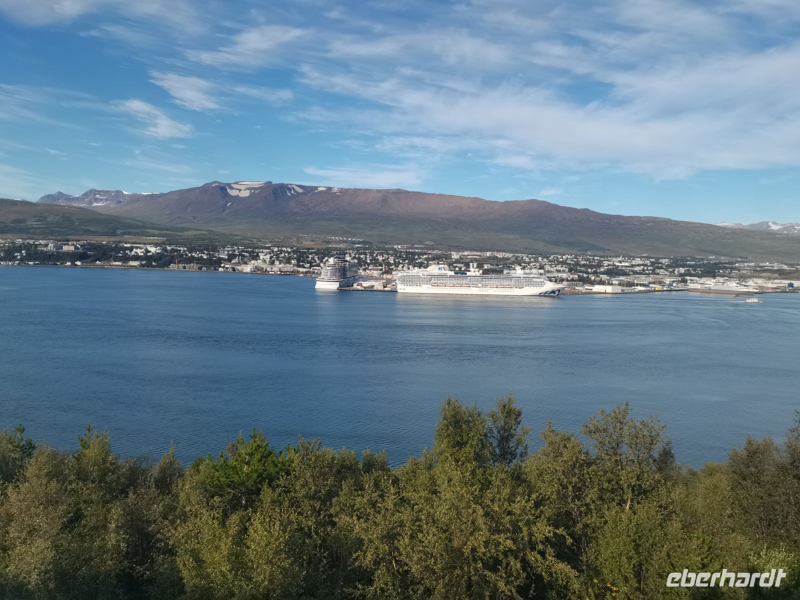 Früh begeben wir uns in das Restaurant im Botanischen Garten, um unser Frühstück zu genießen. Wieder erwartet uns ein sonniger Tag, was haben wir für ein Glück, soll das Wetter normalerweise doch sehr unberechenbar sein. Wir beginnen den Tag mit einer kleinen Stadtrundfahrt in Akureyri, dem Heimatort unserer Reiseführerin Rósa. Hier lässt es sich gut leben, erzählt sie. Wir überqueren die Brücke über dem Fjord und machen gleich einen Stopp für ein Panoramafoto. Viele Kreuzfahrtschiffe mit Gästen aus aller Welt halten in Akureyri, um die interessante Umgebung von hier aus zu besuchen.