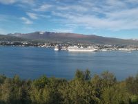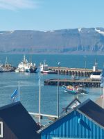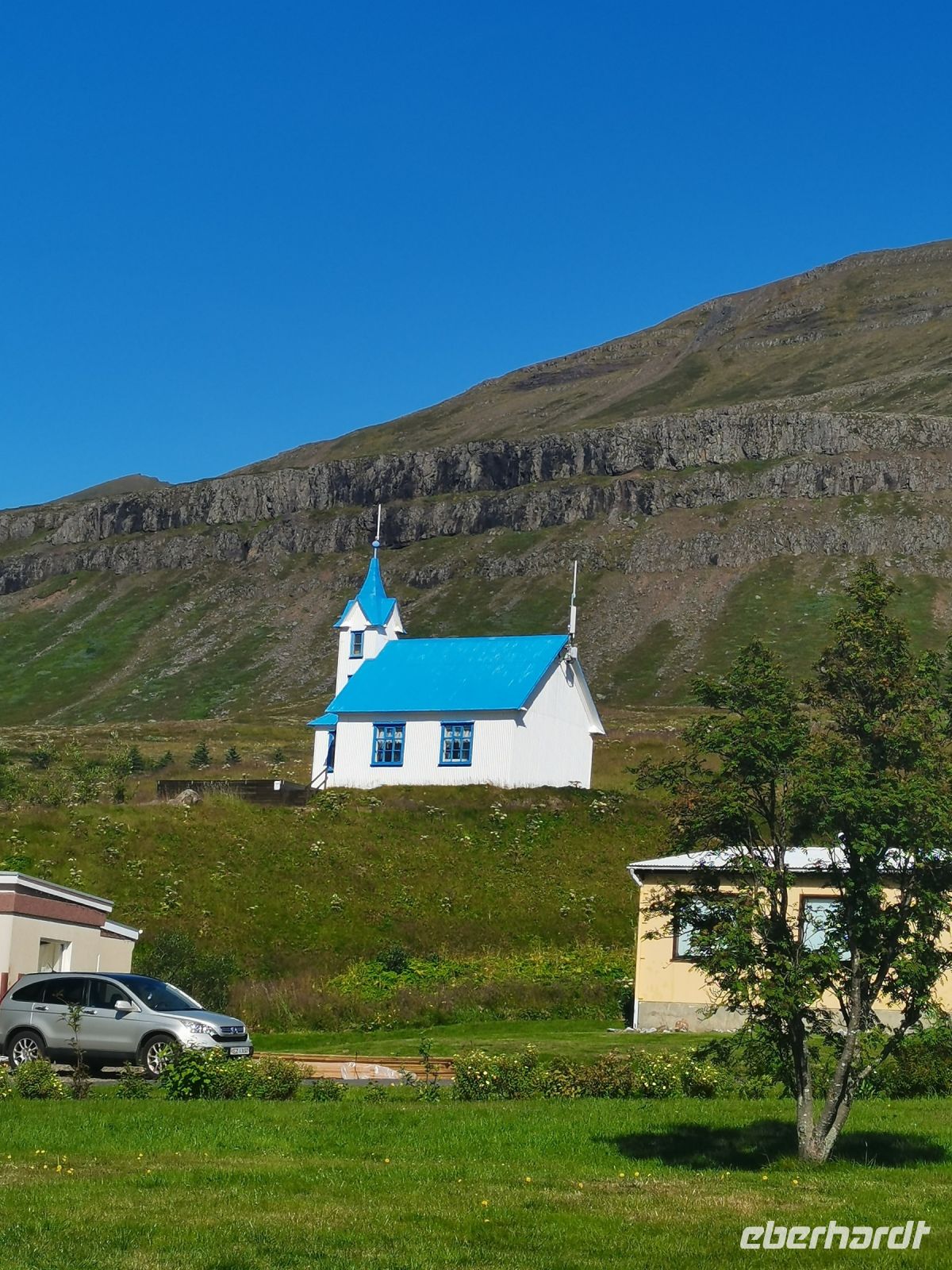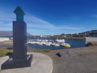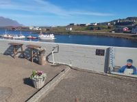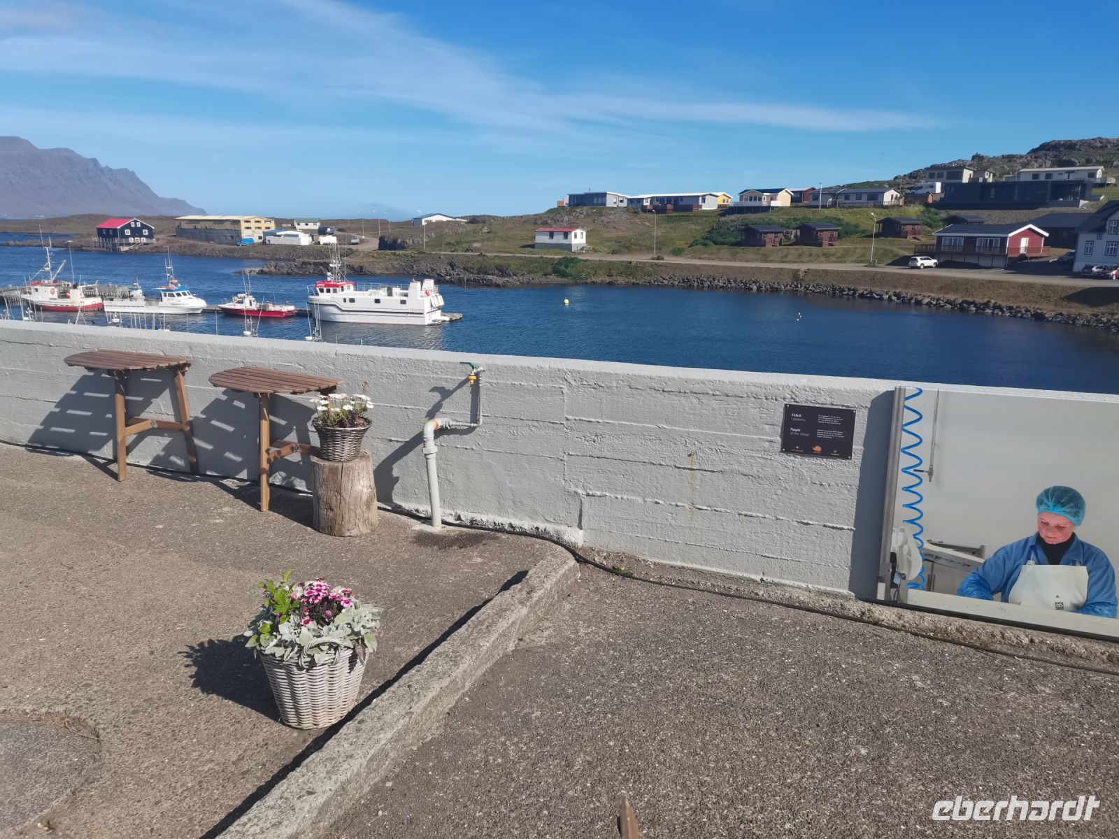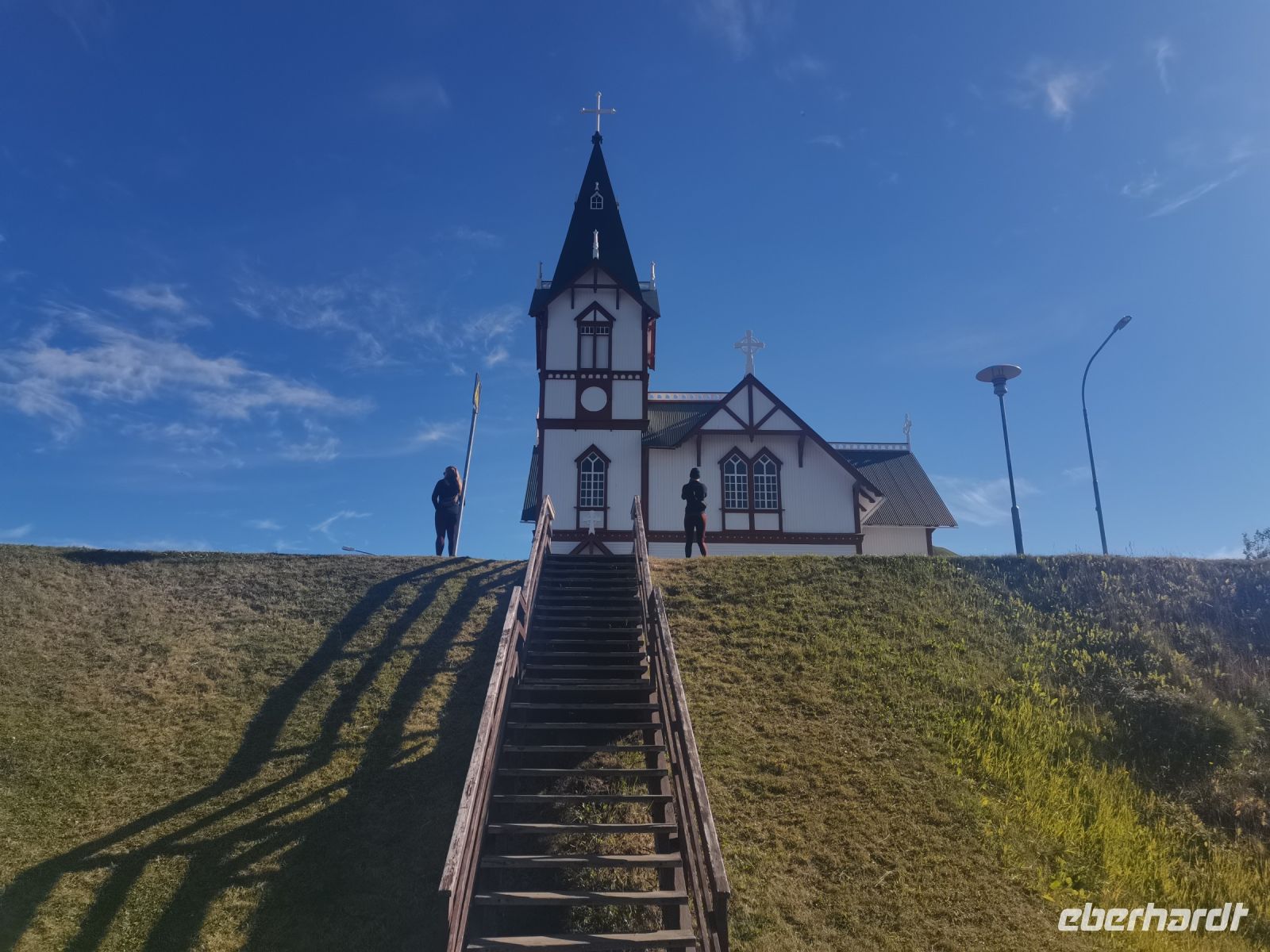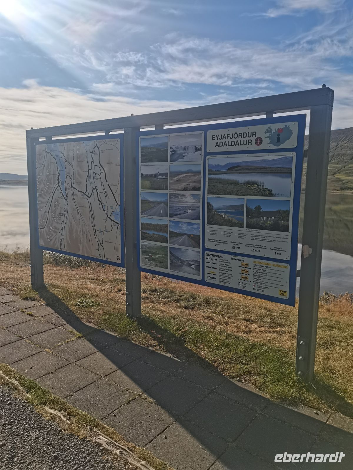 Früh begeben wir uns in das Restaurant im Botanischen Garten, um unser Frühstück zu genießen. Wieder erwartet uns ein sonniger Tag, was haben wir für ein Glück, soll das Wetter normalerweise doch sehr unberechenbar sein. Wir beginnen den Tag mit einer kleinen Stadtrundfahrt in Akureyri, dem Heimatort unserer Reiseführerin Rósa. Hier lässt es sich gut leben, erzählt sie. Wir überqueren die Brücke über dem Fjord und machen gleich einen Stopp für ein Panoramafoto. Viele Kreuzfahrtschiffe mit Gästen aus aller Welt halten in Akureyri, um die interessante Umgebung von hier aus zu besuchen.