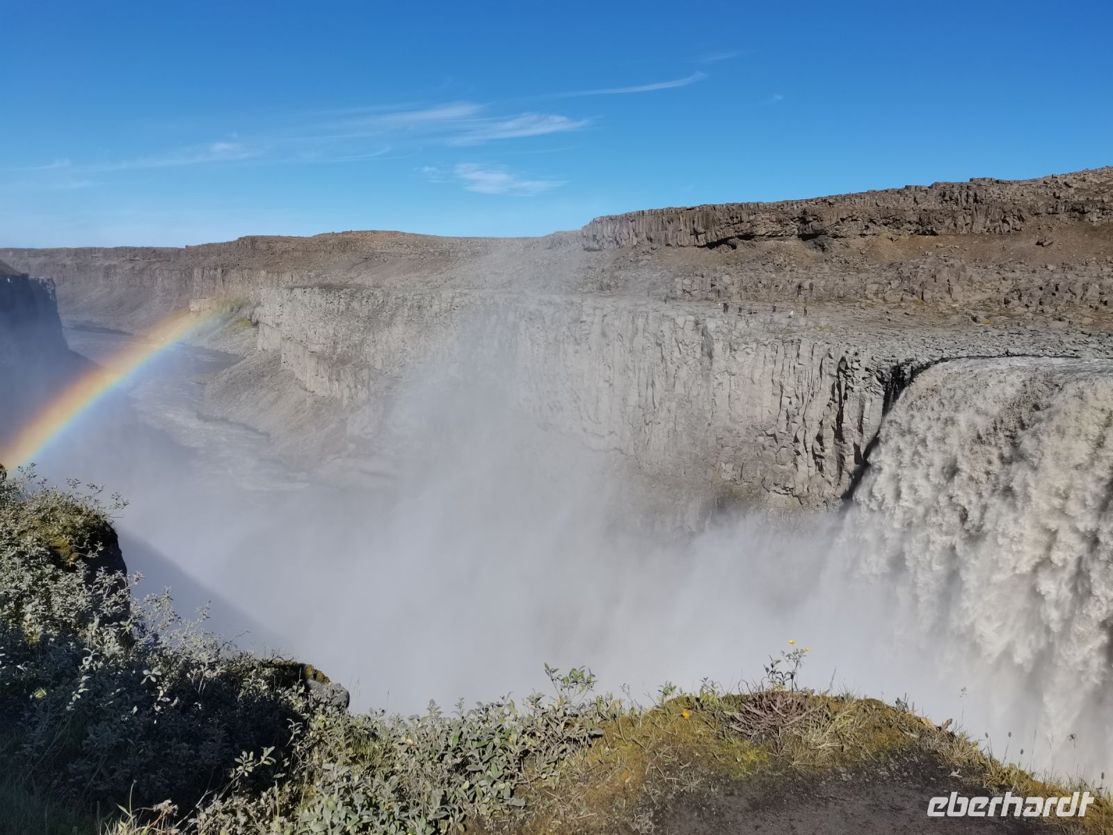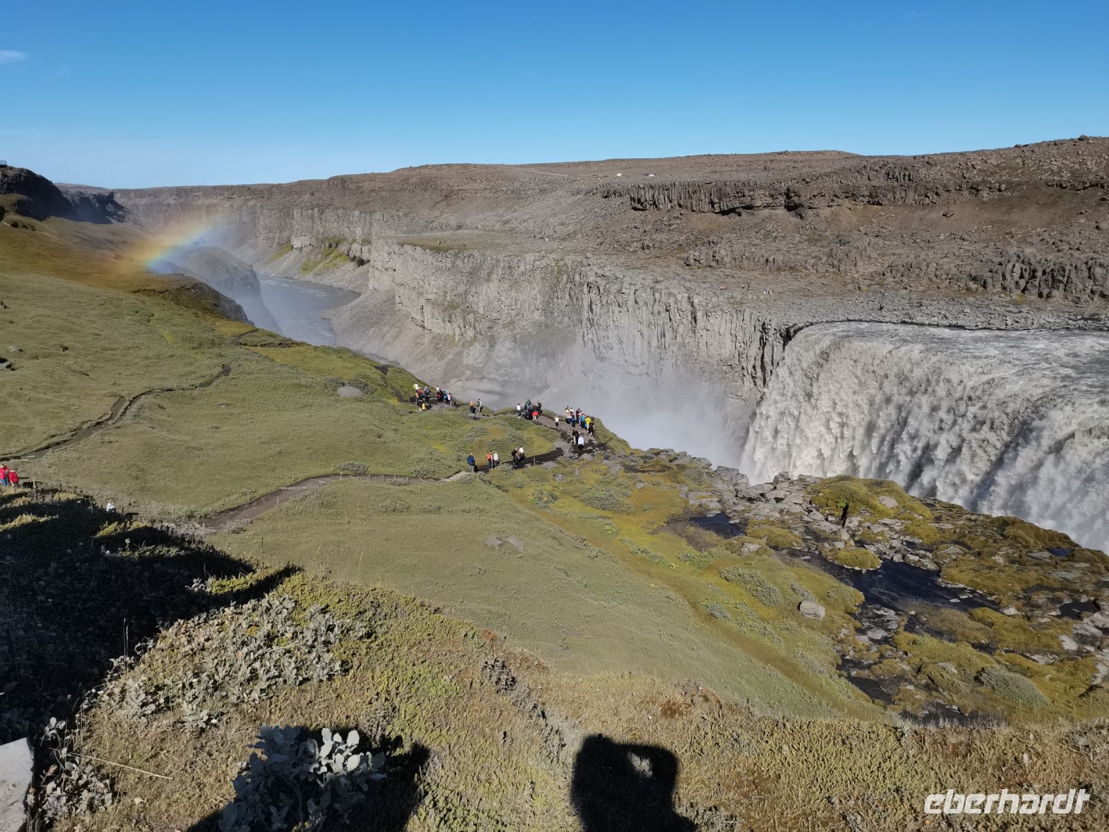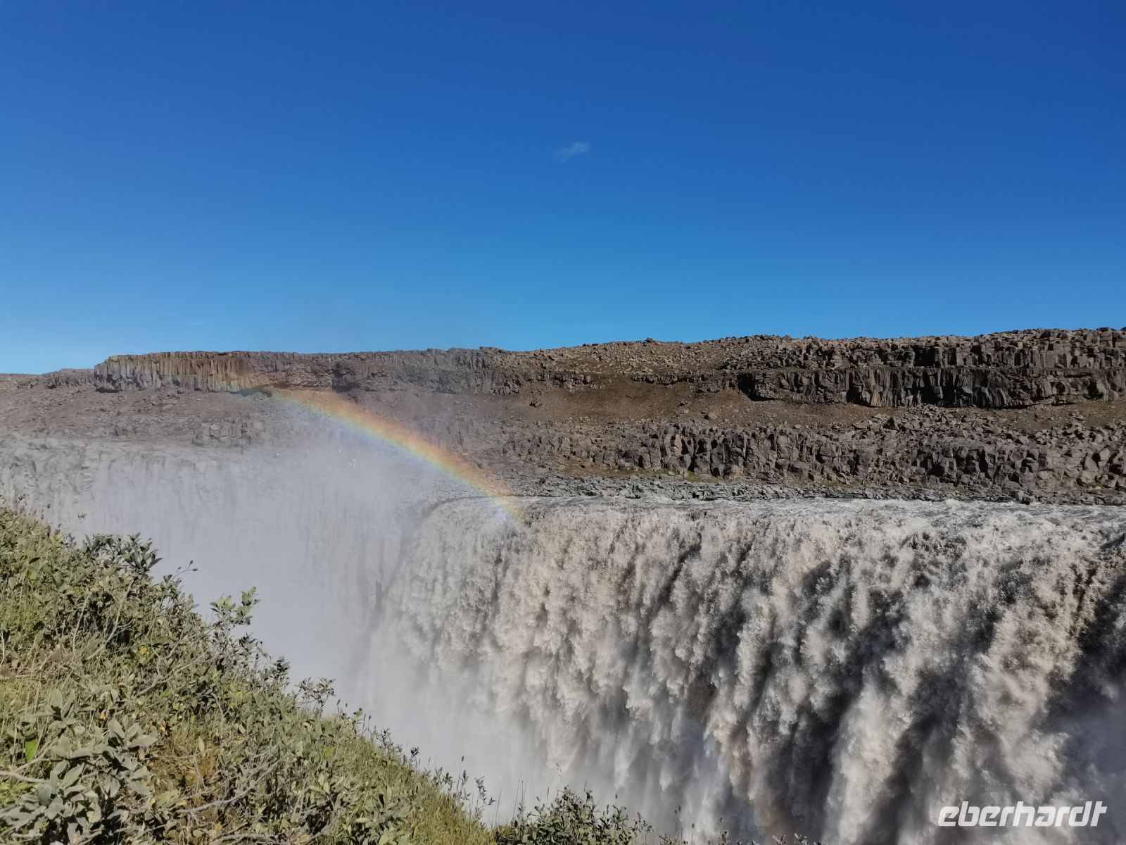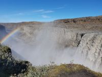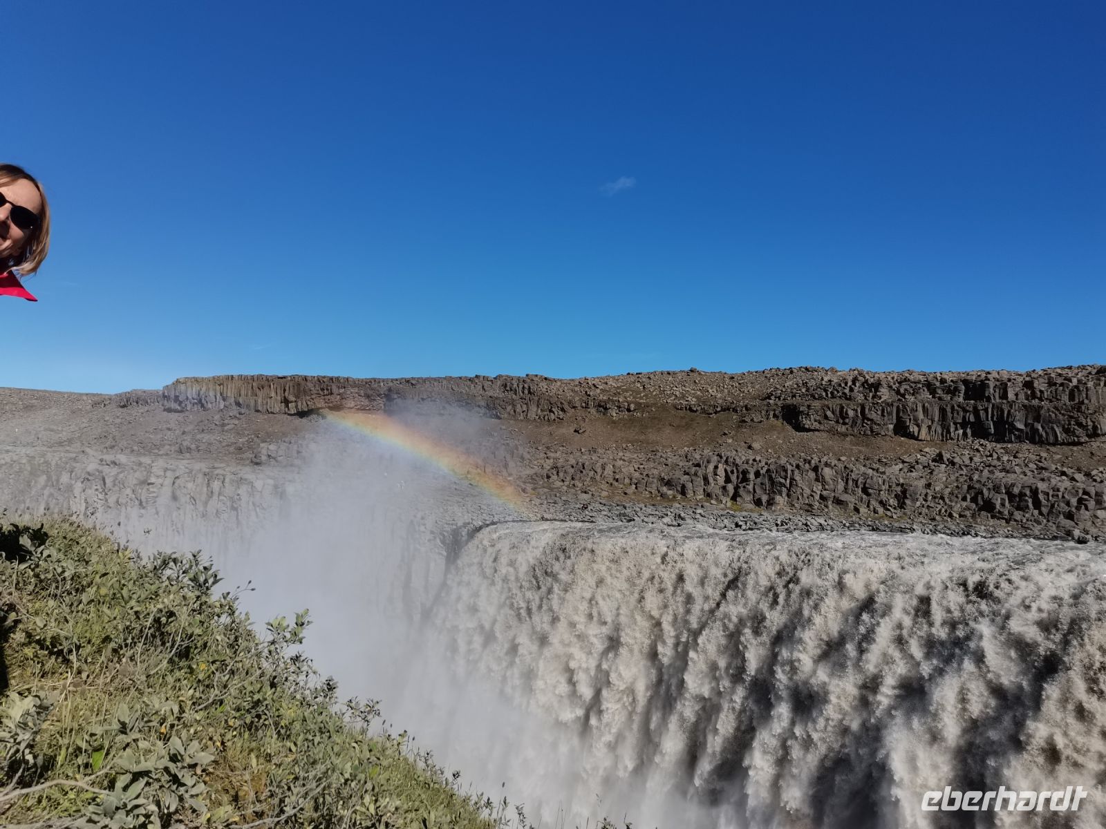 Nach der Stärkung erwartet uns schon das nächste Highlight: der Wasserfall Dettifoss, einer der größten Wasserfälle Europas. Wir erreichen ihn nach einem Spaziergang durch eindrucksvolle, breite Lavafelder. Ähnlich muss es auf dem Mond aussehen. Das Tosen kommt langsam näher. Auf einem ersten Balkon sehen wir das Ausmaß des riesigen Wasserfalls. Ein Regenbogen spannt sich bei dem sonnigen Wetter über die spritzende Gischt der Wassermassen. Über ein paar Stufen gelangen wir noch näher an die herabstürzenden Wassermassen. Das Gletscherwasser stürzt auf einer Breite von rund 100 Metern über 44 Meter in die Schlucht. Ganz in der Nähe liegt der 12 Meter hohe Wasserfall Selfoss, wir sehen ihn aus der Ferne. Ein herrliches Schauspiel, das uns zeigt, dass die Naturgewalt in Island wahrhaft unermesslich ist.