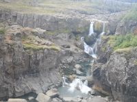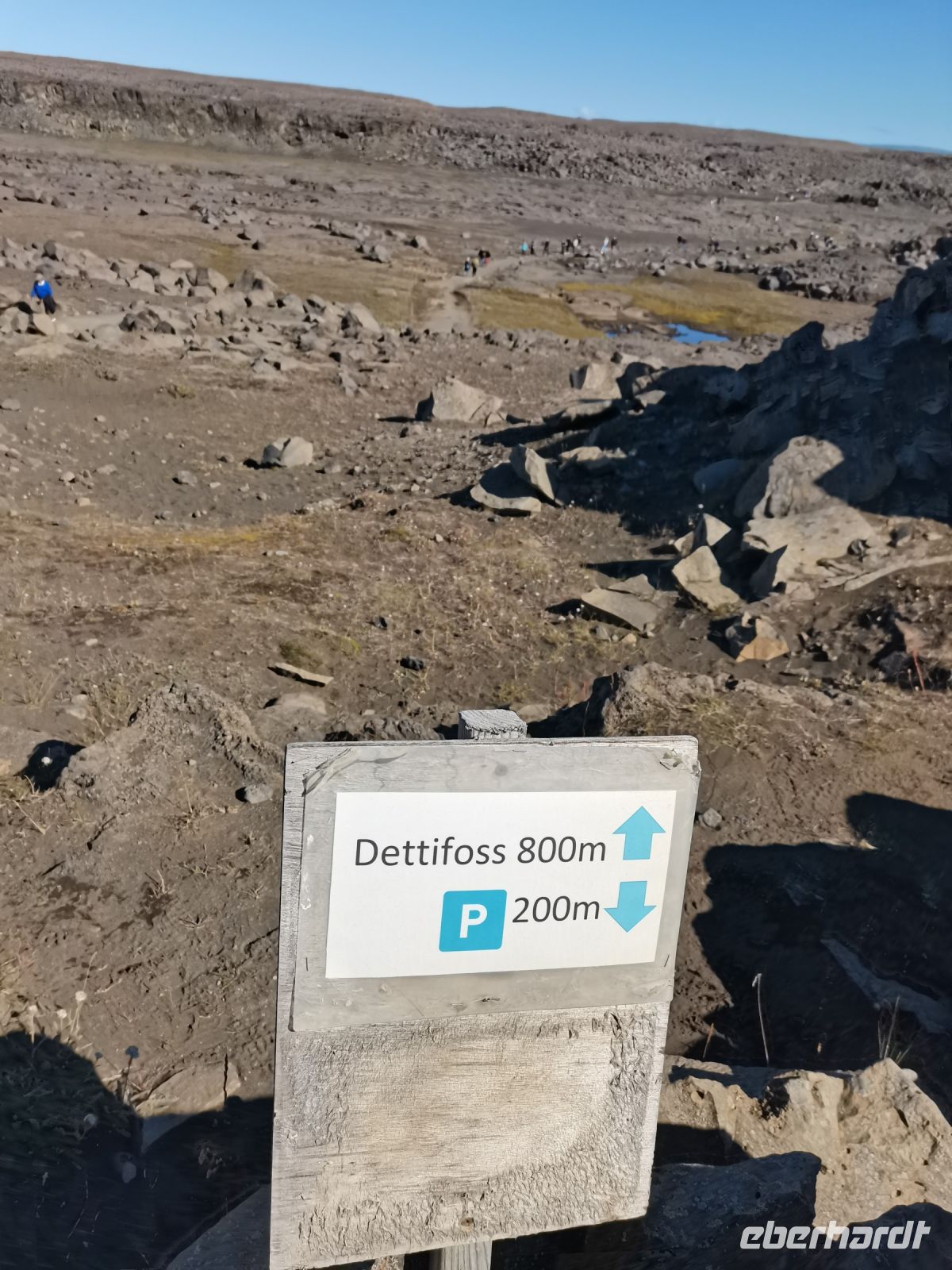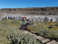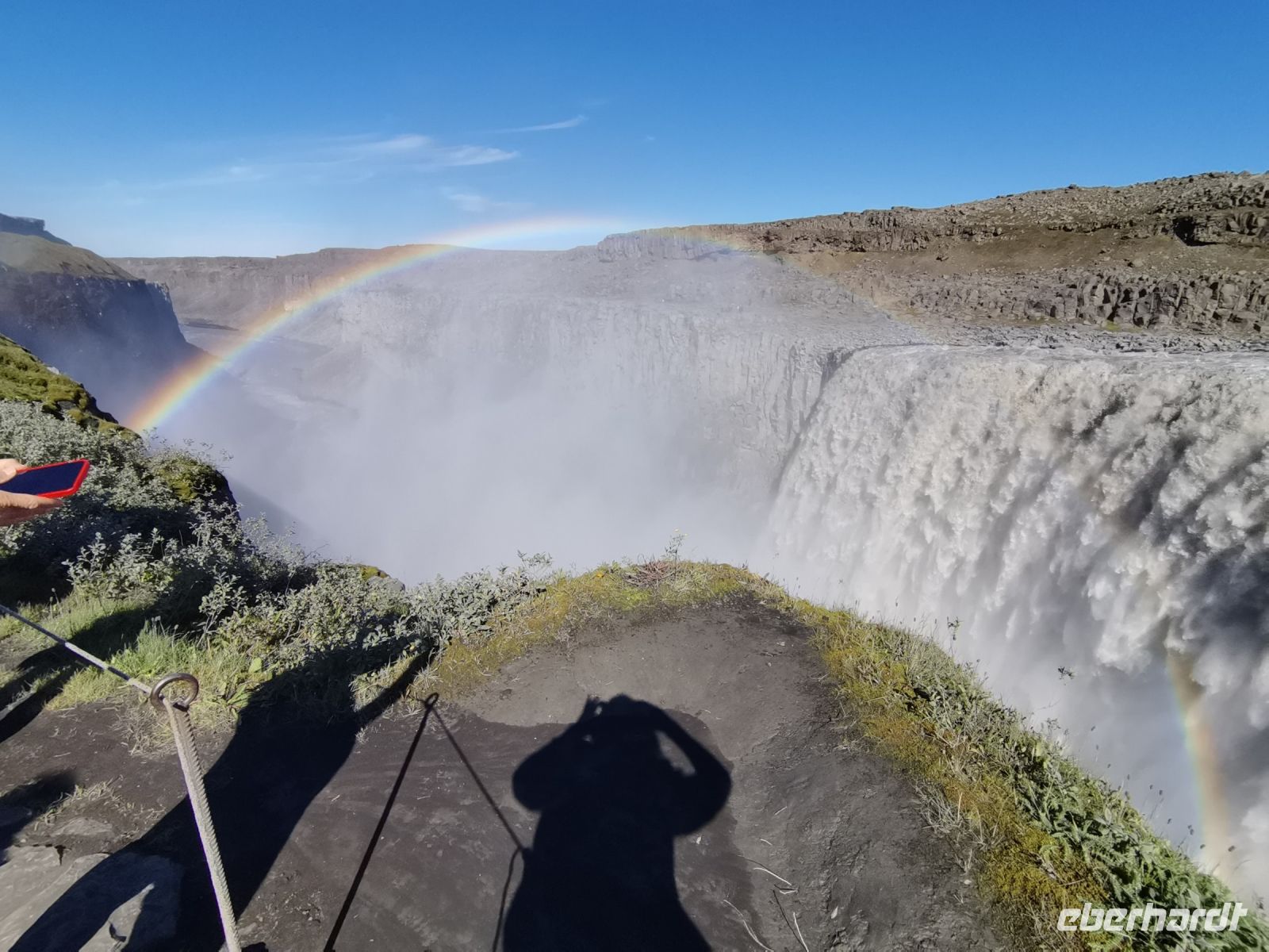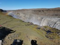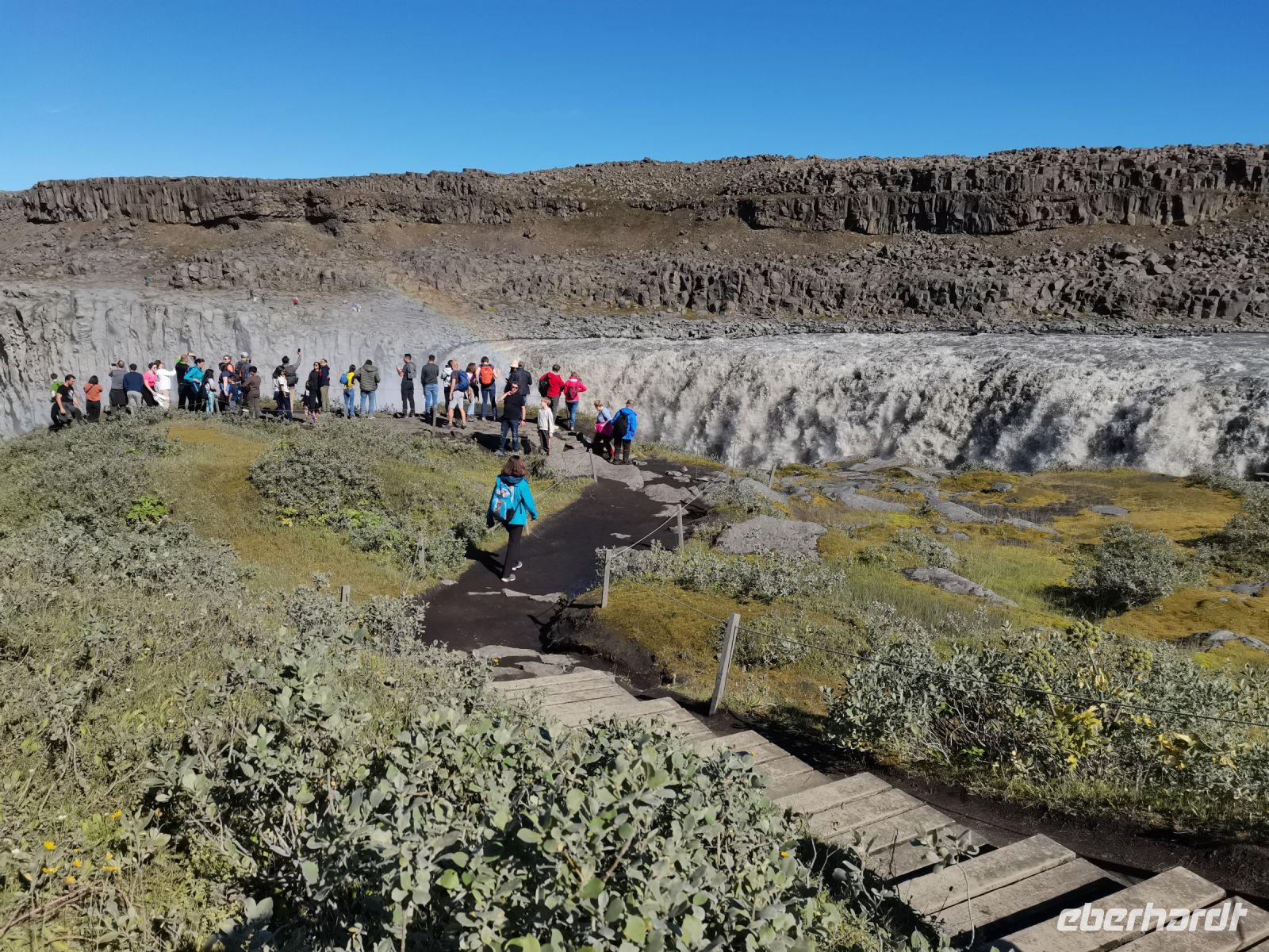 Nach der Stärkung erwartet uns schon das nächste Highlight: der Wasserfall Dettifoss, einer der größten Wasserfälle Europas. Wir erreichen ihn nach einem Spaziergang durch eindrucksvolle, breite Lavafelder. Ähnlich muss es auf dem Mond aussehen. Das Tosen kommt langsam näher. Auf einem ersten Balkon sehen wir das Ausmaß des riesigen Wasserfalls. Ein Regenbogen spannt sich bei dem sonnigen Wetter über die spritzende Gischt der Wassermassen. Über ein paar Stufen gelangen wir noch näher an die herabstürzenden Wassermassen. Das Gletscherwasser stürzt auf einer Breite von rund 100 Metern über 44 Meter in die Schlucht. Ganz in der Nähe liegt der 12 Meter hohe Wasserfall Selfoss, wir sehen ihn aus der Ferne. Ein herrliches Schauspiel, das uns zeigt, dass die Naturgewalt in Island wahrhaft unermesslich ist.