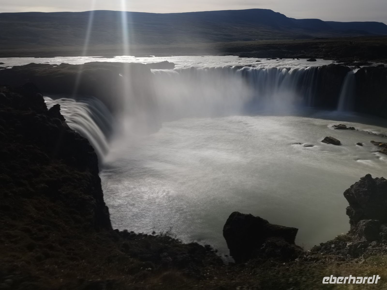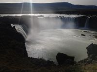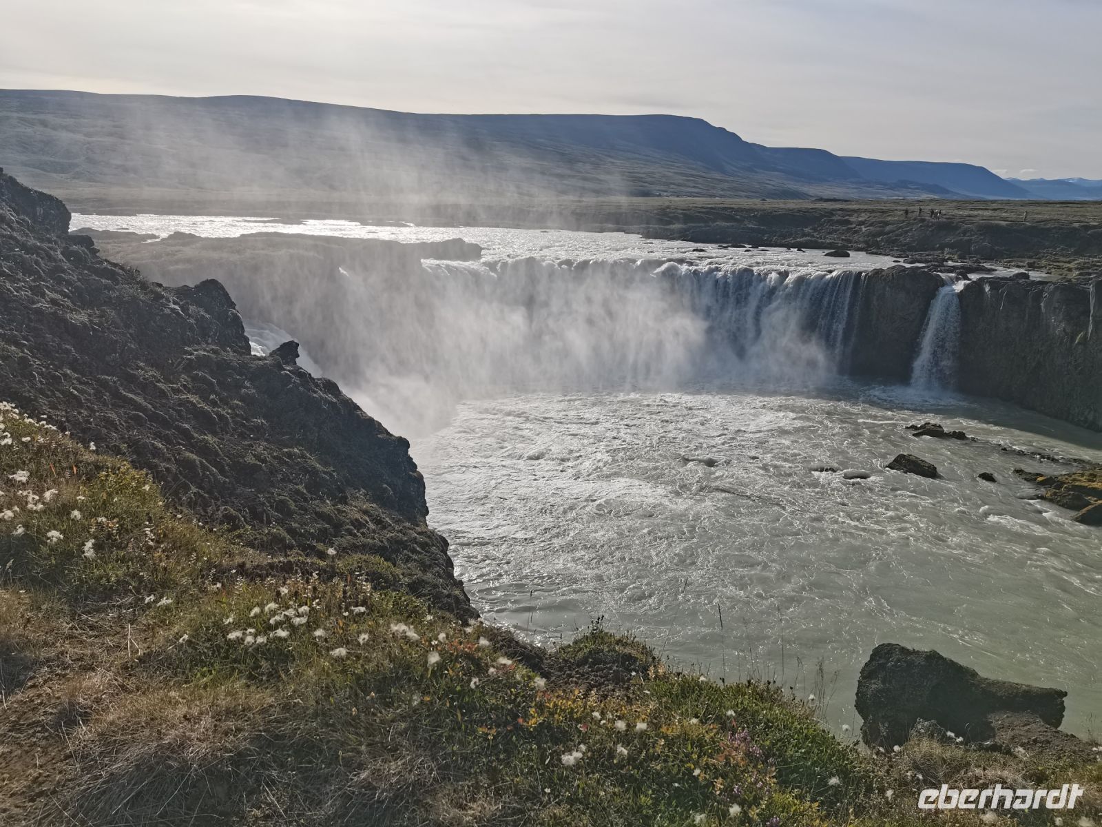 Über das Lavafeld mit riesigen Steinbrocken kehren wir zurück zum Busparkplatz. Auf der Rückfahrt zum Hotel kommen wir am "Mückensee-Gebiet" (Myvatn) vorbei, das wir morgen besuchen werden. Eine letzte Etappe liegt vor unserer Rückkehr nach Akureyri noch auf dem Weg: der Godafoss-Wasserfall! Nach einem kurzen Spaziergang gelangen wir zum "Wasserfall der Götter". Auch diesem Wasserfall liegt natürlich eine Legende zugrunde. Die Wassermassen stürzen beeindruckend in eine breite Schlucht. Mit wunderschönen Bildern kehren wir in unser Hotel in Akureyri zurück und genießen das köstliche Abendessen in unserem feinen Restaurant im Botanischen Garten.