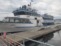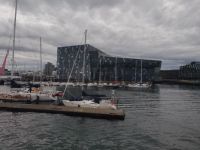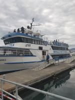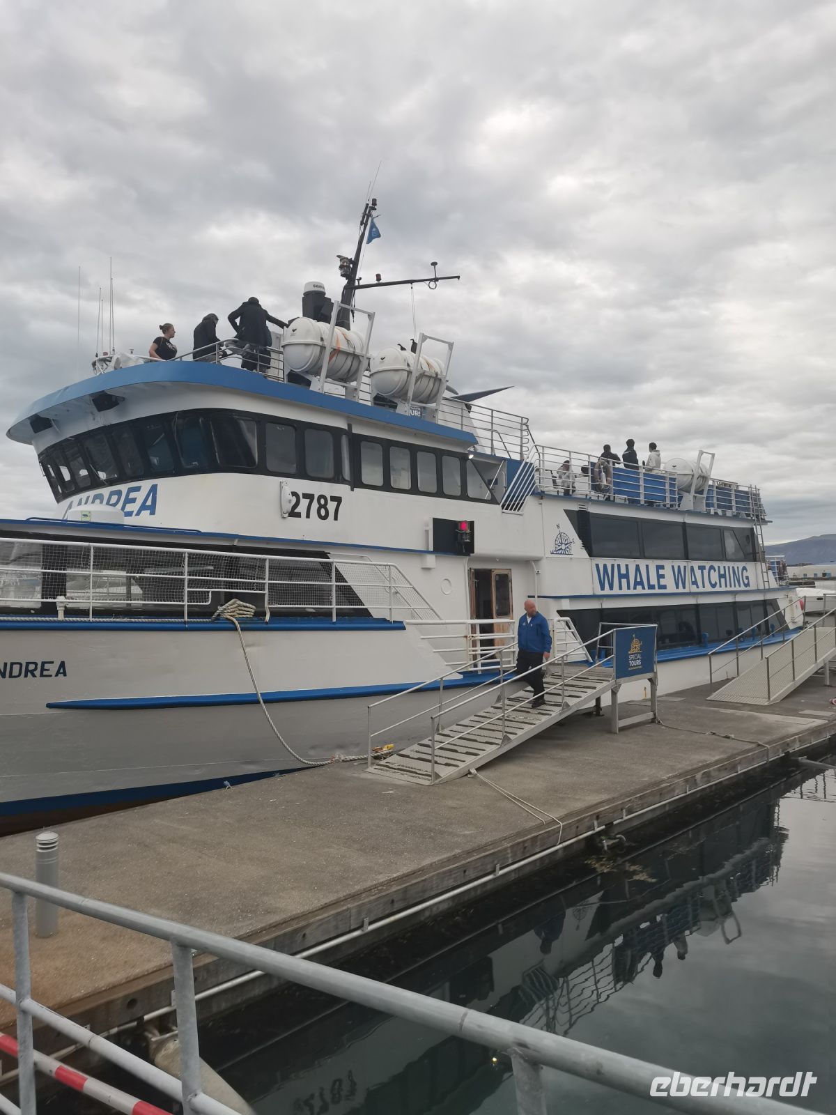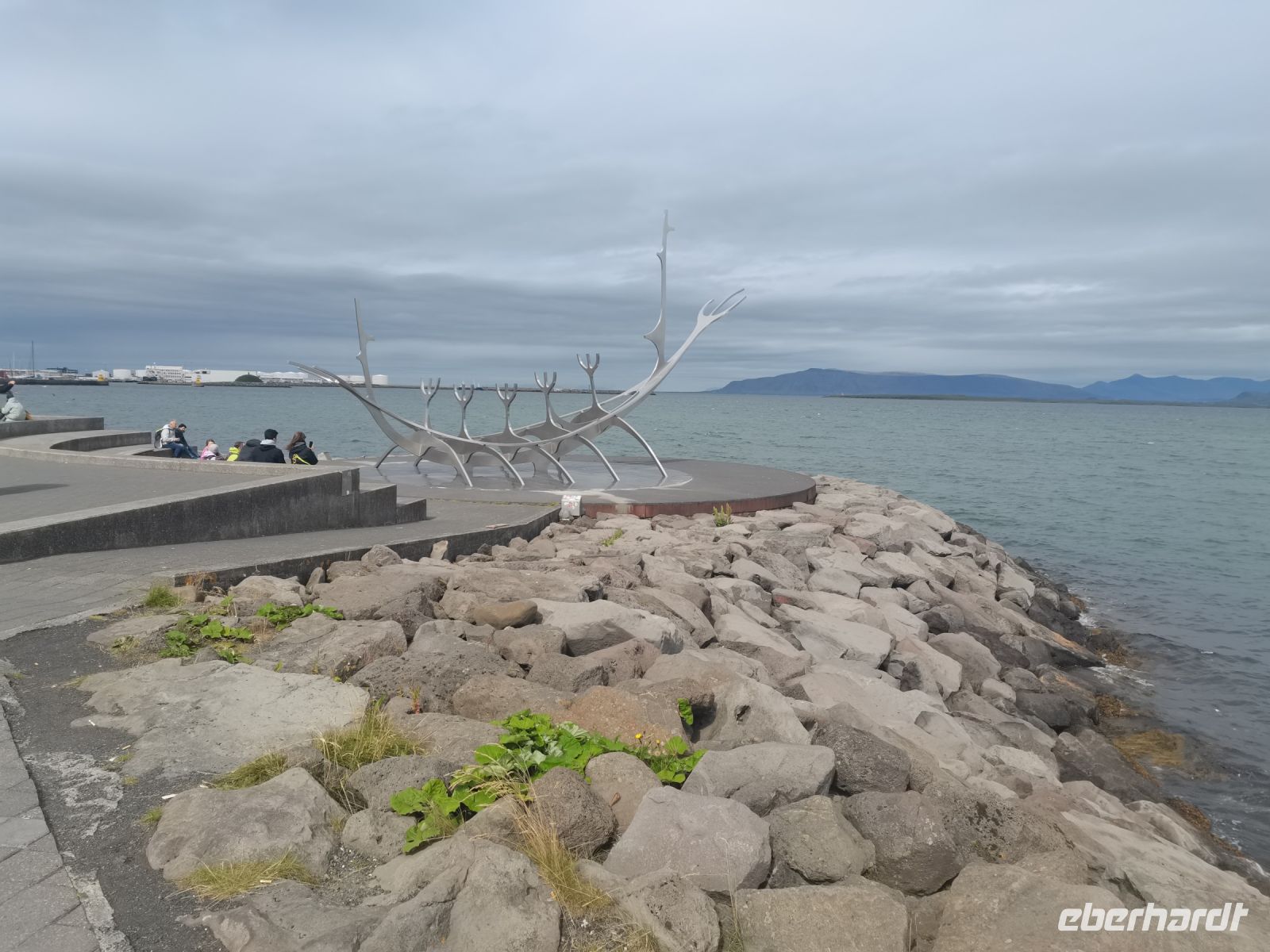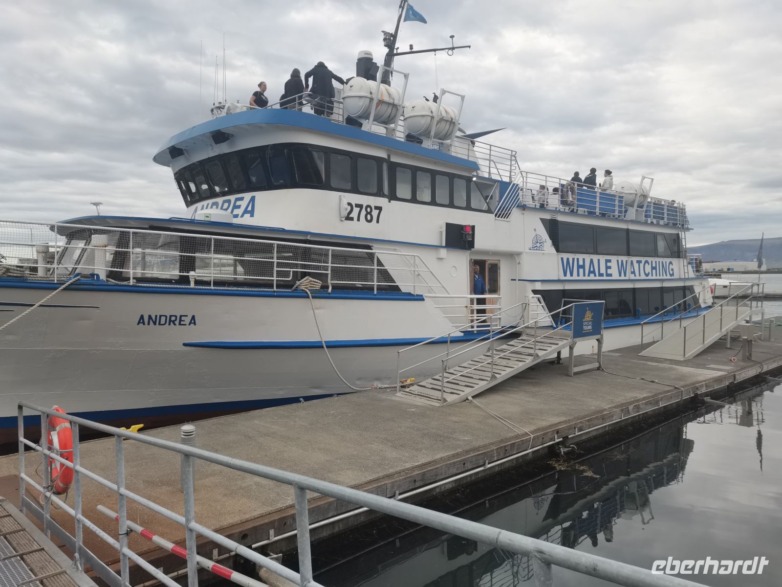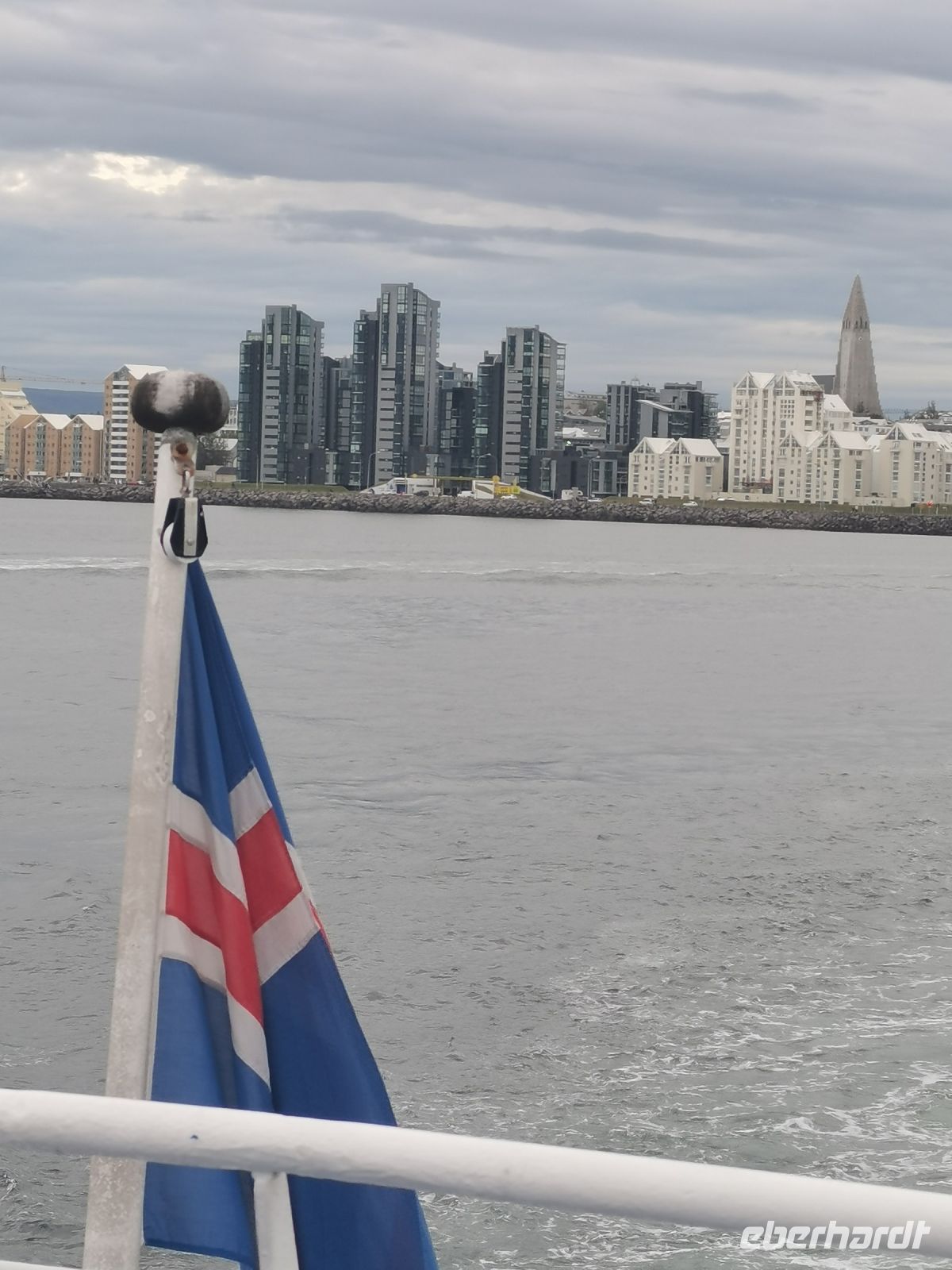 Fast alle haben aber noch ein weiteres Highlight im Programm: Die optionale Walbeobachtungs-Tour mit dem Schiff vom Hafen in Reykjavik. Die Tour gibt einen wunderbaren Ausblick vom Meer auf die Küste, nur Wale sehen wir leider nicht. Dafür ein paar Delfine und das herrliche Panorama von Reykjavik, das sich über die lange Küste erstreckt.