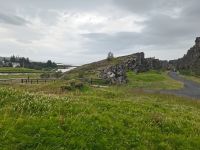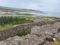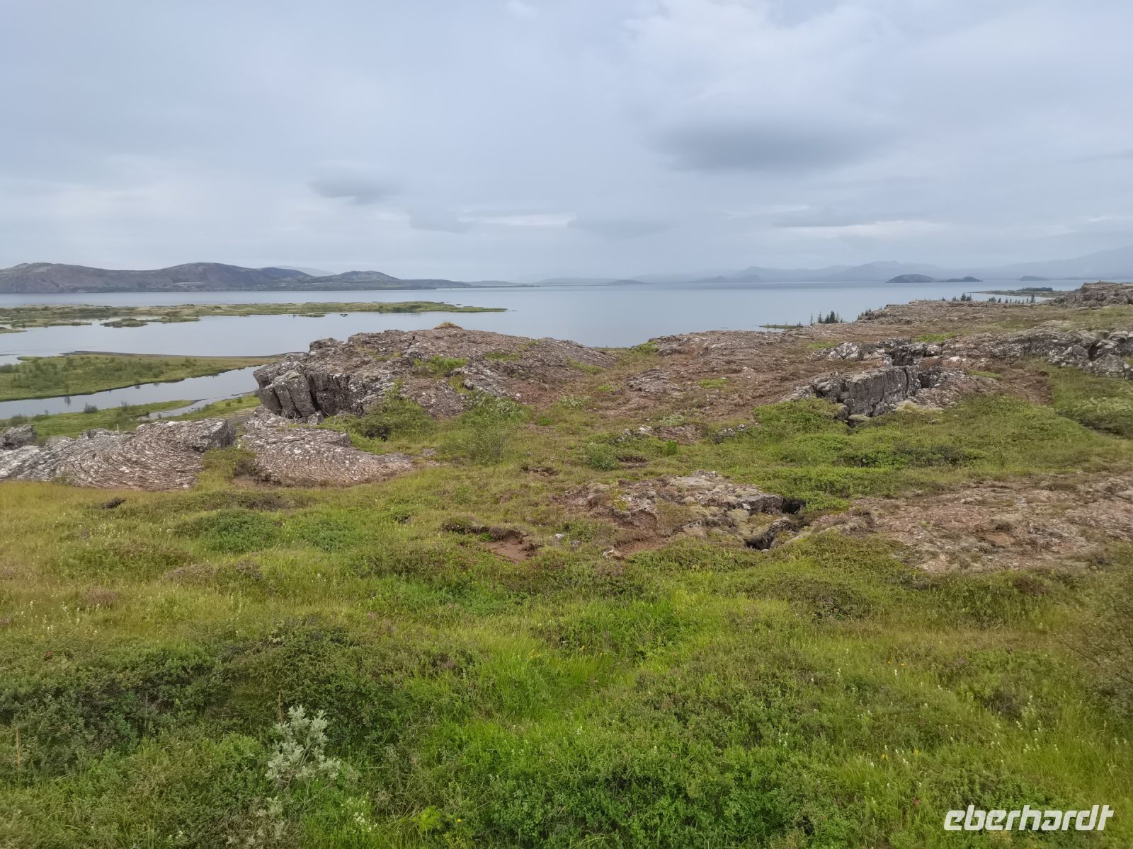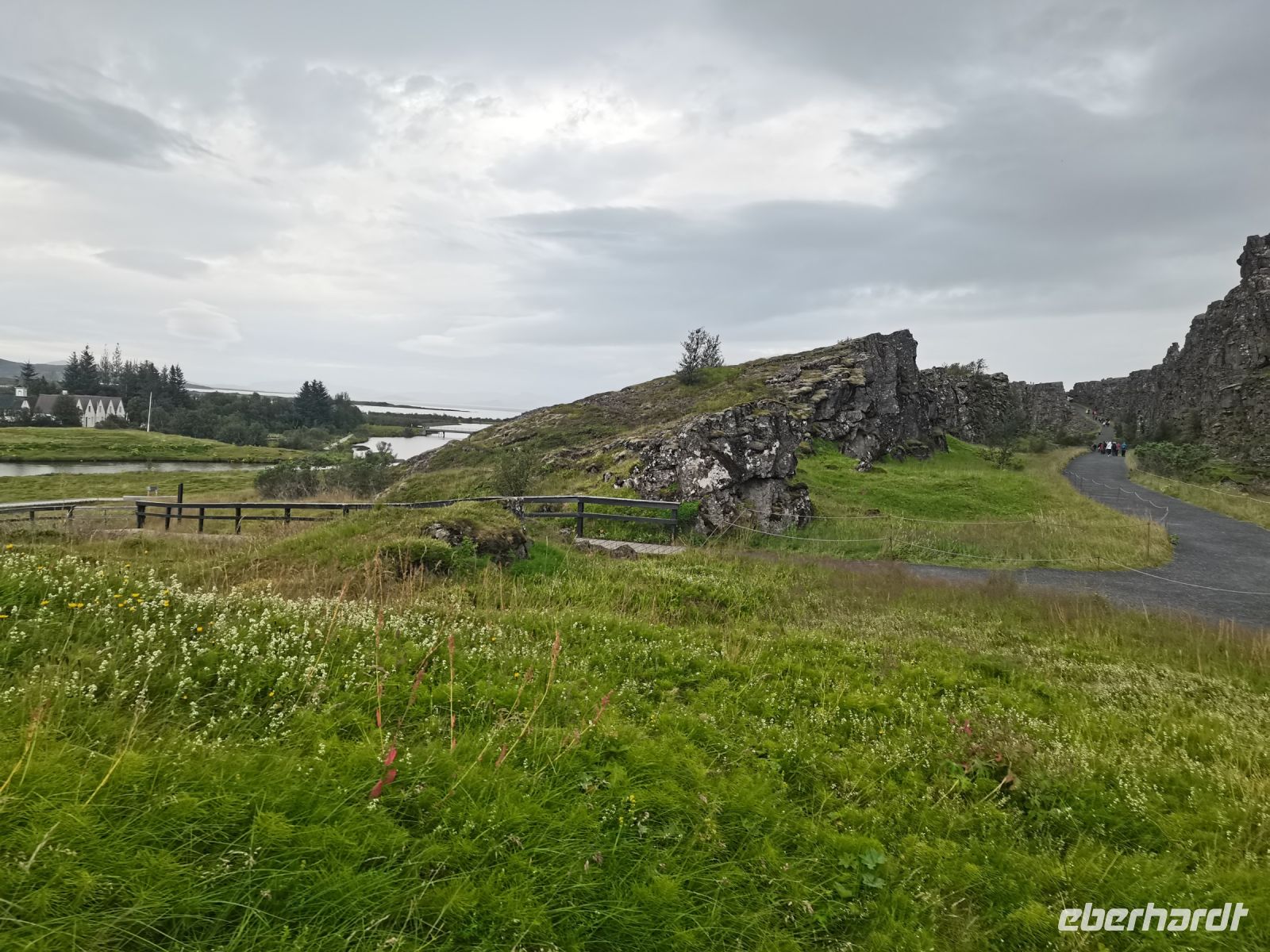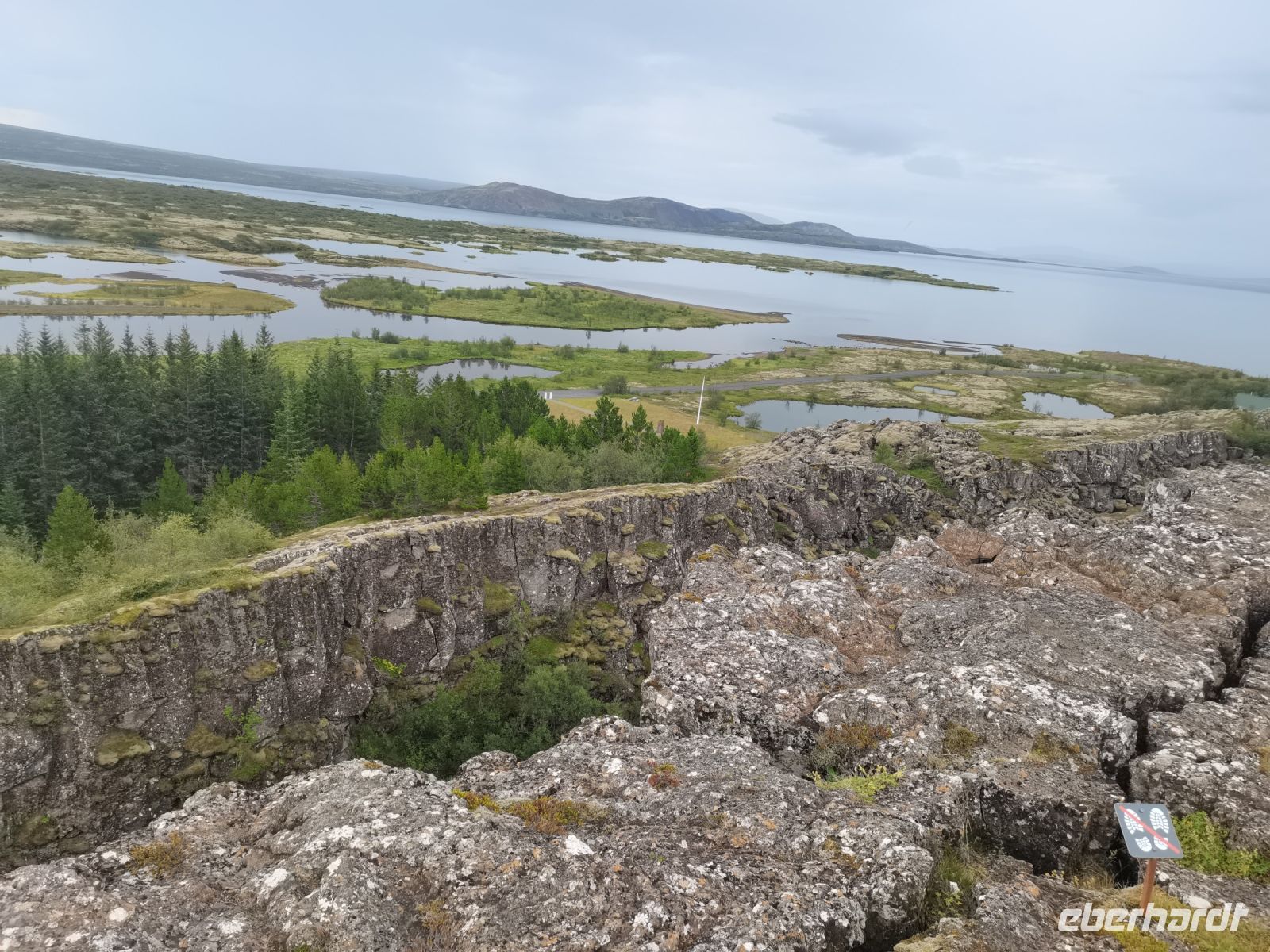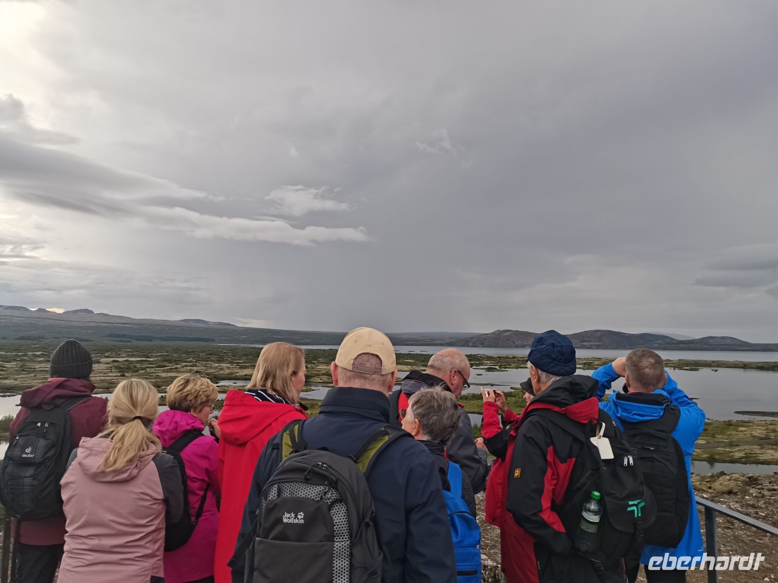 Nach rund einer Stunde erreichen wir das Besucherzentrum des Nationalparks. Von einem Panoramapunkt verschaffen wir uns einen Überblick über den See und das durch viele Vulkanausbrüche zerklüftete Gelände. Genau hier treffen die amerikanische und die eurasische tektonische Platte aufeinander. Was das bedeutet, sehen wir in der eindrucksvollen Grabenbruchzone, die wir bei einem Spaziergang durchwandern. Die ersten Siedler kamen aus Norwegen und Irland im 9. Jahrhundert nach Island, erfahren wir. Auf dem Weg zu dem Platz, an dem das erste isländische demokratische Parlament vor dem Volk ausgerufen wurde, bestaunen wir bizarre Felsformen. Das Versammlungsfeld, auf dem auch heute noch Nationalfeiertage gefeiert werden, war Schauplatz für den einzigartigen Kompromiss, mit dem der Gesetzessprecher Þorgeir Ljósvetningagoði Þorkelsson Islands friedliche Konversion zum Christentum durchsetzte. Den Heiden war es nämlich weiterhin erlaubt, die nordischen Götter im Privaten zu verehren. Hier auf dem Gesetzesberg, wo wir stehen, entstand also auf friedliche Weise eine der ersten Demokratien der Welt. Eine Flagge markiert die Stelle auf dem Berg. Die Isländer sind sehr stolz auf diesen bemerkenswerten Ort, der seit 2004 zum Weltkulturerbe der UNESCO gehört, und wir machen natürlich viele Fotos.