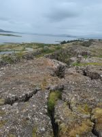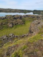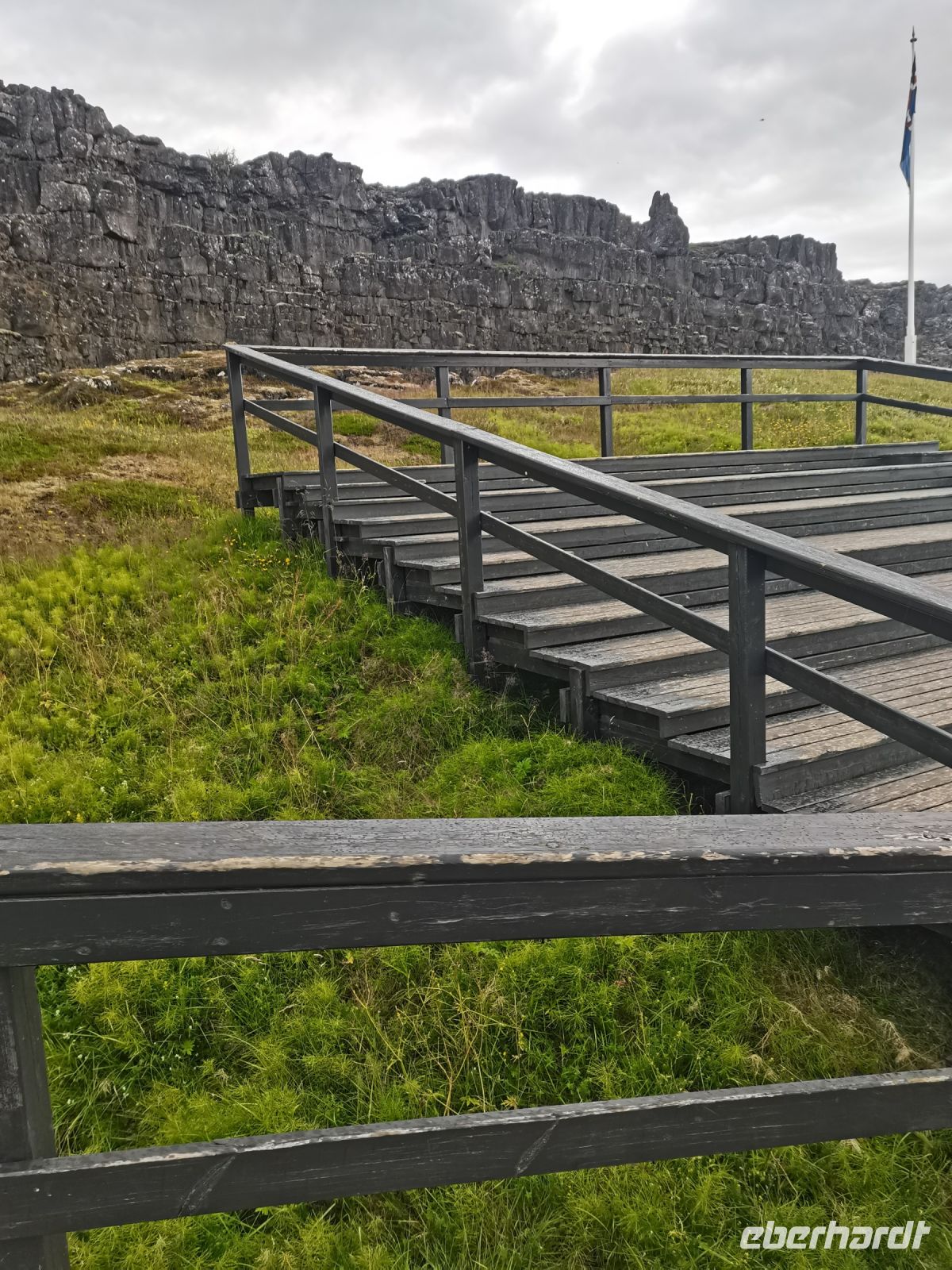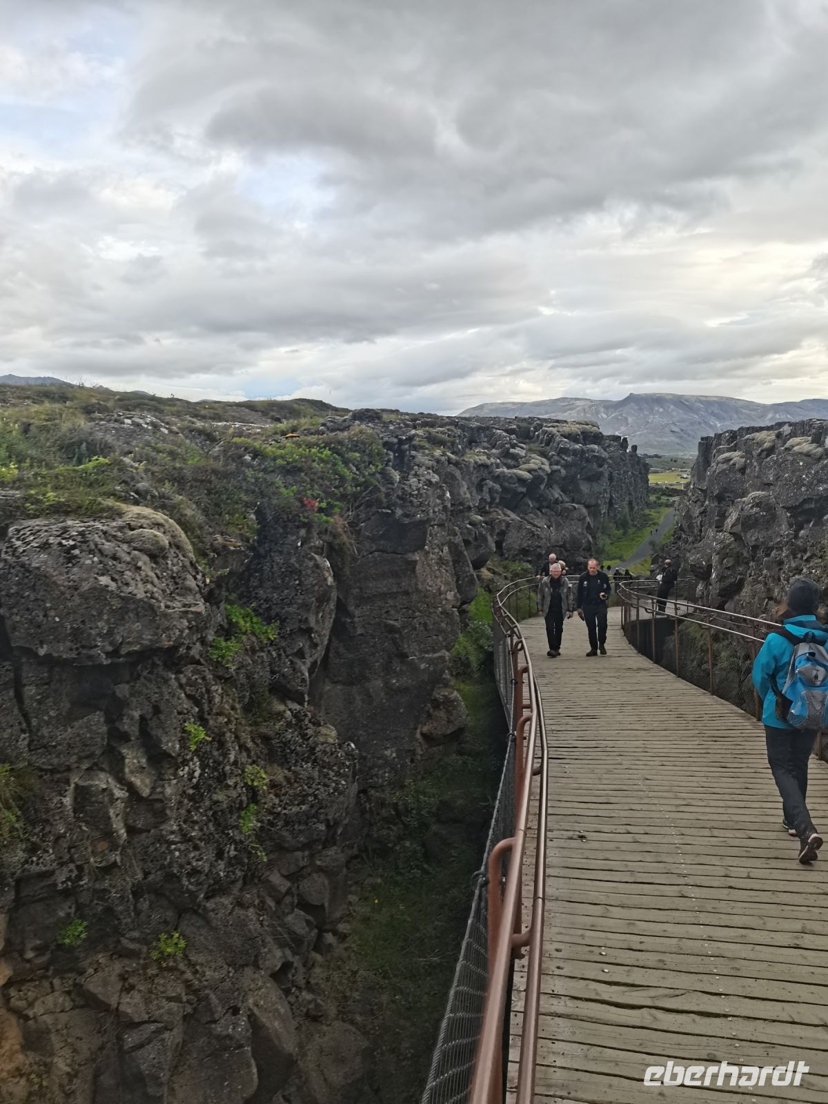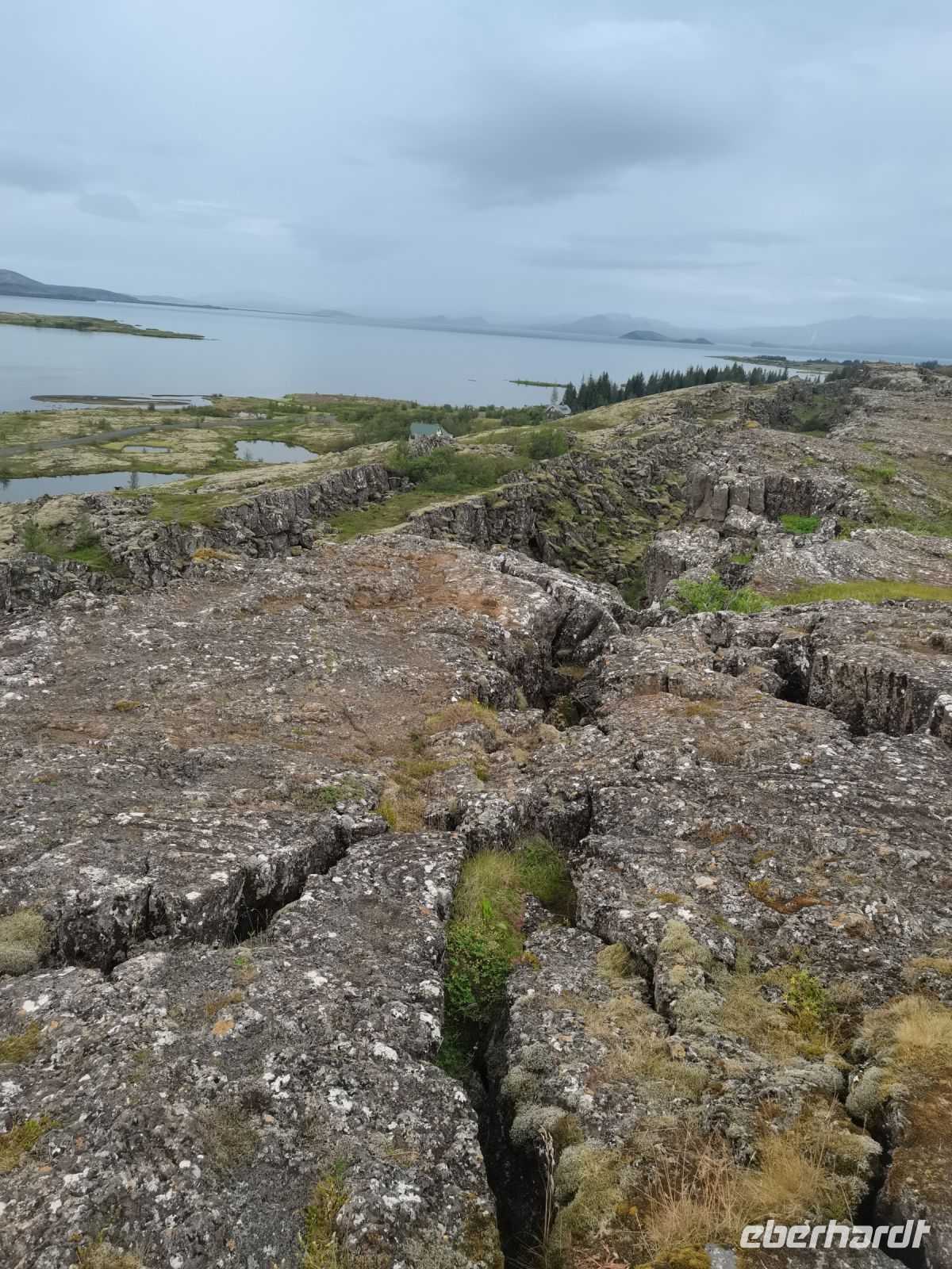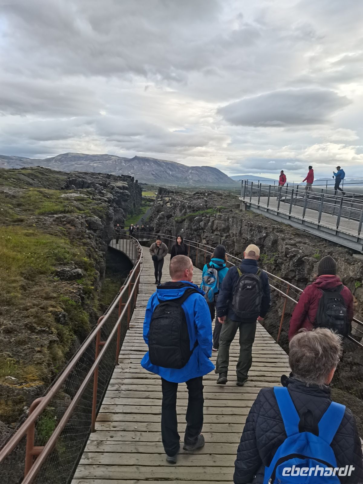 Nach rund einer Stunde erreichen wir das Besucherzentrum des Nationalparks. Von einem Panoramapunkt verschaffen wir uns einen Überblick über den See und das durch viele Vulkanausbrüche zerklüftete Gelände. Genau hier treffen die amerikanische und die eurasische tektonische Platte aufeinander. Was das bedeutet, sehen wir in der eindrucksvollen Grabenbruchzone, die wir bei einem Spaziergang durchwandern. Die ersten Siedler kamen aus Norwegen und Irland im 9. Jahrhundert nach Island, erfahren wir. Auf dem Weg zu dem Platz, an dem das erste isländische demokratische Parlament vor dem Volk ausgerufen wurde, bestaunen wir bizarre Felsformen. Das Versammlungsfeld, auf dem auch heute noch Nationalfeiertage gefeiert werden, war Schauplatz für den einzigartigen Kompromiss, mit dem der Gesetzessprecher Þorgeir Ljósvetningagoði Þorkelsson Islands friedliche Konversion zum Christentum durchsetzte. Den Heiden war es nämlich weiterhin erlaubt, die nordischen Götter im Privaten zu verehren. Hier auf dem Gesetzesberg, wo wir stehen, entstand also auf friedliche Weise eine der ersten Demokratien der Welt. Eine Flagge markiert die Stelle auf dem Berg. Die Isländer sind sehr stolz auf diesen bemerkenswerten Ort, der seit 2004 zum Weltkulturerbe der UNESCO gehört, und wir machen natürlich viele Fotos.