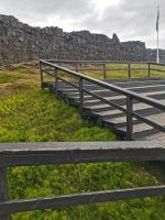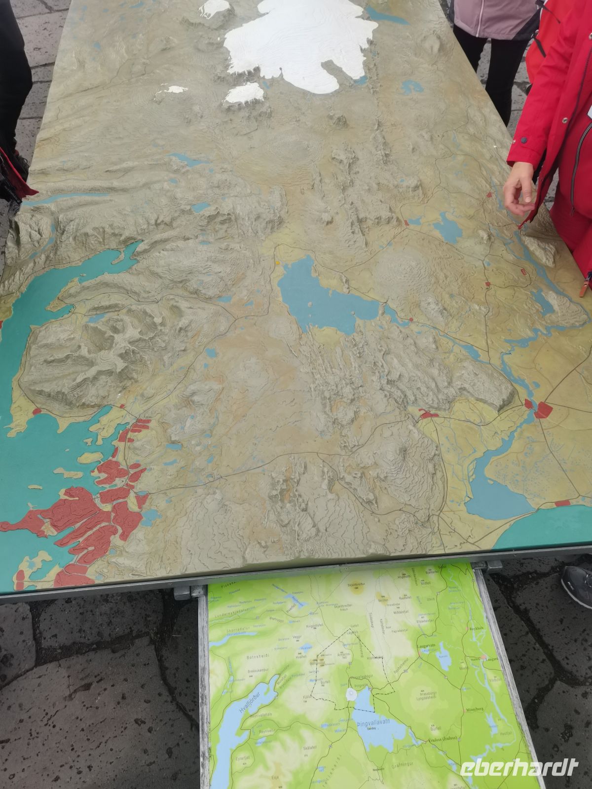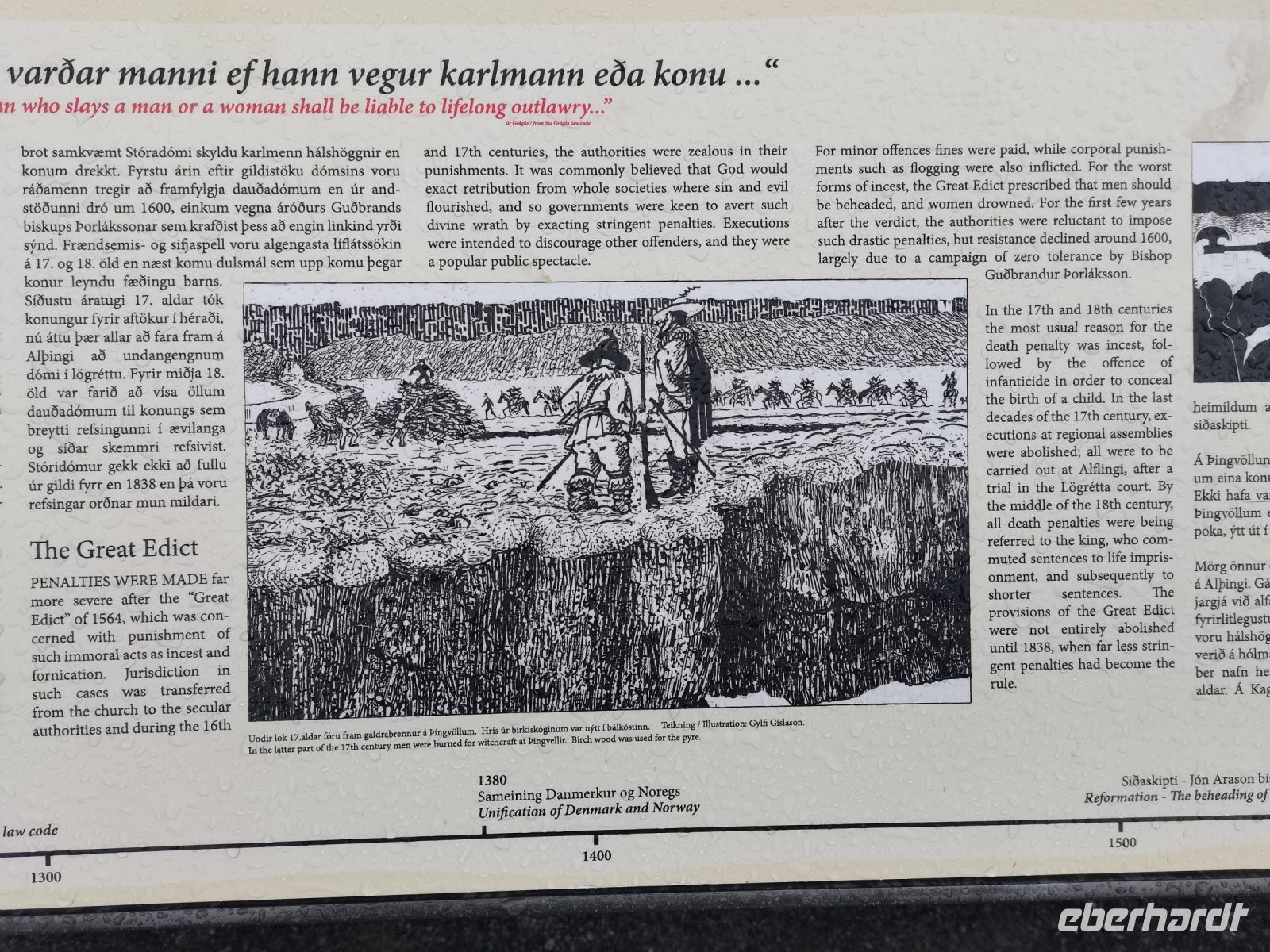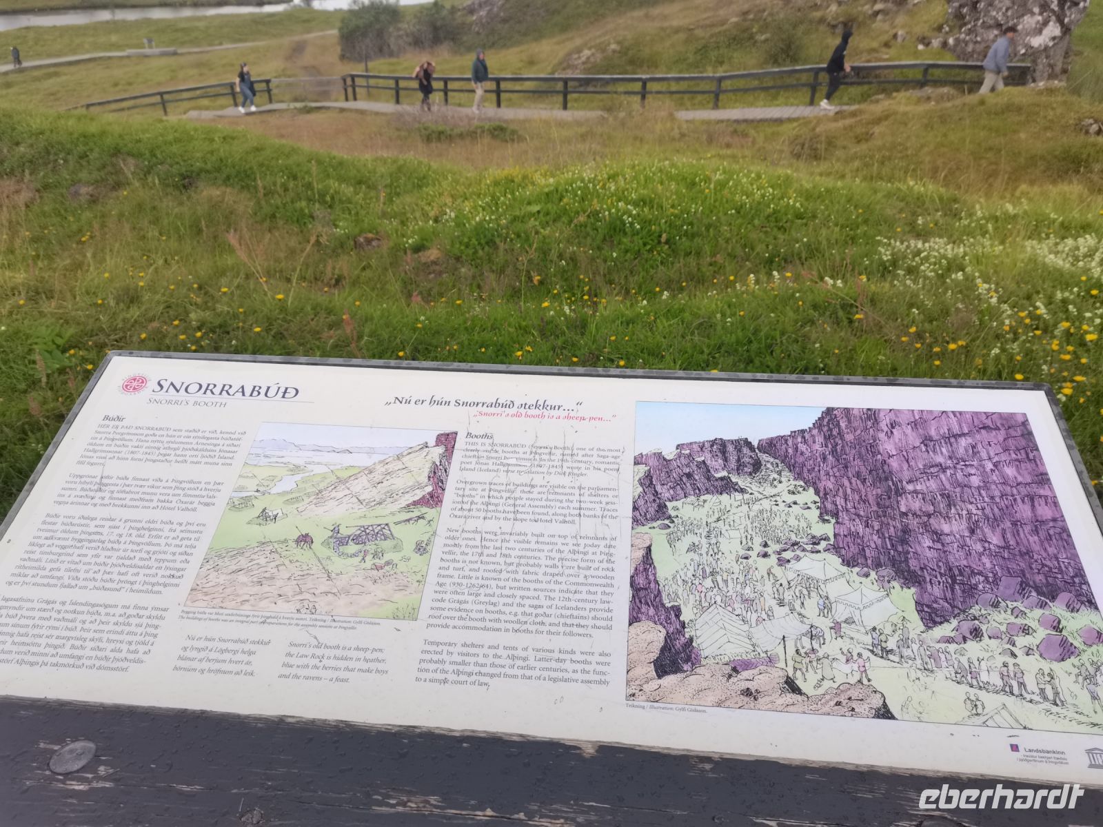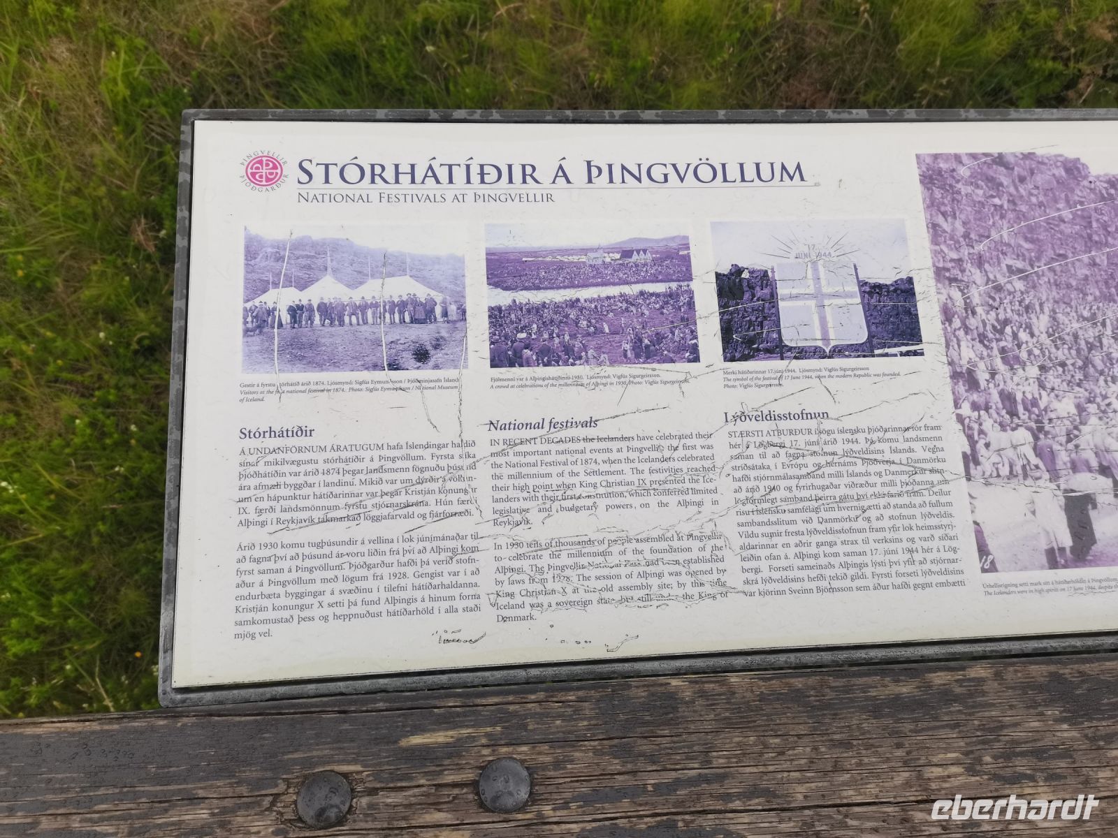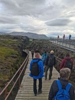 Nach rund einer Stunde erreichen wir das Besucherzentrum des Nationalparks. Von einem Panoramapunkt verschaffen wir uns einen Überblick über den See und das durch viele Vulkanausbrüche zerklüftete Gelände. Genau hier treffen die amerikanische und die eurasische tektonische Platte aufeinander. Was das bedeutet, sehen wir in der eindrucksvollen Grabenbruchzone, die wir bei einem Spaziergang durchwandern. Die ersten Siedler kamen aus Norwegen und Irland im 9. Jahrhundert nach Island, erfahren wir. Auf dem Weg zu dem Platz, an dem das erste isländische demokratische Parlament vor dem Volk ausgerufen wurde, bestaunen wir bizarre Felsformen. Das Versammlungsfeld, auf dem auch heute noch Nationalfeiertage gefeiert werden, war Schauplatz für den einzigartigen Kompromiss, mit dem der Gesetzessprecher Þorgeir Ljósvetningagoði Þorkelsson Islands friedliche Konversion zum Christentum durchsetzte. Den Heiden war es nämlich weiterhin erlaubt, die nordischen Götter im Privaten zu verehren. Hier auf dem Gesetzesberg, wo wir stehen, entstand also auf friedliche Weise eine der ersten Demokratien der Welt. Eine Flagge markiert die Stelle auf dem Berg. Die Isländer sind sehr stolz auf diesen bemerkenswerten Ort, der seit 2004 zum Weltkulturerbe der UNESCO gehört, und wir machen natürlich viele Fotos.