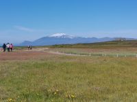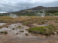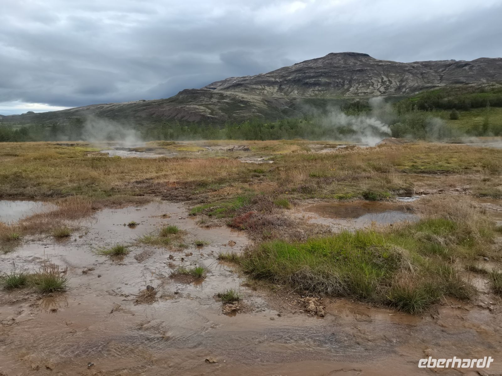 Bei der nächsten Etappe treffen wir auf das Hochtemperaturgelände Haukadalur, das Gebiet der Geysire und heißen Quellen. Wir sehen schon aus der Ferne die vielen Menschen, die auf die nächste Fontäne des Geysirs Strokkur warten. Ungefähr alle 10 Minuten platzt mit großer Wucht die rund 30 Meter hohe Wassersäule aus der heißen Quelle, ein herrliches Schauspiel. Der Namensgeber aller Geysire weltweit, der "Große Geysir", sprüht längst nicht mehr wie der Strokkur, liegt aber nur ein paar Schritte entfernt und wirkt heute fast wie ein kleiner See. Wir haben Zeit zum Verweilen: es blubbert, es brodelt, es kocht, und wieder schießt das Wasser aus dem Loch in die Höhe. Nachdem wir uns in der Umgebung noch weitere spannende Phänomene angeschaut haben, machen wir uns auf den Weg ins Hotel nach Reykjavik, vorbei an abwechslungsreichen Landschaften, die schon Vorfreude auf den nächsten Tag wecken.