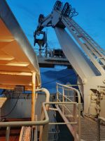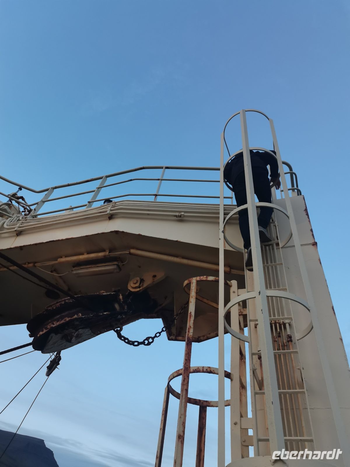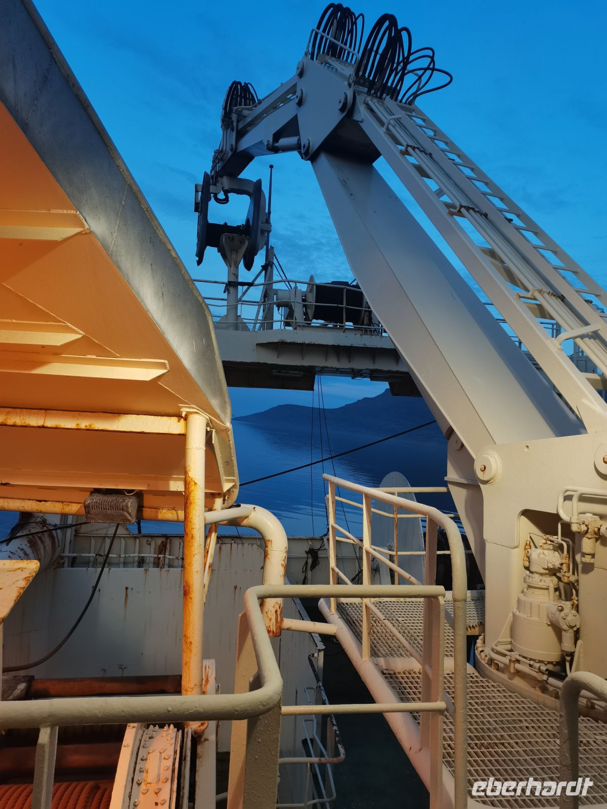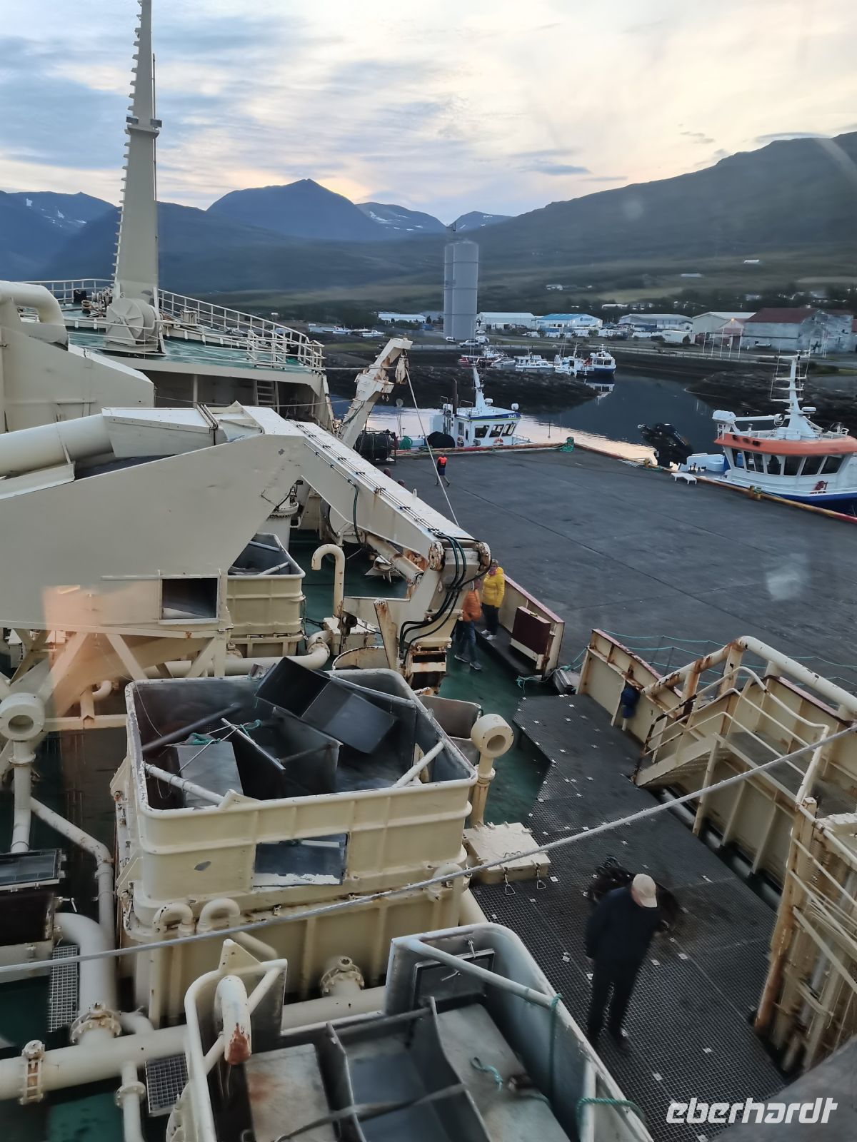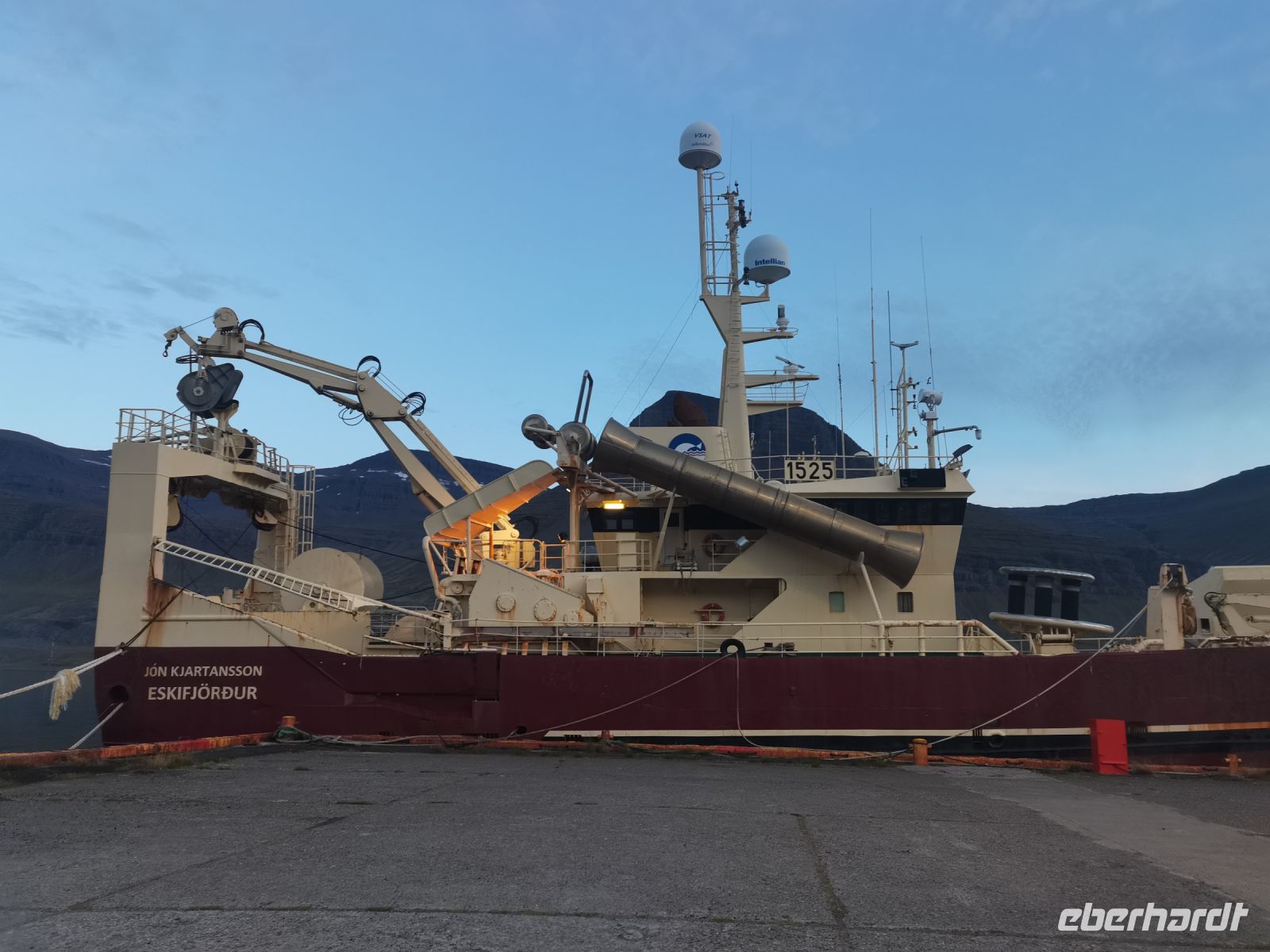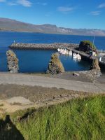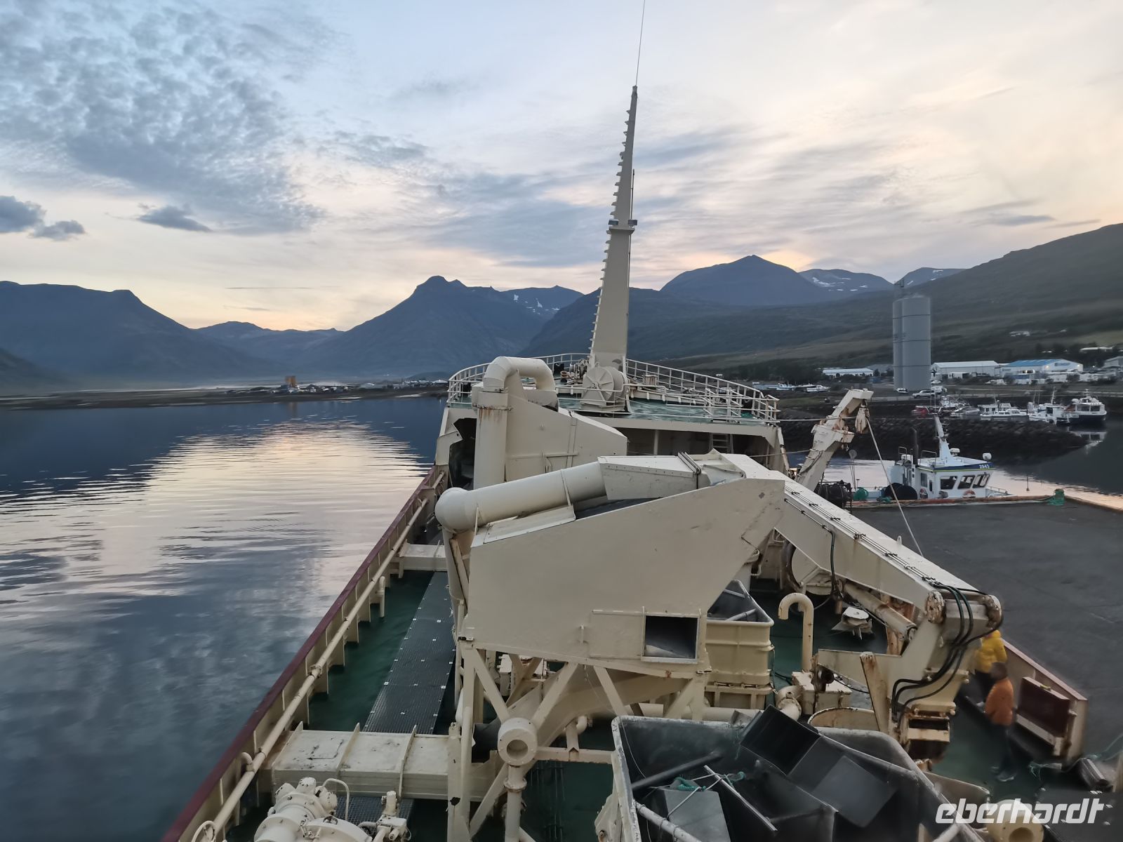Durch die eiszeitlich geprägte Landschaft gelangen wir mit dem Bus an die Ostfjorde, wo wir heute in Reydarfjördur übernachten. Wir legen noch einen Stopp in einem modernen Hochlandcafé für eine Kaffeepause ein, bevor wir unsere Reise fortsetzen. Nach dem Check-in erwartet uns ein Abendessen. Trotz des ereignisreichen Tages machen wir noch einen kurzen Spaziergang durch den Ort. Unerwartet treffen wir auf ein verlassenes Schiff, das im Hafen angedockt liegt. Ein Licht brennt in der Kommandozentrale. Können wir noch Kontakt zu den einheimischen Seeleuten aufnehmen? Ein Teil unserer Gruppe wagt sich auf die spannende Erkundungstour, doch es bleibt offen, wo die Mannschaft verblieb und für welchen Zweck das riesige Schiff im Hafen verankert ist. Jedenfalls in unserer Phantasie.