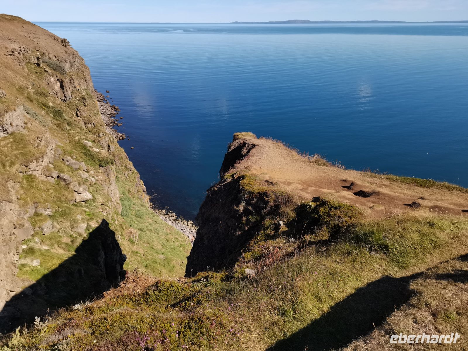 Wir fahren entlang der Panoramastraße und stoppen kurz an einem glatten Forellensee, in dem sich die umliegenden Berge spiegeln. Den Wasserfall Godafoss lassen wir erstmal rechts liegen. Unser nächstes Ziel ist Husavik, ein beschauliches Örtchen mit einer Kirche und vielen Booten im Hafen. Die Sonne strahlt, und wir haben ein Picknick in der Asbyrgi-Schlucht geplant. Auf dem Weg dahin halten wir an einer beeindruckenden Klippe, um Papageitaucher zu fotografieren. Langsam sehen wir die hohen Felswände der Schlucht, der Gletscherläufe die hufeisenförmige Form verliehen haben. Isländische Sagen erzählen natürlich andere Geschichten.