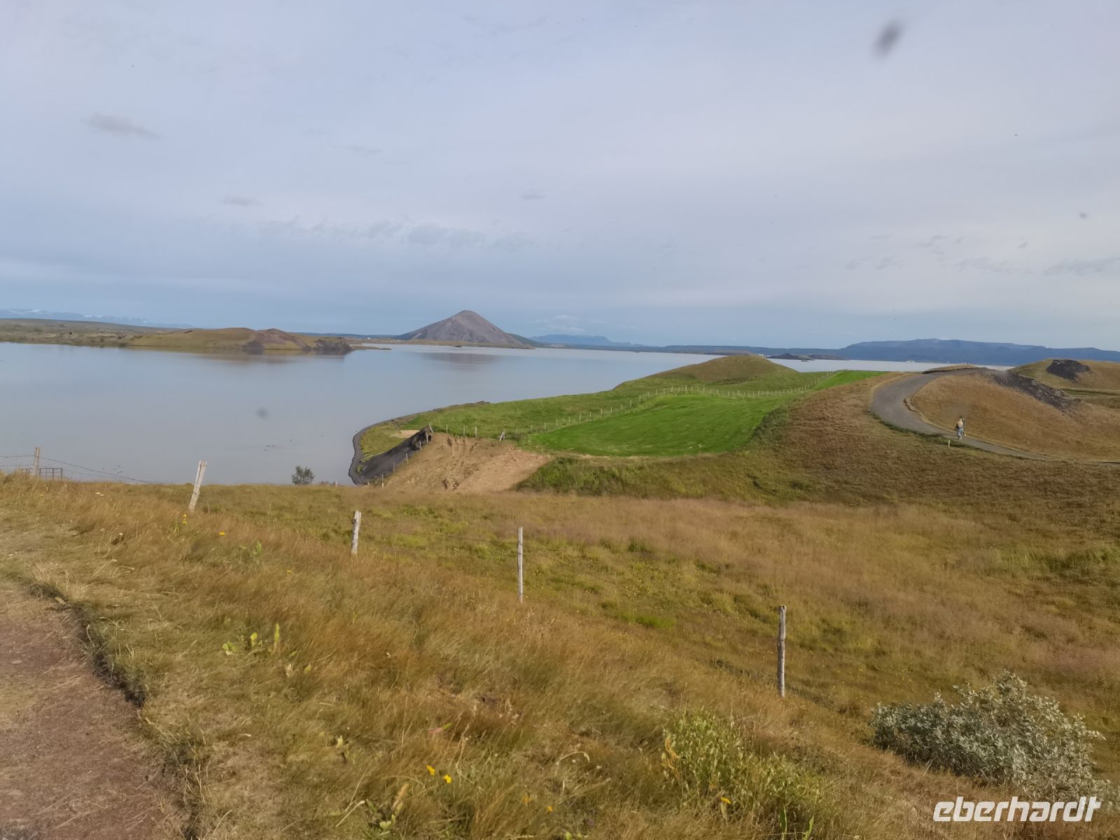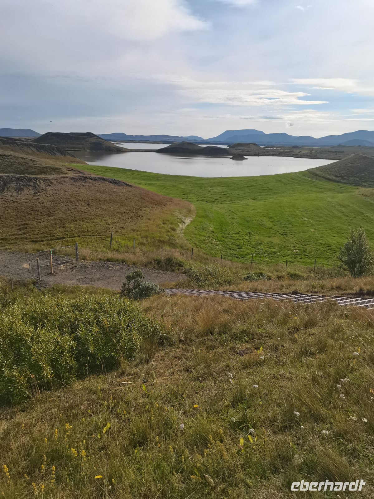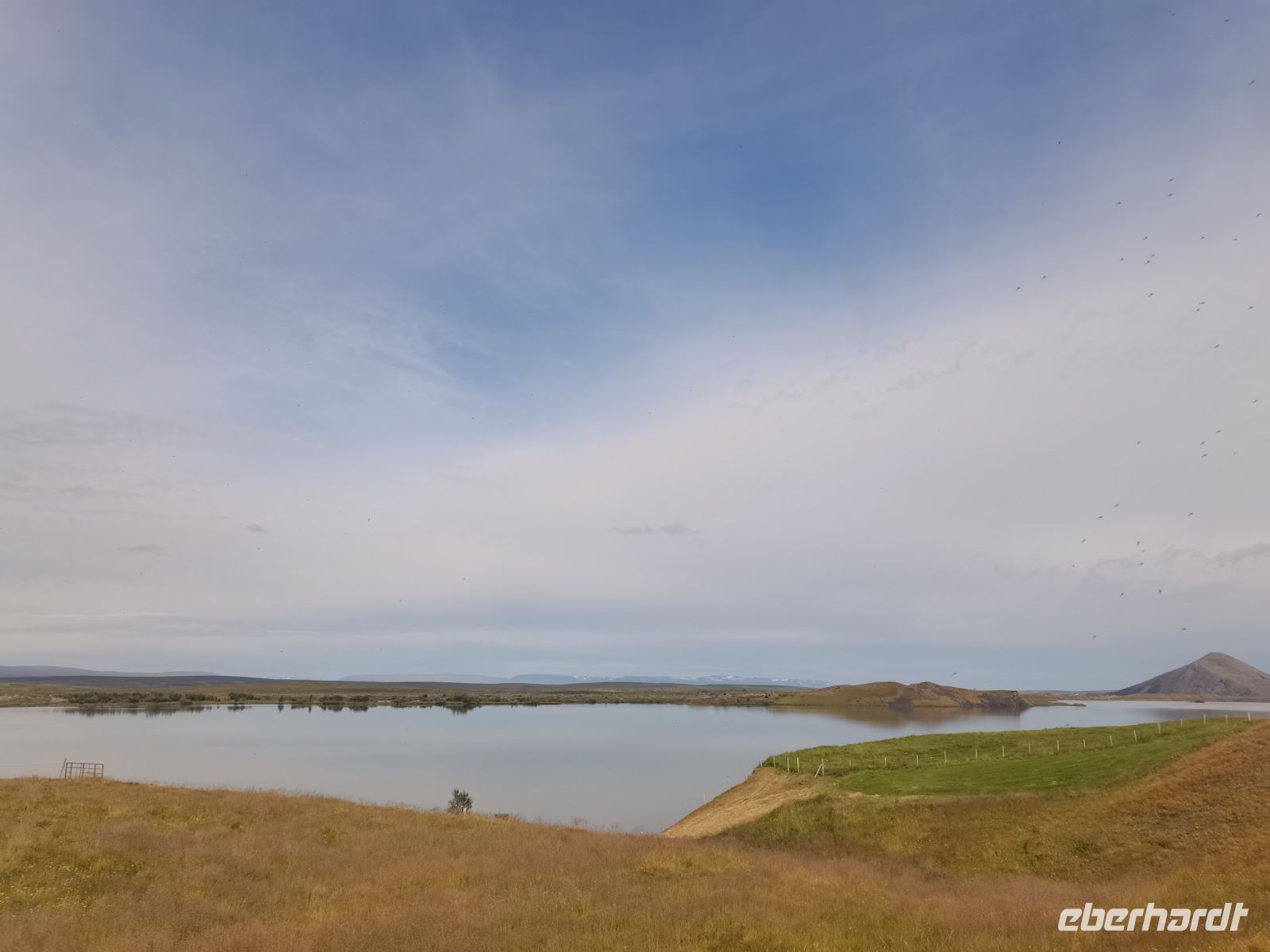 Heute verlassen wir die schöne Stadt Akureyri. Auf dem Programm steht ein Spaziergang am Mückensee im Myvatn-Gebiet mit seinen besonderen "Pseudokratern", kleine kraterähnliche Berge, die sich über das Seenland erstrecken. Entstanden sind sie, als vor Jahrtausenden Lavaströme in den See flossen und kleine Gasexplosionen verursachten. Tatsächlich ist dieser See der viertgrößte in Island und bietet eine interessante Flora und reiche Vogelwelt. Die herumfliegenden Mückenschwärme machen sich sofort beim Parken bemerkbar. Was uns vielleicht ein wenig nervt, bildet jedoch die Nahrungsgrundlage für Fische und zahlreiche Vögel. Der Mückensee ist das größte Brutgebiet für Enten in Island. Aber auch zahlreiche andere Vogelarten brüten in der Umgebung des Sees, was dieses Naturschutzgebiet besonders wertvoll macht.