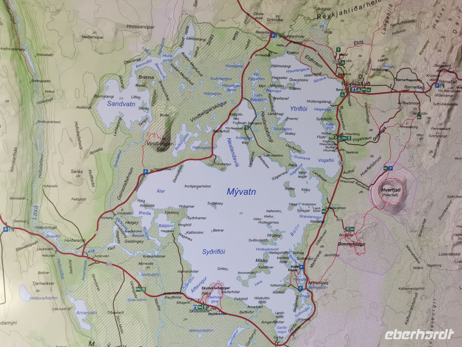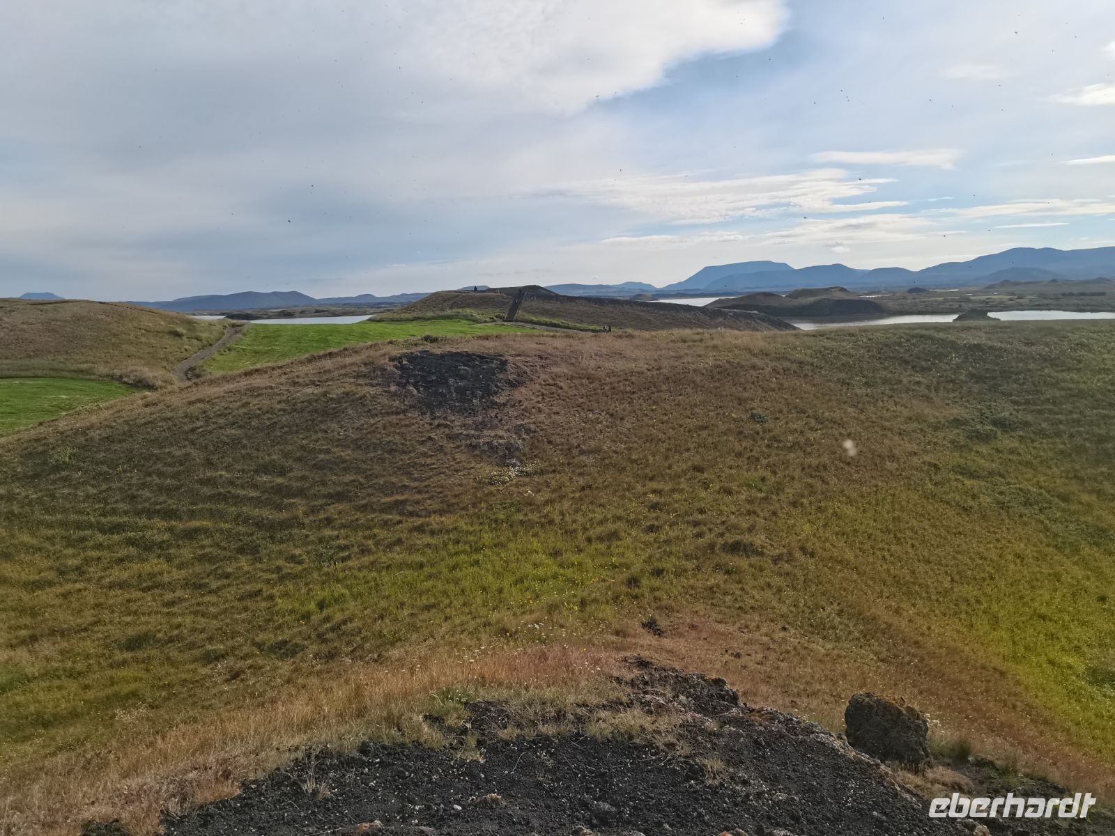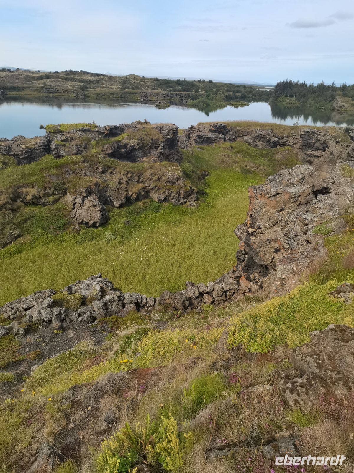 Heute verlassen wir die schöne Stadt Akureyri. Auf dem Programm steht ein Spaziergang am Mückensee im Myvatn-Gebiet mit seinen besonderen "Pseudokratern", kleine kraterähnliche Berge, die sich über das Seenland erstrecken. Entstanden sind sie, als vor Jahrtausenden Lavaströme in den See flossen und kleine Gasexplosionen verursachten. Tatsächlich ist dieser See der viertgrößte in Island und bietet eine interessante Flora und reiche Vogelwelt. Die herumfliegenden Mückenschwärme machen sich sofort beim Parken bemerkbar. Was uns vielleicht ein wenig nervt, bildet jedoch die Nahrungsgrundlage für Fische und zahlreiche Vögel. Der Mückensee ist das größte Brutgebiet für Enten in Island. Aber auch zahlreiche andere Vogelarten brüten in der Umgebung des Sees, was dieses Naturschutzgebiet besonders wertvoll macht.
