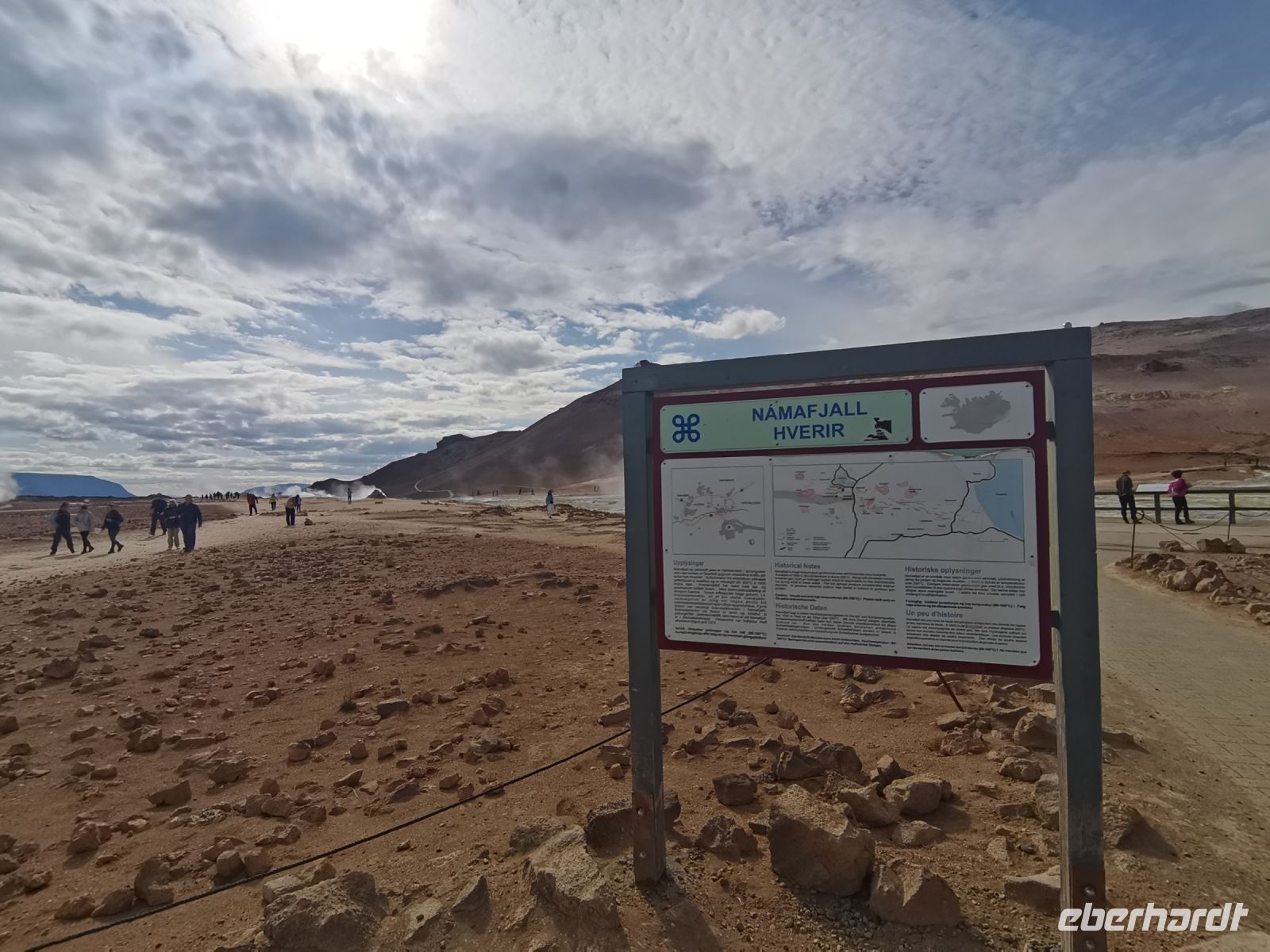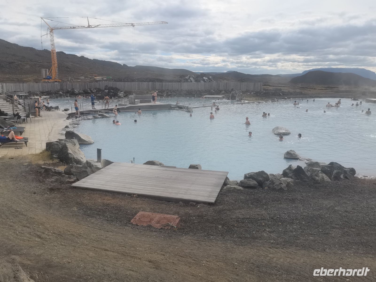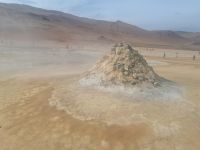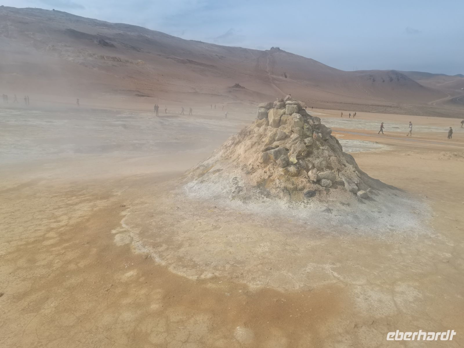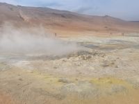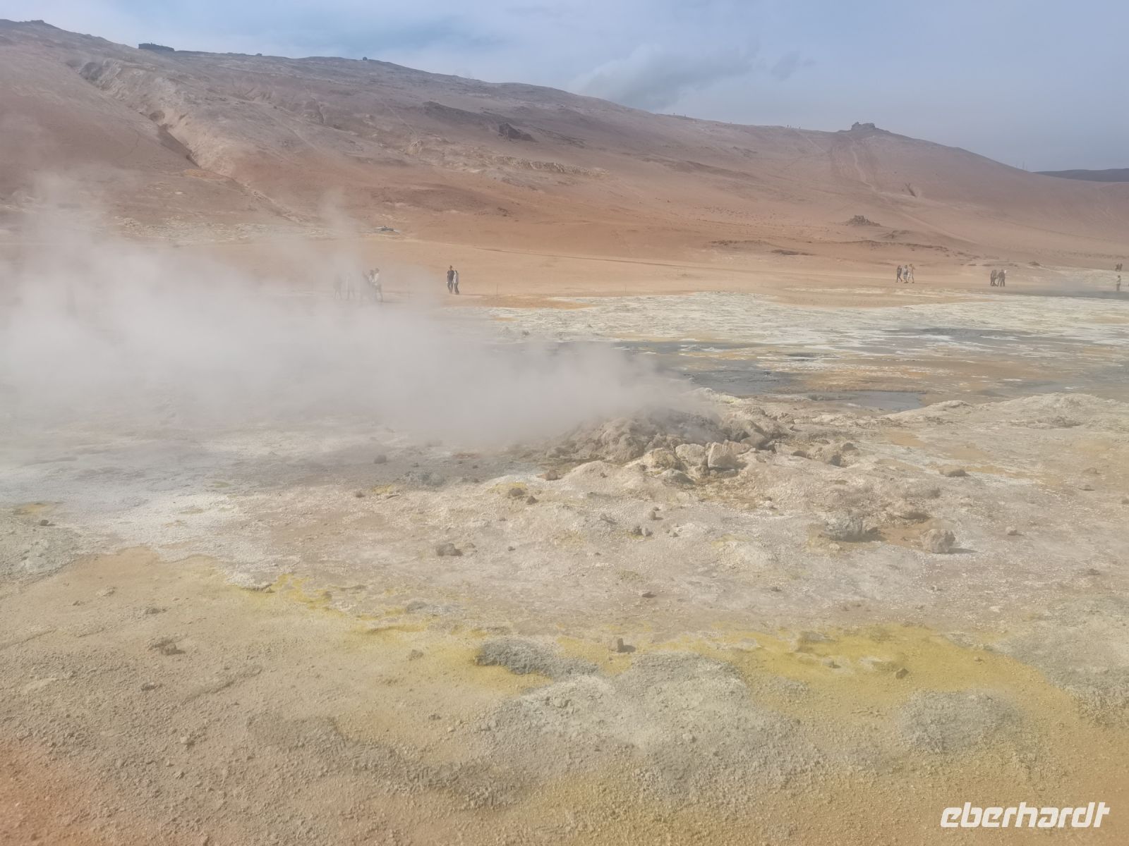 Nach diesem besonderen Spaziergang erwartet uns in die Lagune mit Thermalwasser, ein Naturbad der besonderen Art. Wir entspannen in den Dampfbädern und genießen die faszinierende umliegende Landschaft. Ein tolles Erlebnis, das sich unvergesslich in die Erinnerung einprägen wird. Das Restaurant im Naturbad stärkt uns für das weitere Programm, denn in Myvatn gibt es noch weitere Highlights zu entdecken: Dazu gehören die Schwefelfelder von Námaskarð, gleich um die Ecke der heißen Quellen der Lagune. Zu Fuß durchqueren wir das Solfatarenfeld, in dem es aus den Quellen blubbert, zischt und qualmt. Schwefel und andere Materialien machen die Gegend zu einer gelb, rot und weiß gefärbten Hexenküche.