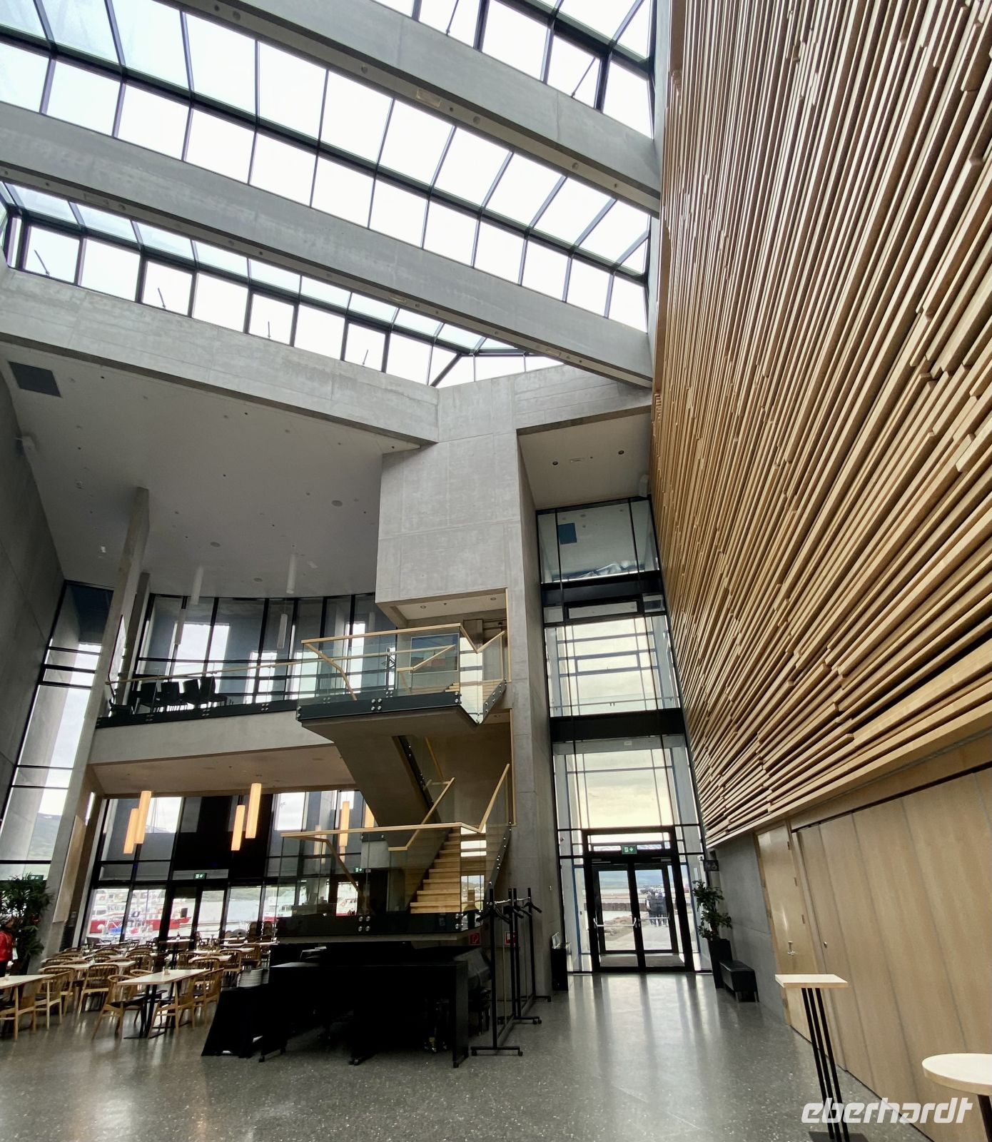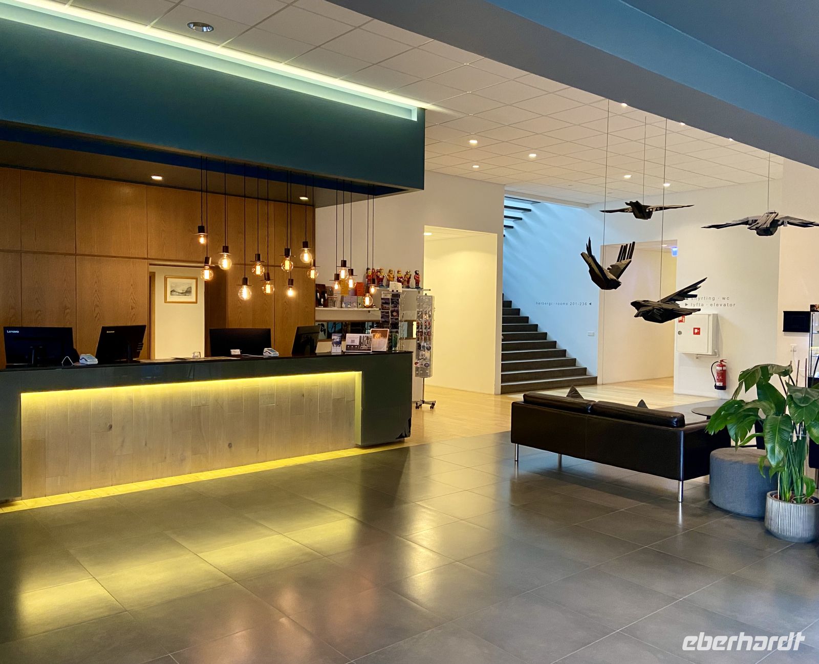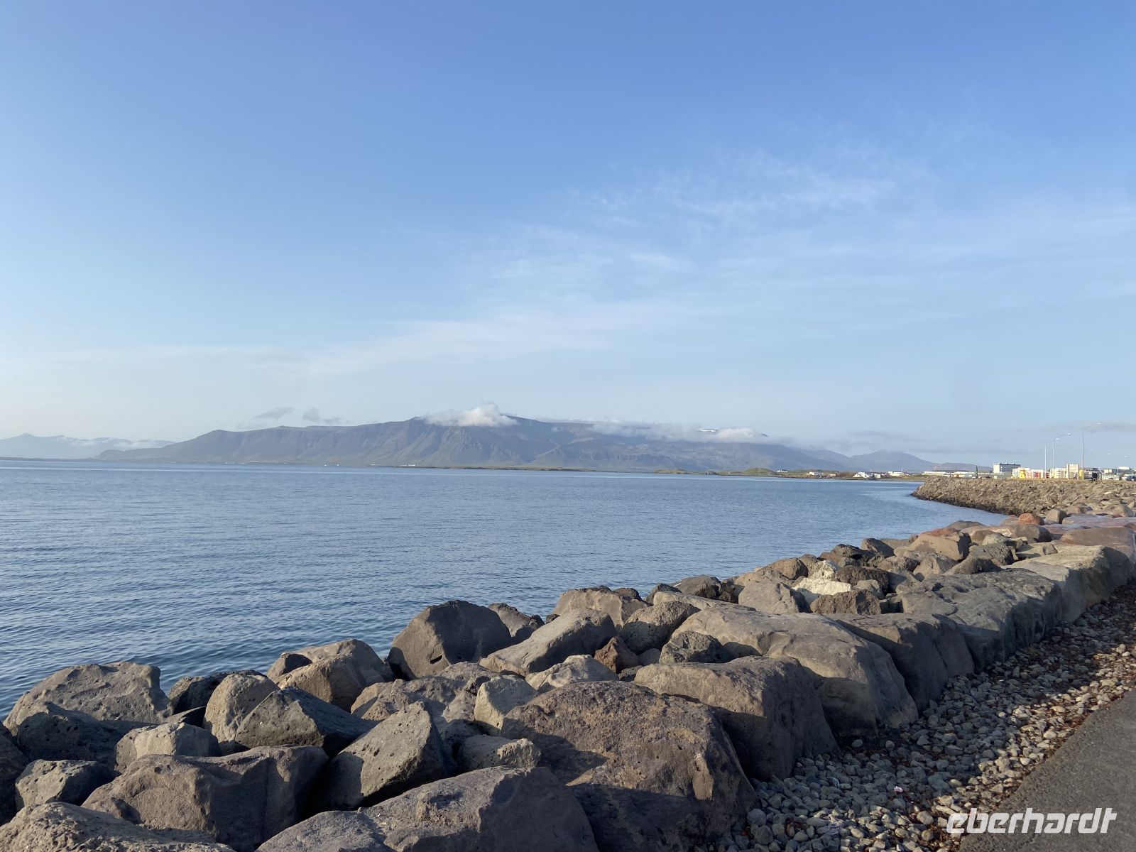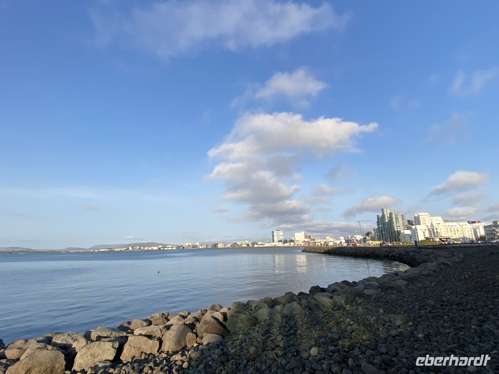 Auf dem kurzen Weg zum Bus haben wir Gelegenheit, uns mit den frischen Temperaturen (12 Grad) anzufreunden. Nach ca. 40 Busminuten erreichen wir die Hauptstadt Reykjavik, das Fosshotel Lind empfängt uns. Wir beziehen unsere Zimmer und genießen das wunderbare weiß-gelbe Licht, das durch die,Fenster leuchtet. Dann treffen wir uns in der Lobby, um gemeinsam zum Restaurant Loa zu bummeln. Wir stärken uns beim Abend-Buffet und nutzen die abendliche Runde zum gemütlichen Plaudern. Danach lockt das Licht uns noch zu einem kleinen Spaziergang auf der Hafenpromenade, bis wir recht müde und zufrieden zum Hotel zurückkehren.