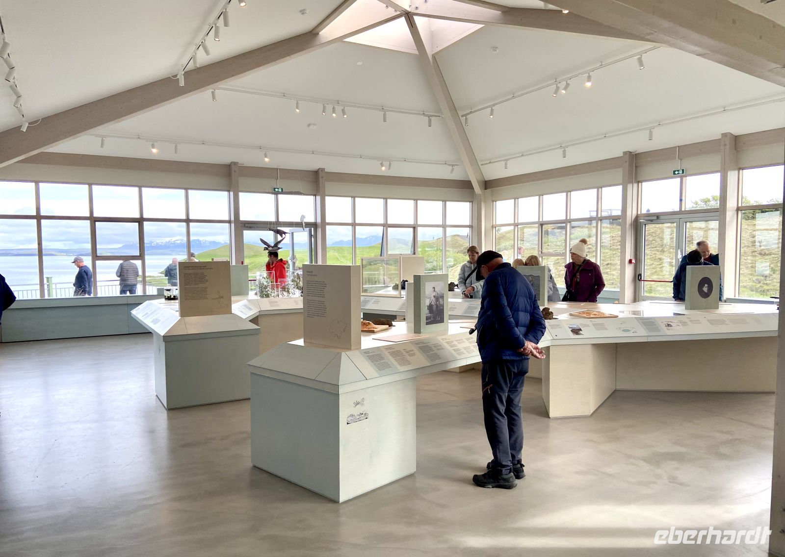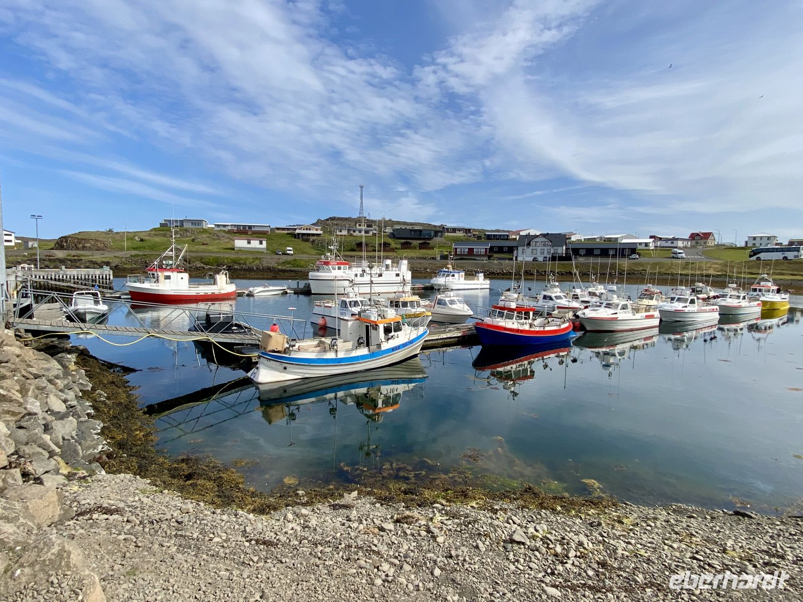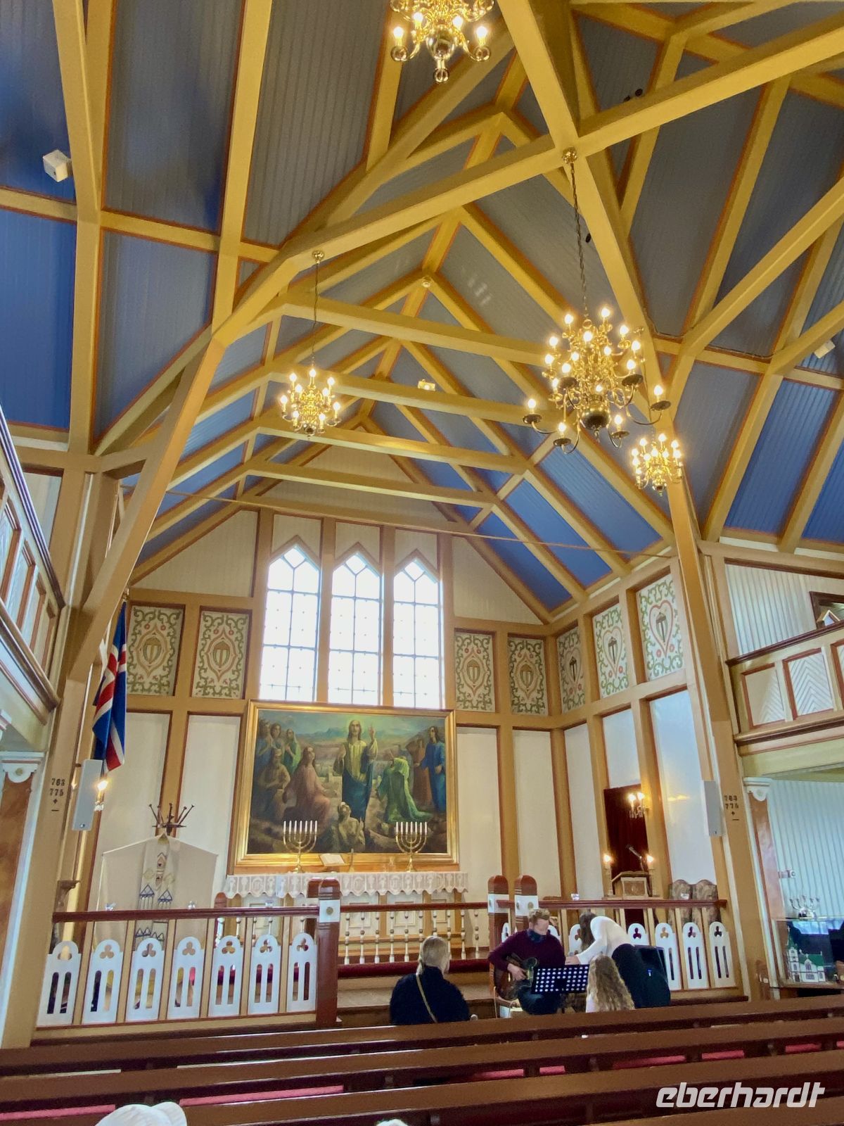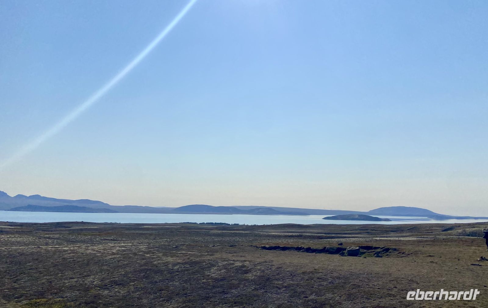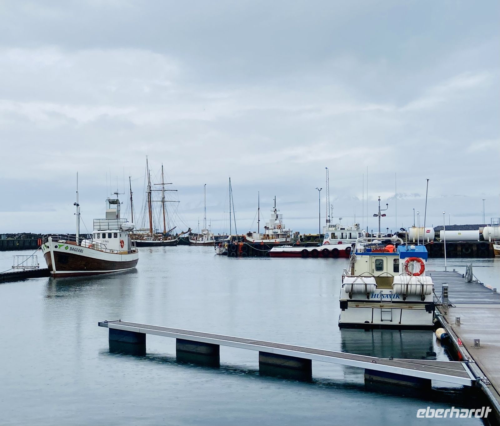 Auf der Halbinsel Tjörnes besuchen wir zuerst den kleinen Fischerort Husavik. Wir schauen kurz im Walmuseum vorbei, bummeln durch den Hafen und besuchen die Kirche. Der Name der Stadt geht auf den Schweden Garðar Svavarsson zurück, der einige Jahre vor Ingólfur Árnarson unfreiwillig nach Island kam, weil er sich verirrt hatte. Er versuchte wohl, die Insel zu umrunden und wurde bei Húsavík vom Winter überrascht. Garðar war gezwungen, auf Island zu überwintern und errichtete einige Häuser (daher der Name Húsavík = Häuserbucht). Sehenswert ist in Húsavík neben dem Hafen und dem Heimatmuseum vor allem die 1907 eingeweihte Kirche. Das vom Architekten Rögnvaldur Ólafsson entworfene Gebäude wurde vollständig aus Holz gebaut, eigens aus Norwegen eingeführt. Die Kirche hat zwar keine Kanzel, aber dafür hat der Pfarrer einen wunderschönen Blick über die Bucht Skjálfandi auf die gegenüberliegenden Berge.